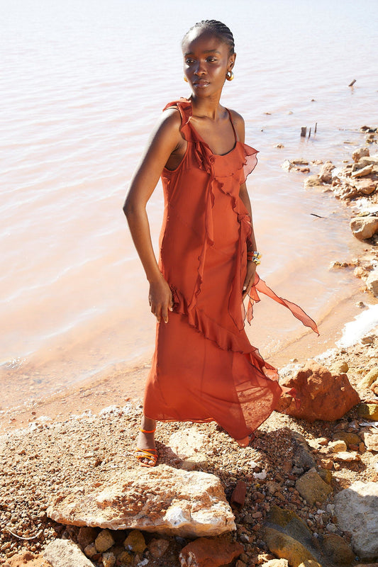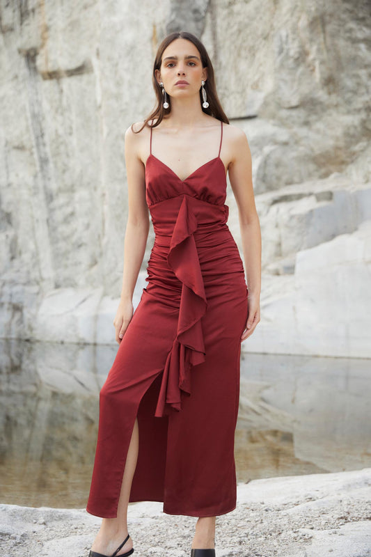 VESTIDO VOLANTE LARGO ROJOPrecio habitual €249,95Precio habitualPrecio unitario por-