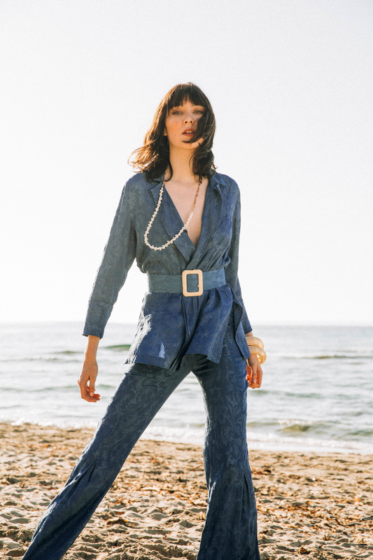JCQ BLUE EMBROIDERED PLEATED PANTS