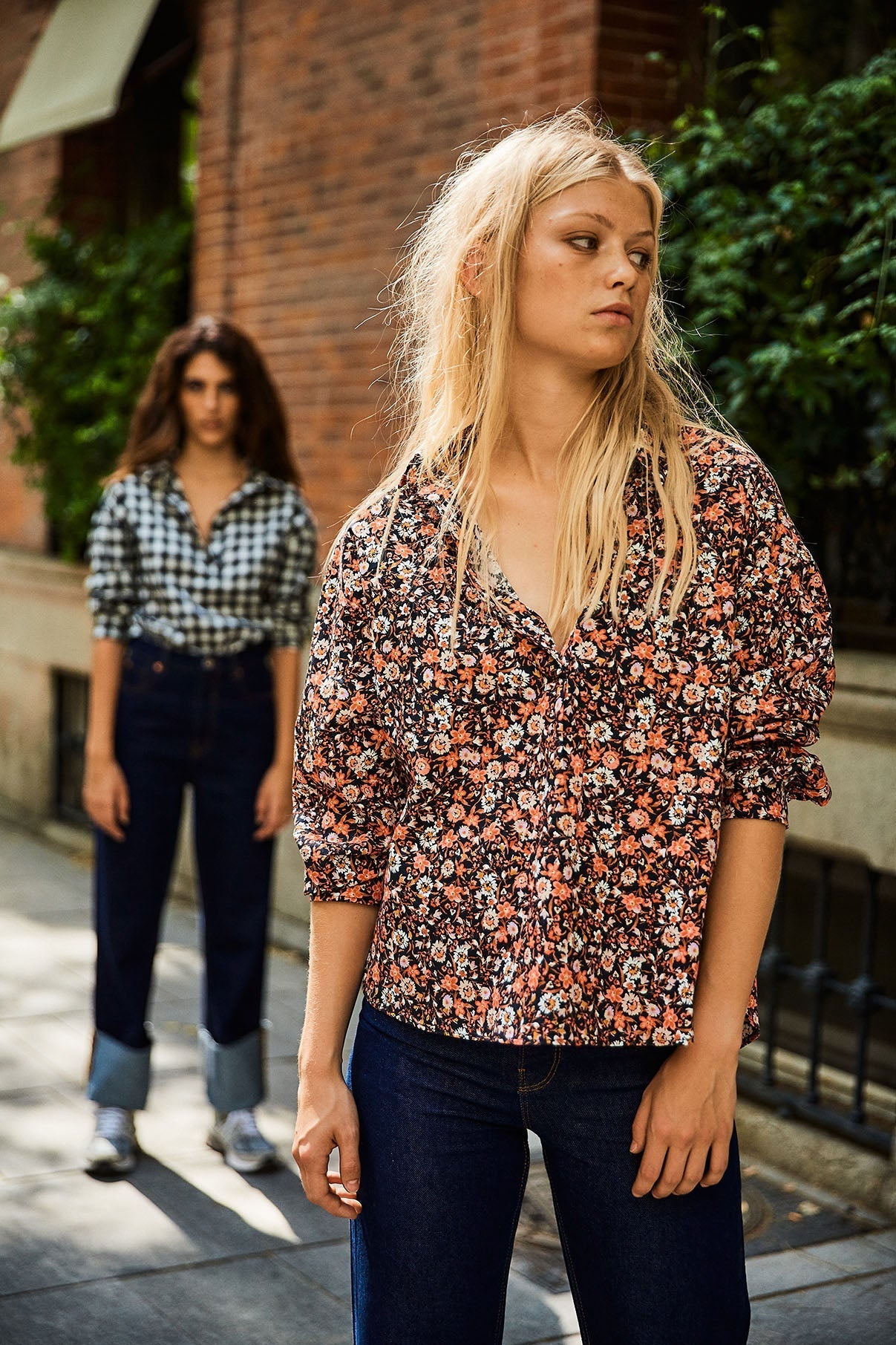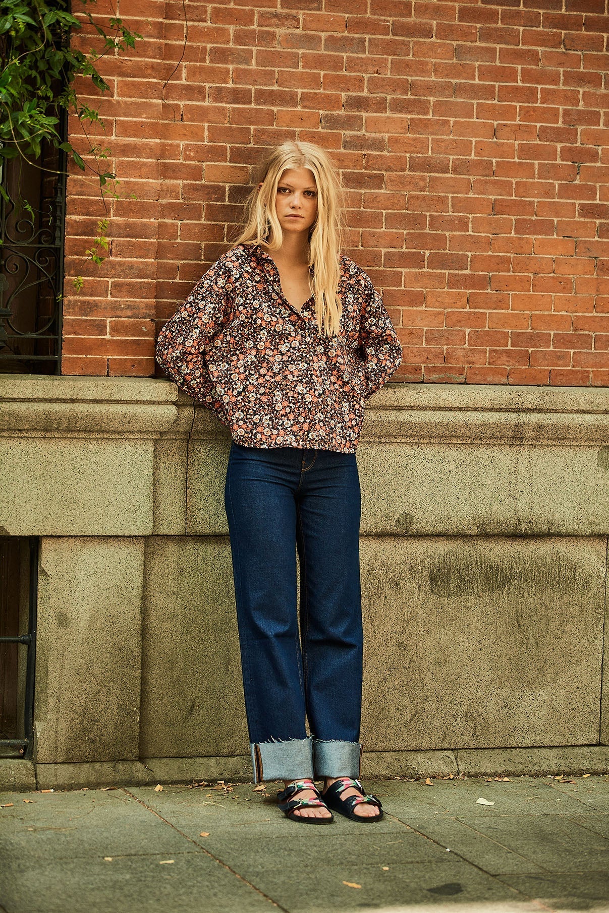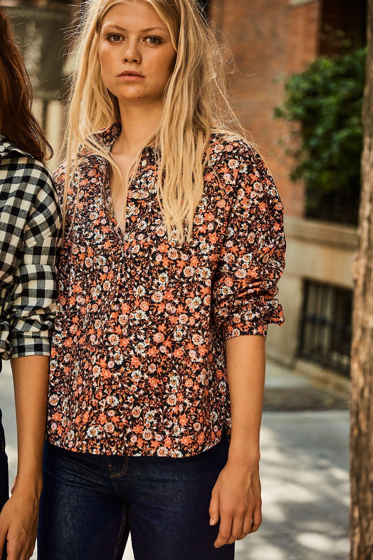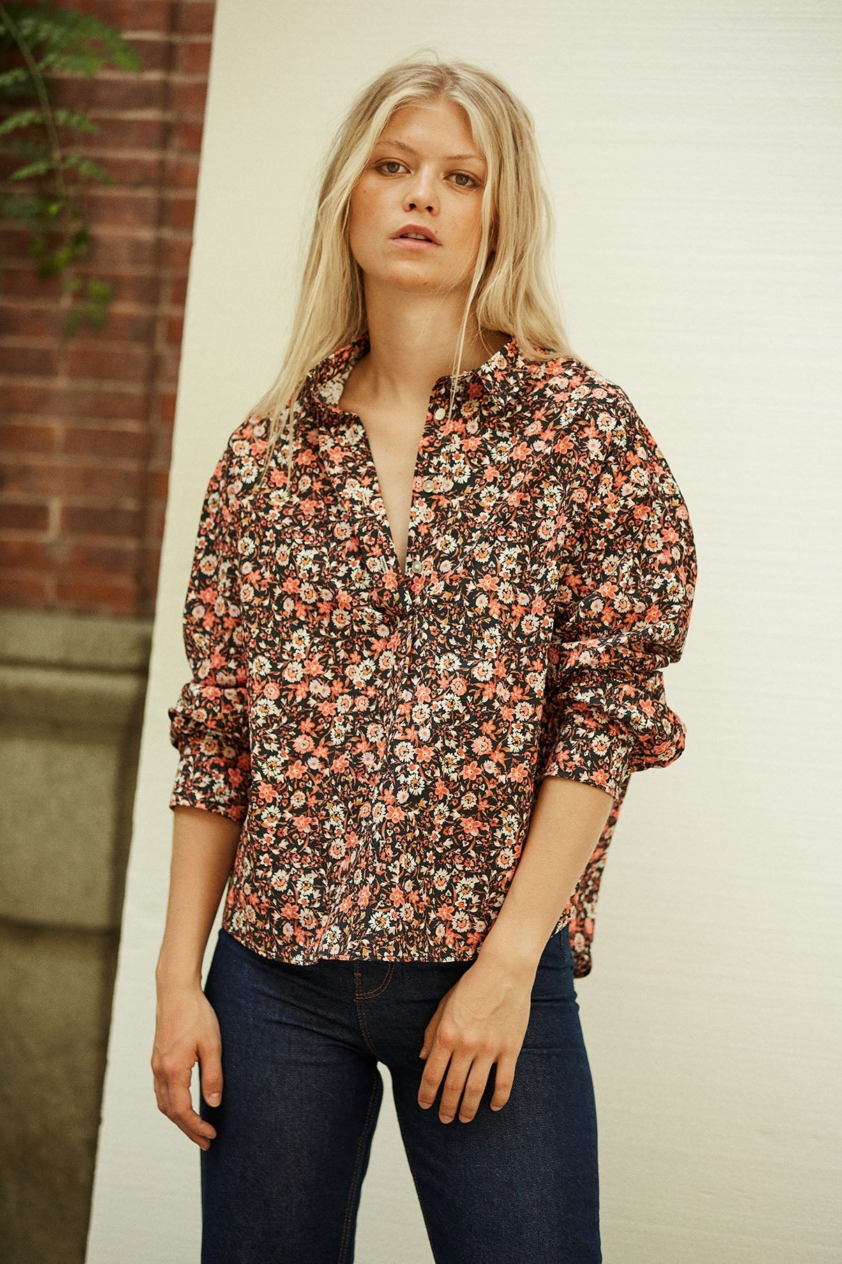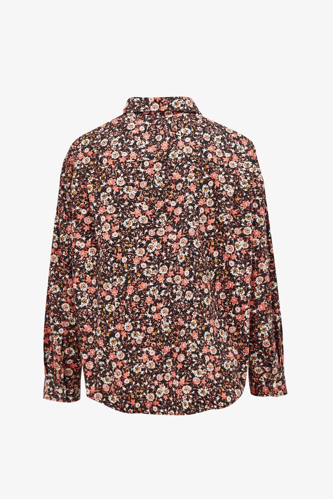 Polo shirt made of 100% cotton poplin with a floral print. This long-sleeved shirt with a dropped neckline has an oversized volume and is a little shorter in the front and falls in the back with a length of 63 to 68 cm. It is included in our first exclusive collection for our website.