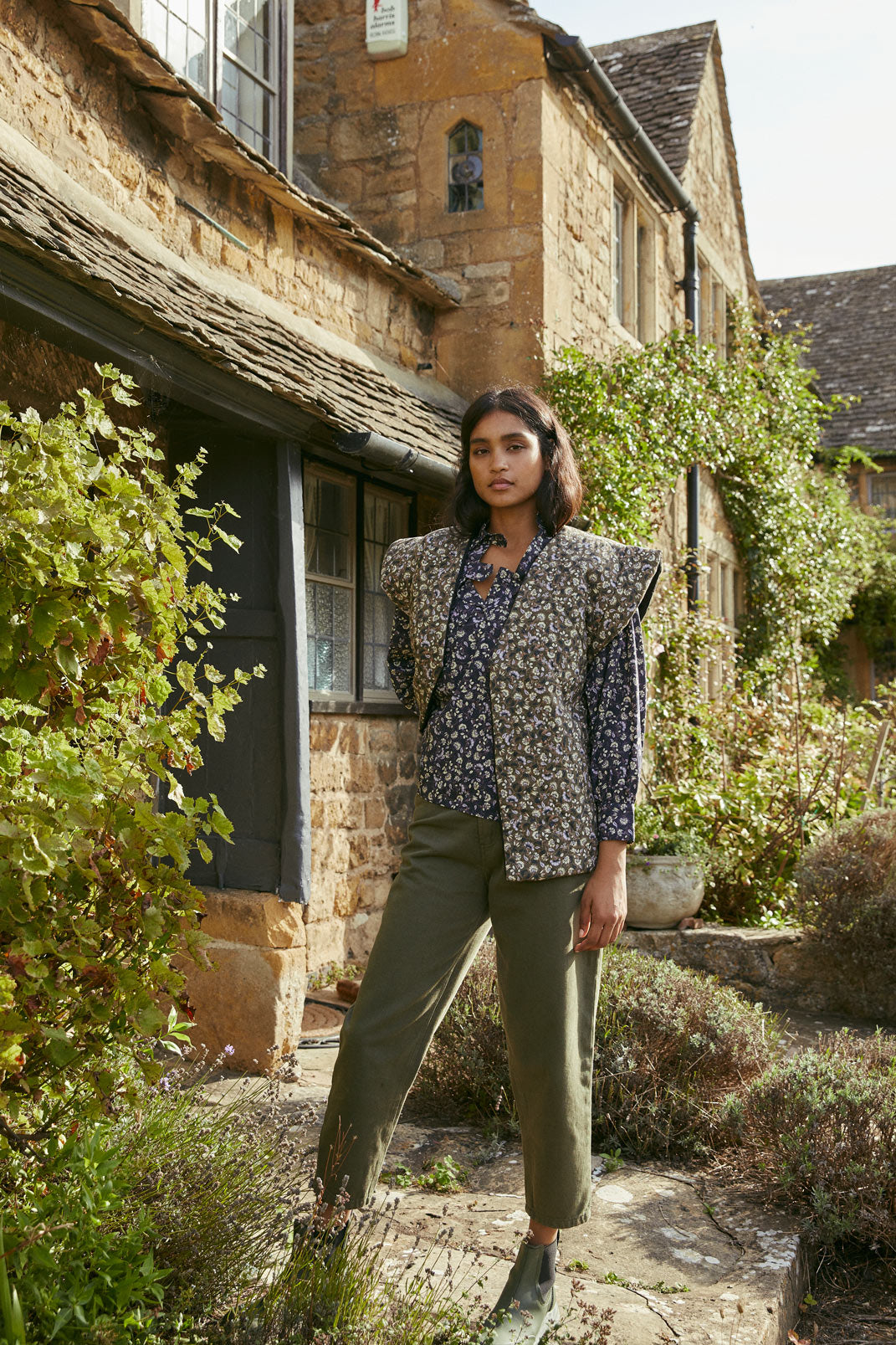 It is a quilted and reversible vest, with a floral print on one side and black poplin on the other. Dropped armholes and 70cm long. Fastens with a belt made of the same fabric.