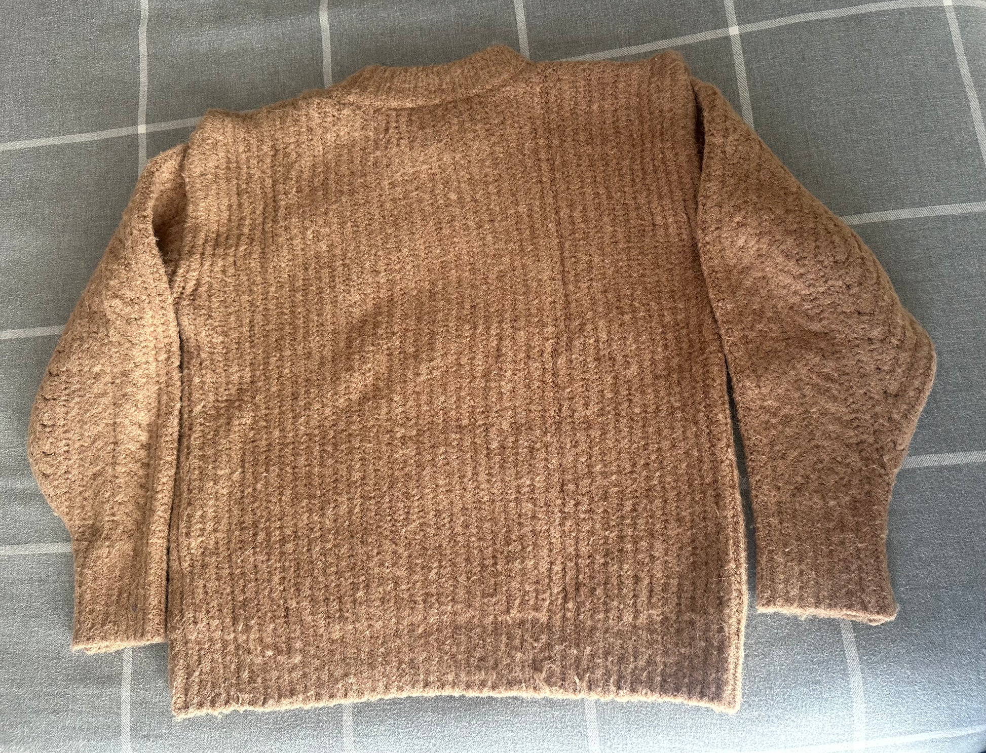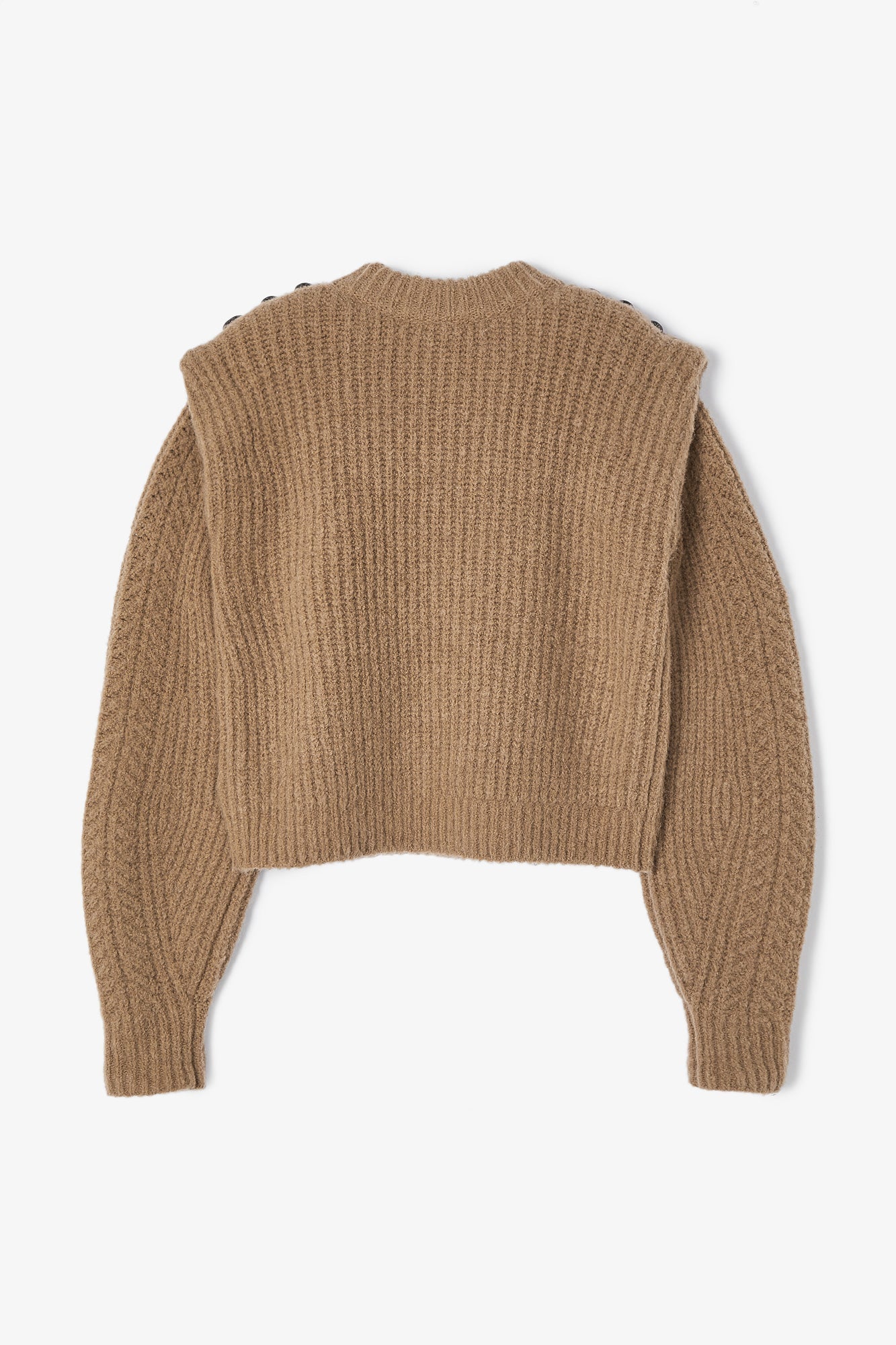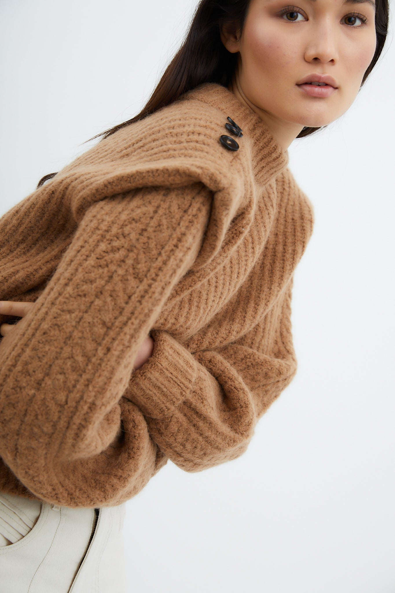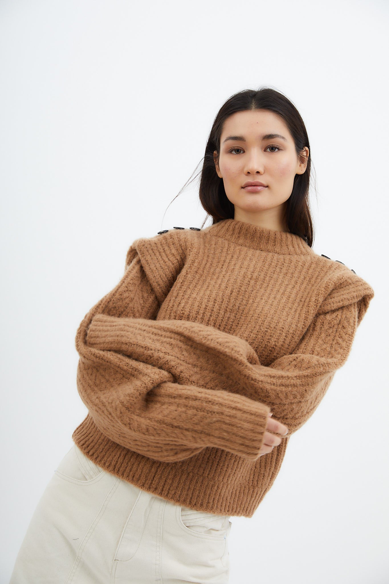 Caramel-coloured chunky knit sweater with three contrasting black button detail on the shoulders and double-height shoulder pad.