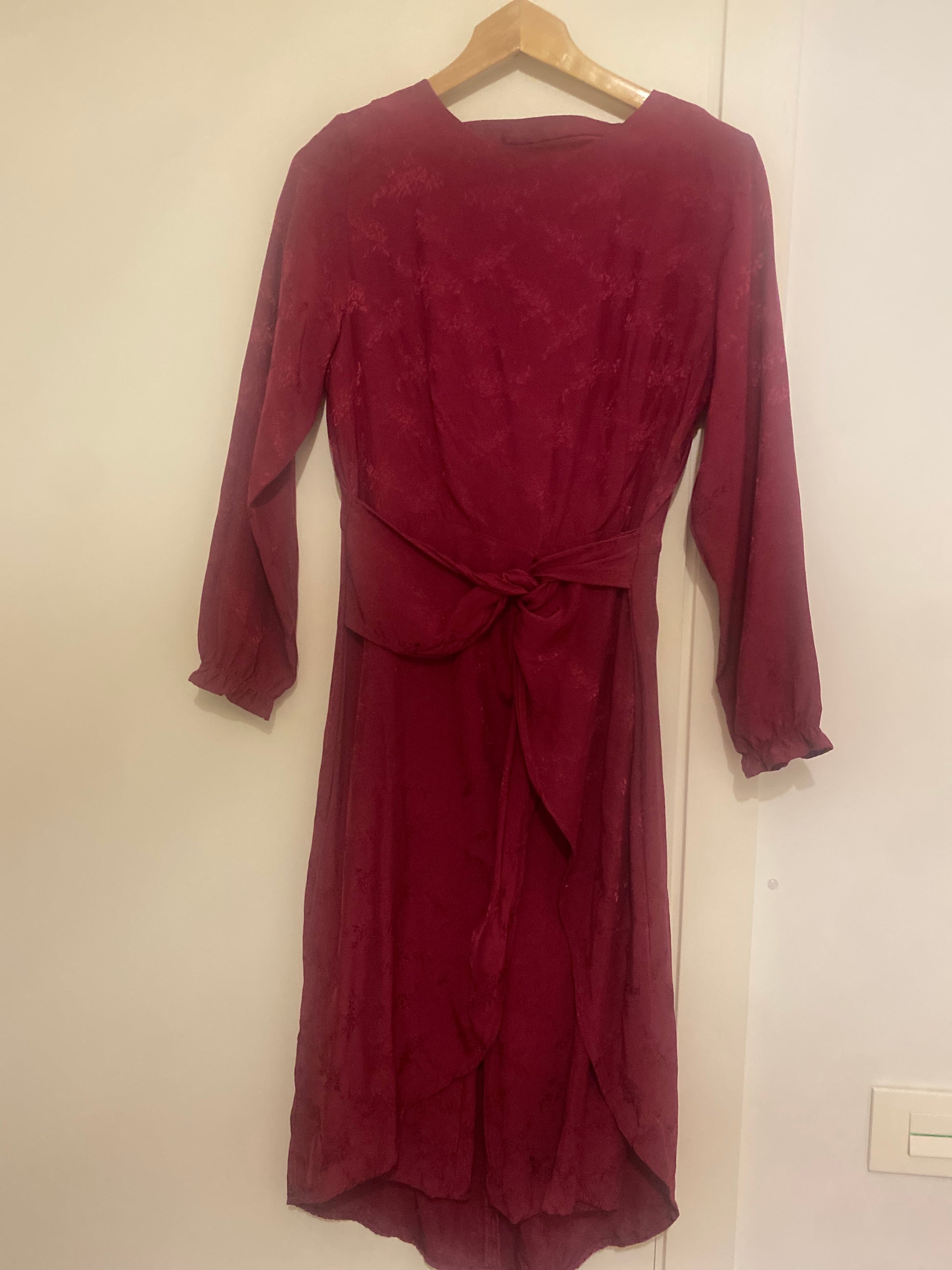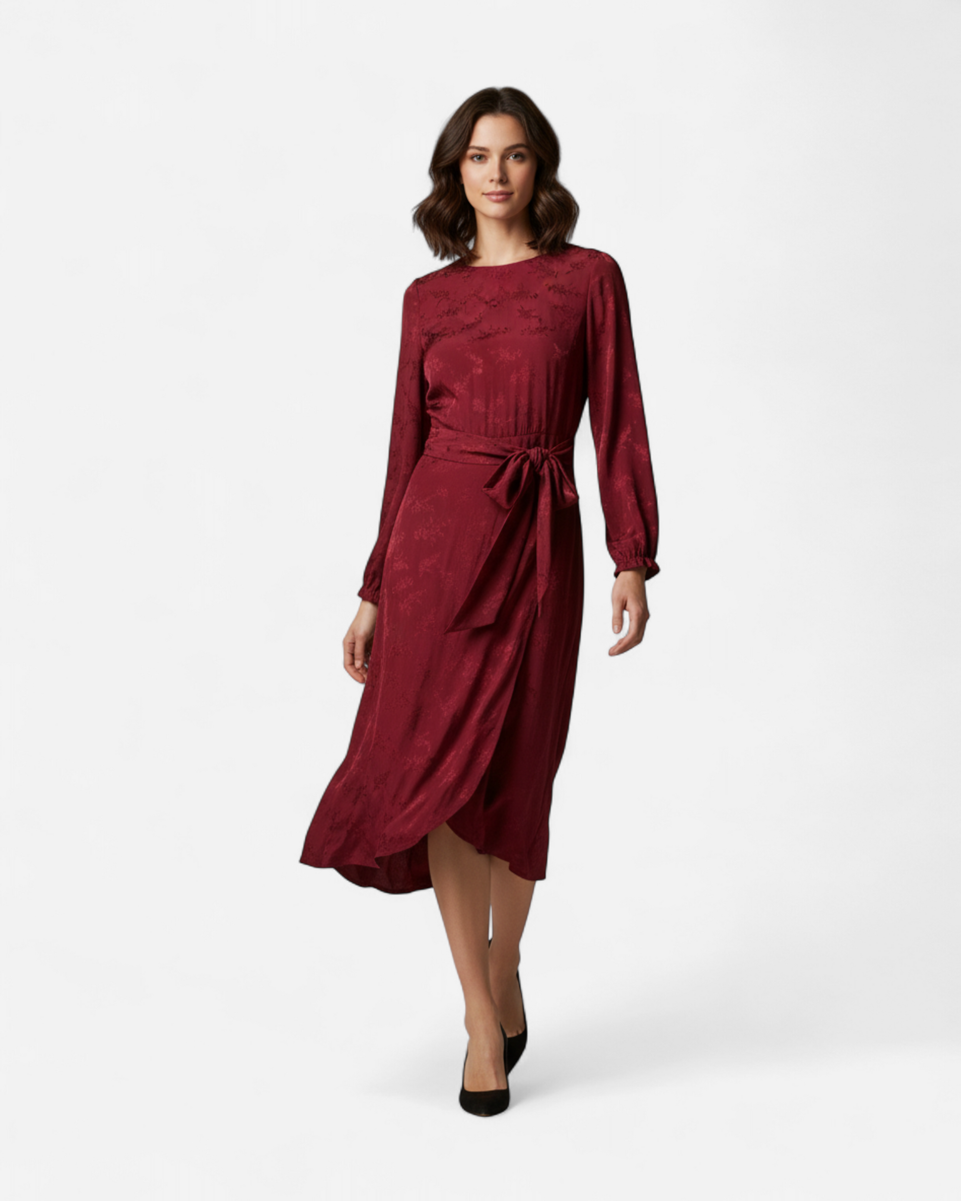 Let yourself be captivated by the timeless charm of this burgundy dress. Its flattering cut, delicately tied at the waist, elegantly enhances your silhouette. Made from a refined textured fabric, it offers both comfort and sophistication for your evenings and special events. Midi length, long sleeves with subtle gathers: a must-have in your wardrobe.