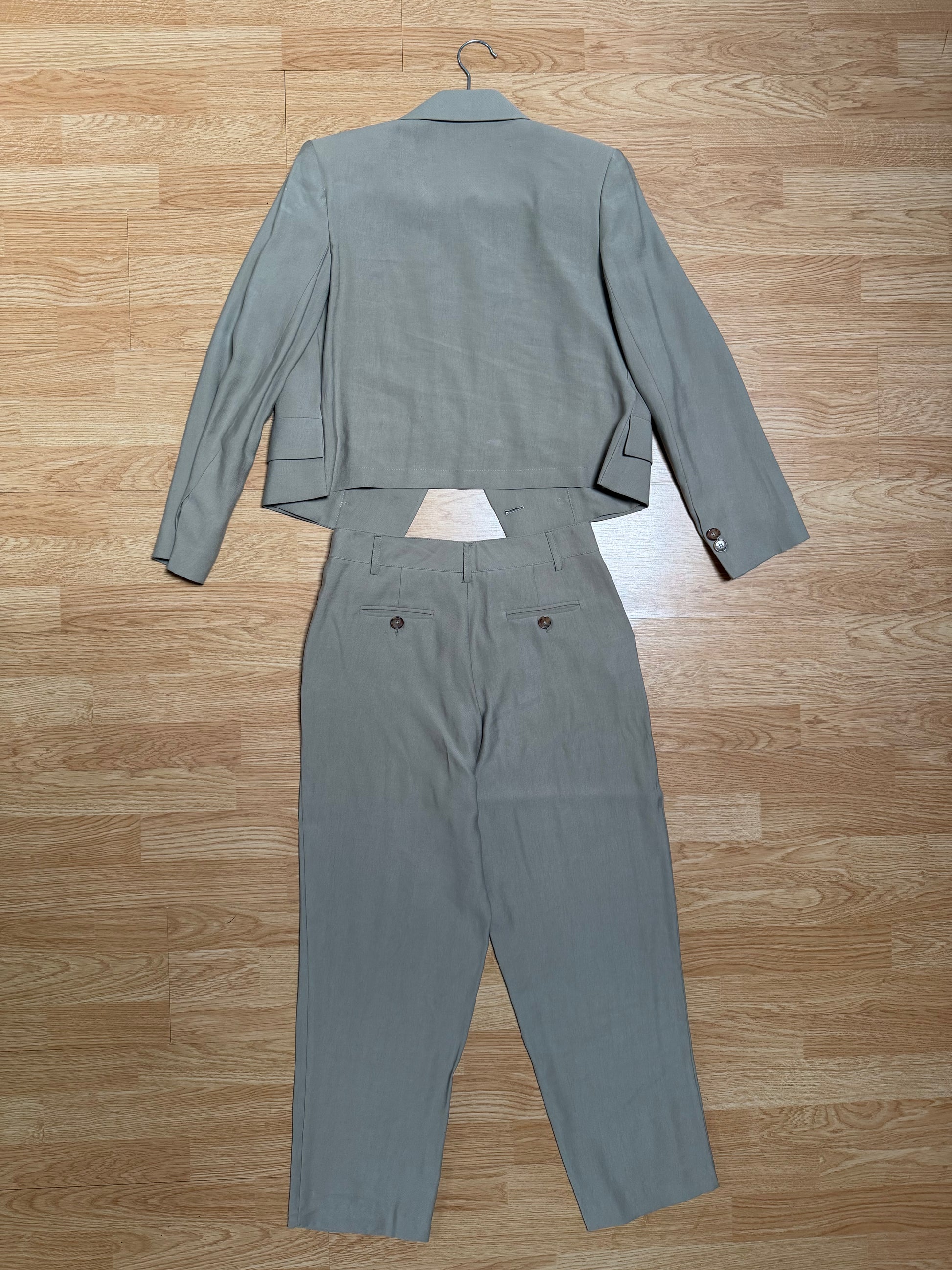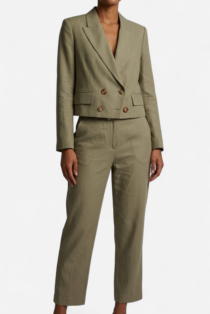 Elevate your style with this sophisticated cropped blazer and impeccably tailored pants set. Made from a lightweight, elegant sand-colored fabric, this versatile outfit will take you from day to night. The double-breasted blazer flatters your silhouette, while the pants provide both comfort and style. Perfect for a workday or a special evening.