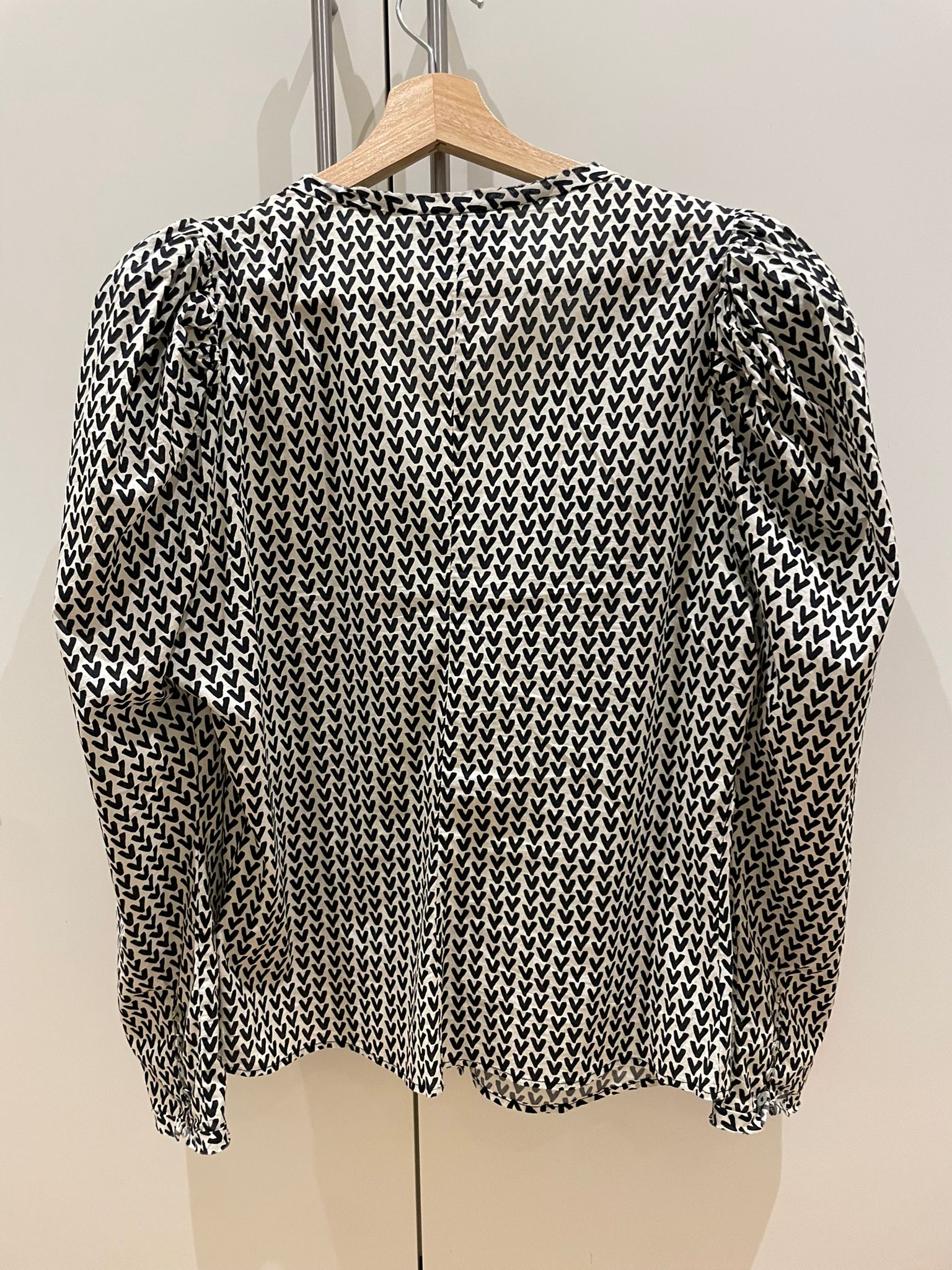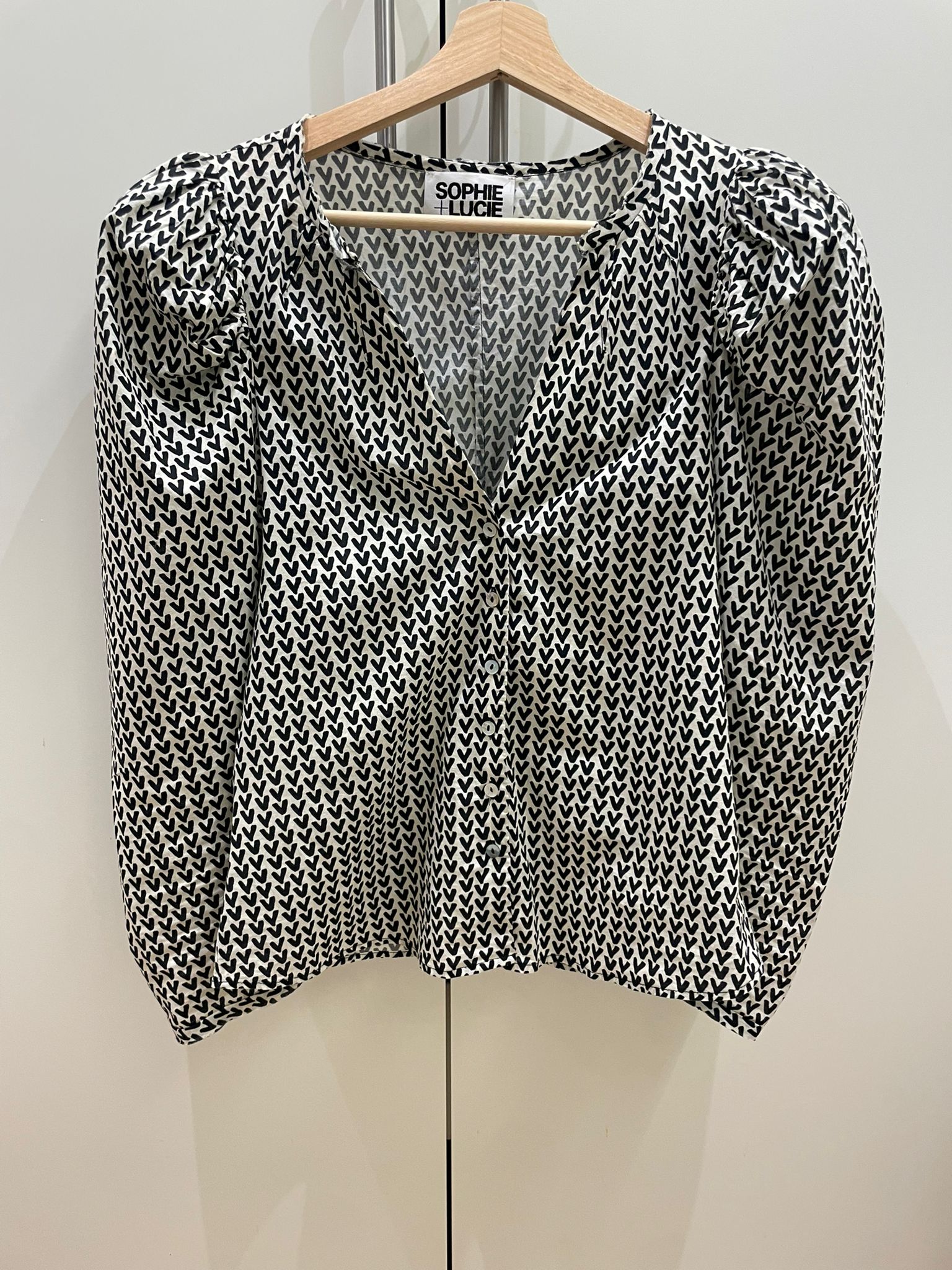 This soft satin blouse, featuring a delicate heart print and flattering puff sleeves, will make you feel special on any occasion. Its versatile black and white design is easy to pair for a casual chic look with jeans or to dress up with a skirt for an unforgettable night. Let your style speak for itself!