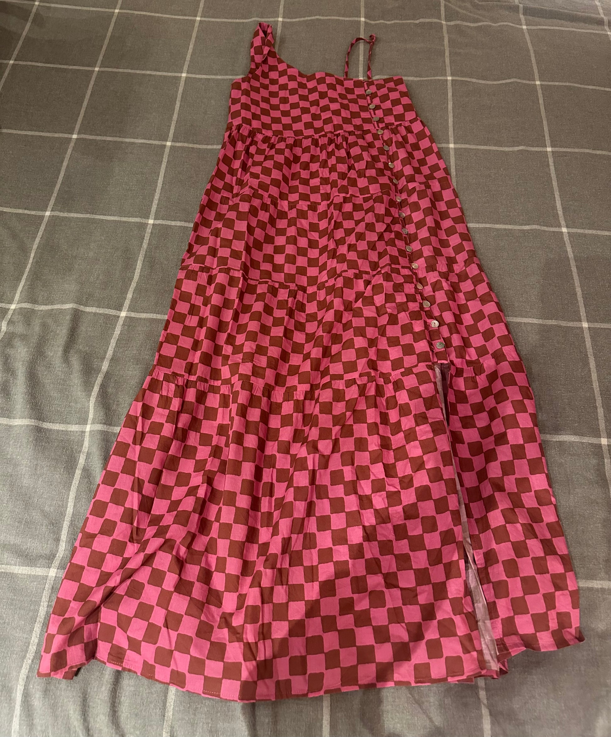 Feel the freedom of summer with this long strappy dress featuring a vibrant pink and brown checkered print. Made from a lightweight, flowing fabric, it offers both comfort and style. Its flattering silhouette and side slit let you enjoy the sun with elegance, whether at the beach or an outdoor dinner.