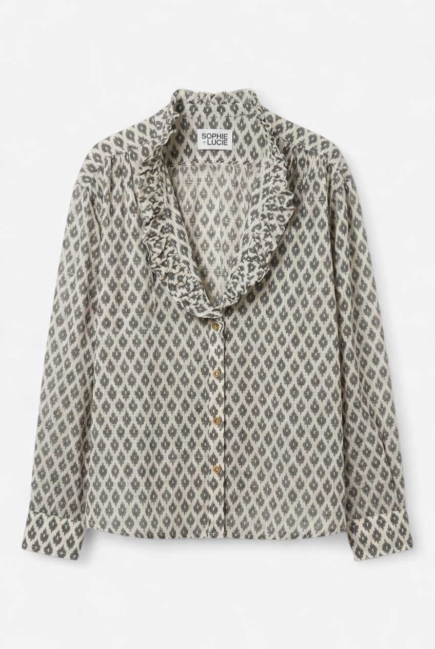 Add a bohemian touch to your wardrobe with this soft cotton blouse featuring a subtle print. Its ruffled neckline design brings a feminine and sophisticated vibe, perfect for pairing with your favorite jeans or a flowing skirt. Enjoy its comfort and versatility, ideal for everyday wear or a special occasion.