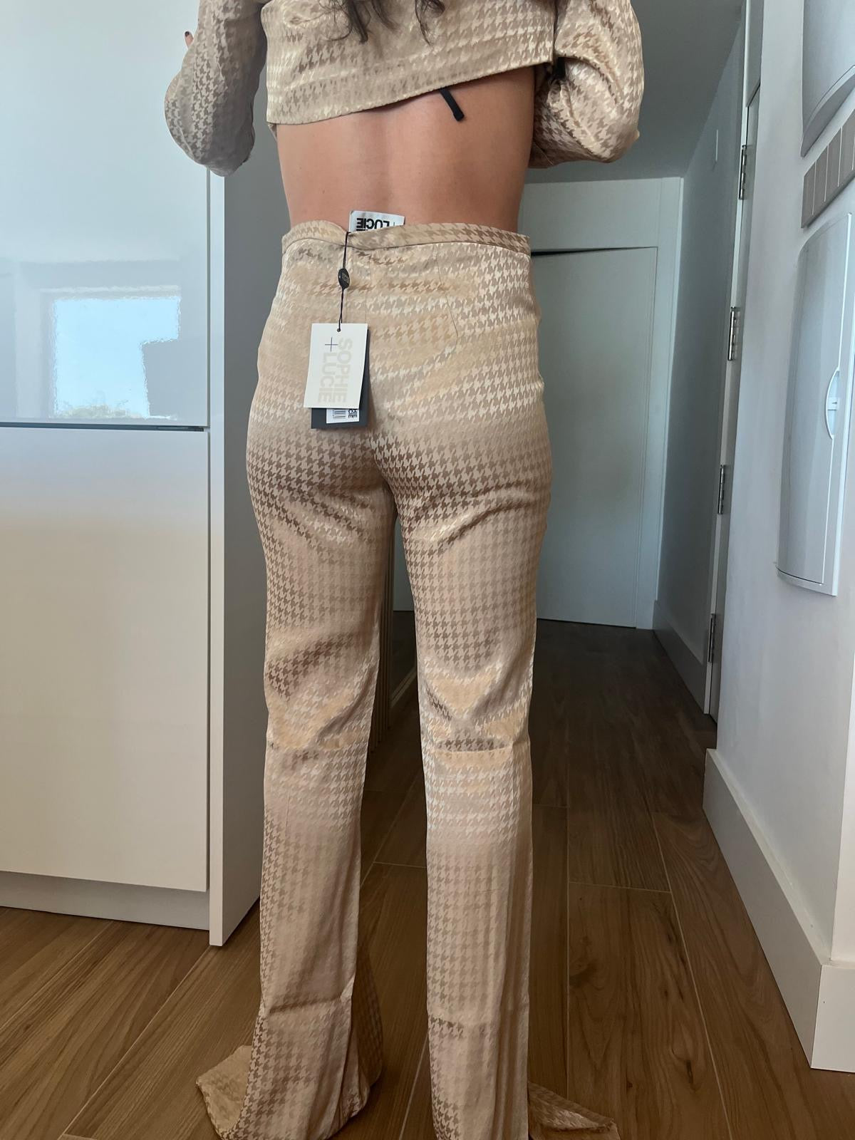 Our best-selling pants, made in a sand-toned houndstooth print. Flared pants with a central crease that elongates the legs and adds plenty of movement. Side closure with an invisible zipper and a structured waistband.