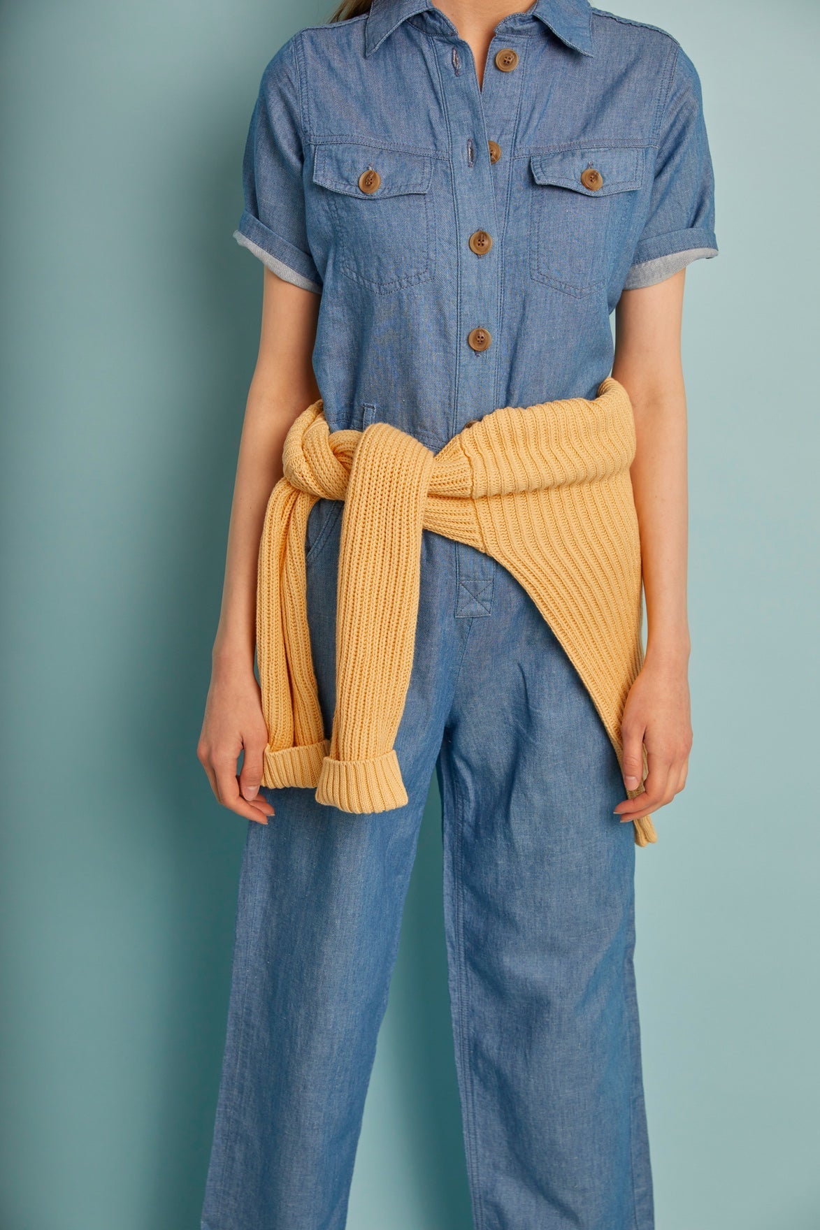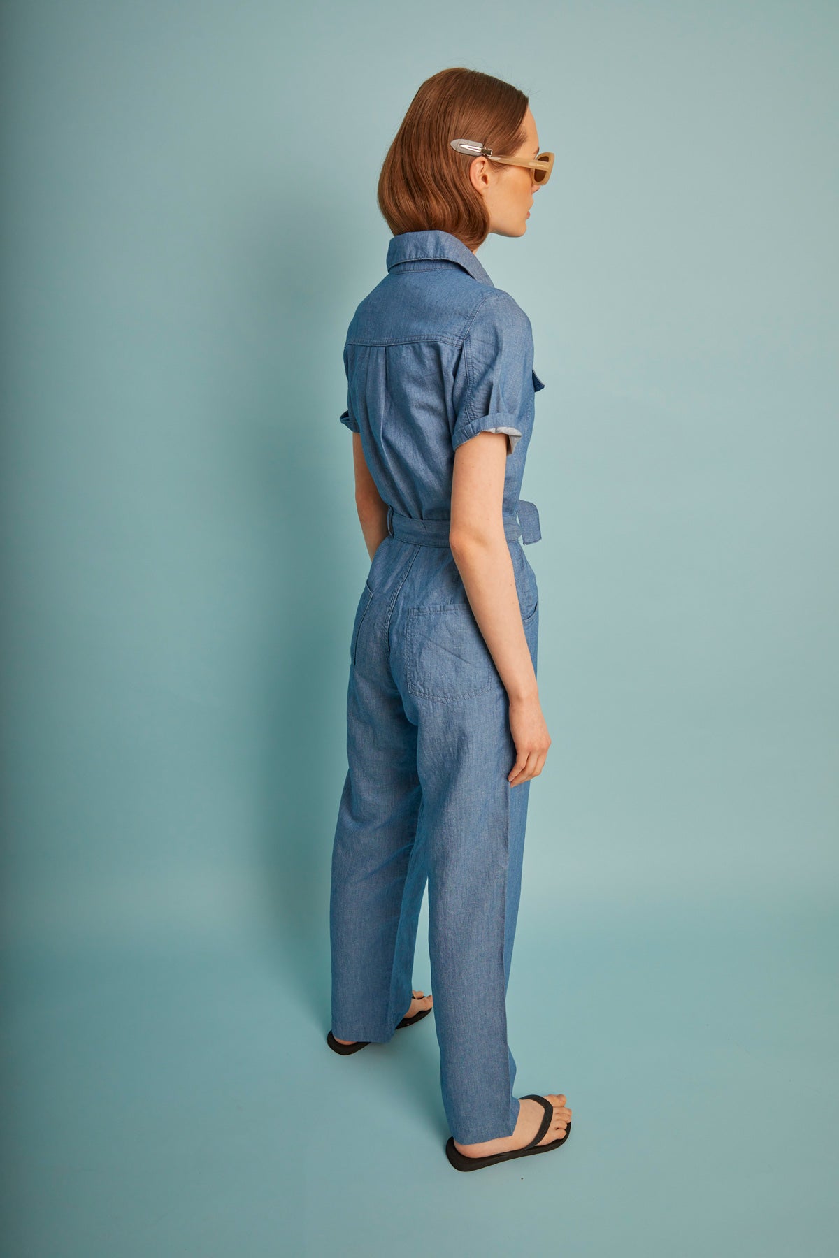 The Charlie jumpsuit is one of our essentials, made from denim-like fabric. It features a more fitted cut with wide legs, short sleeves, and central buttons. It also has two front pockets with buttons.