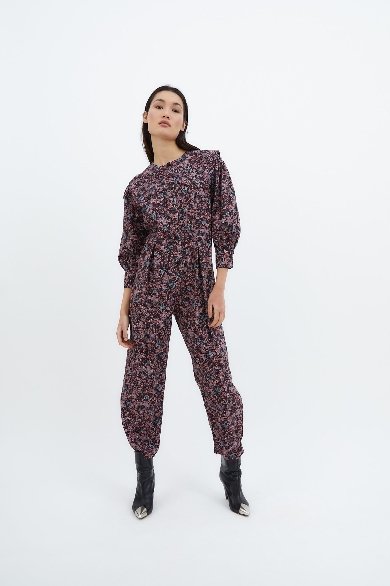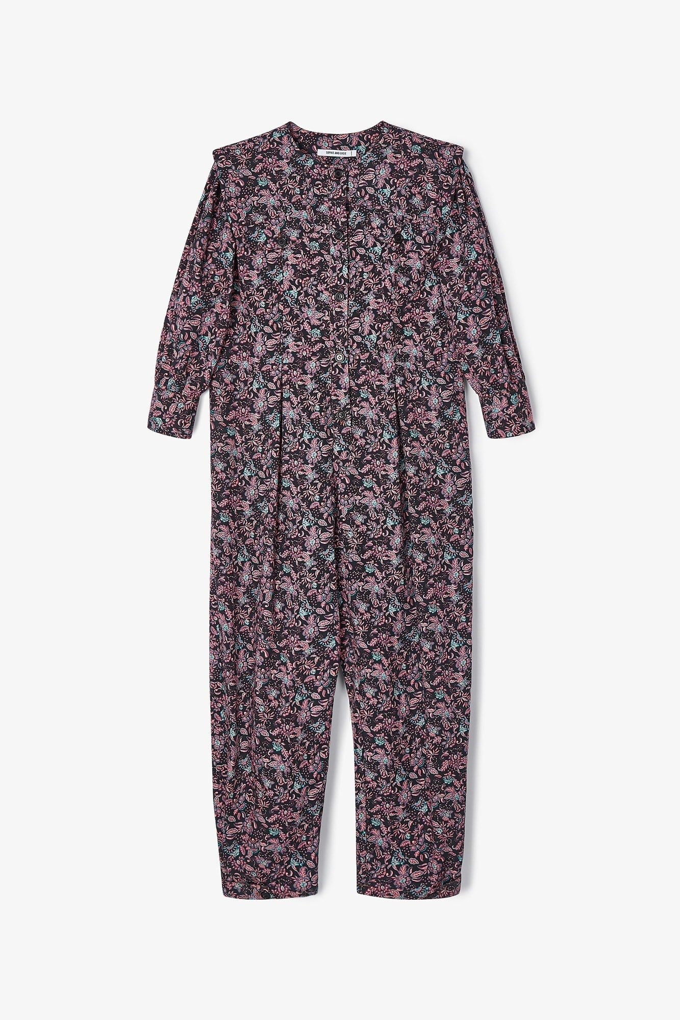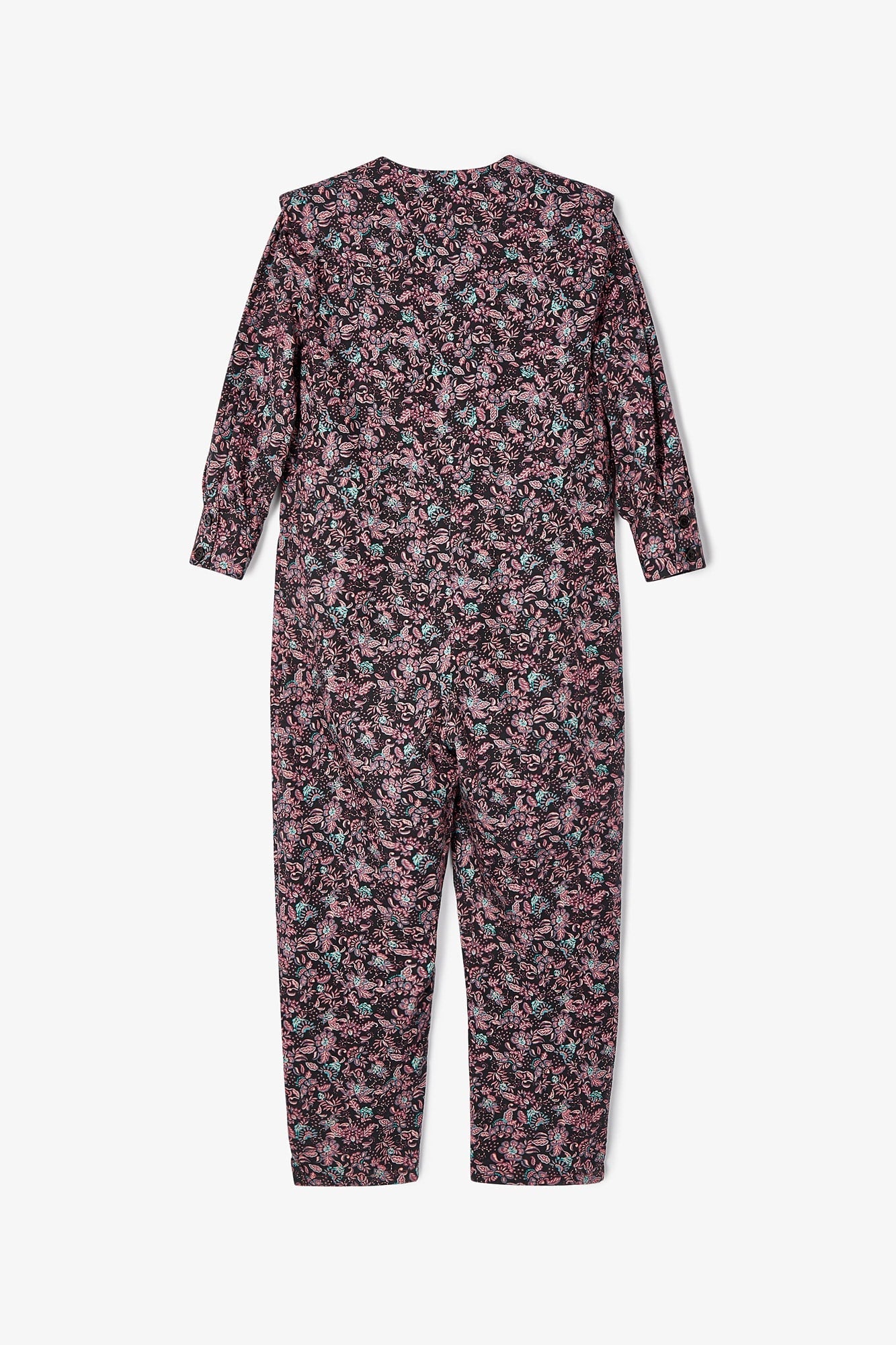 Long-sleeved, crew-neck jumpsuit made from 100% cotton fabric with floral print. Button closure on the front and slouchy trousers.