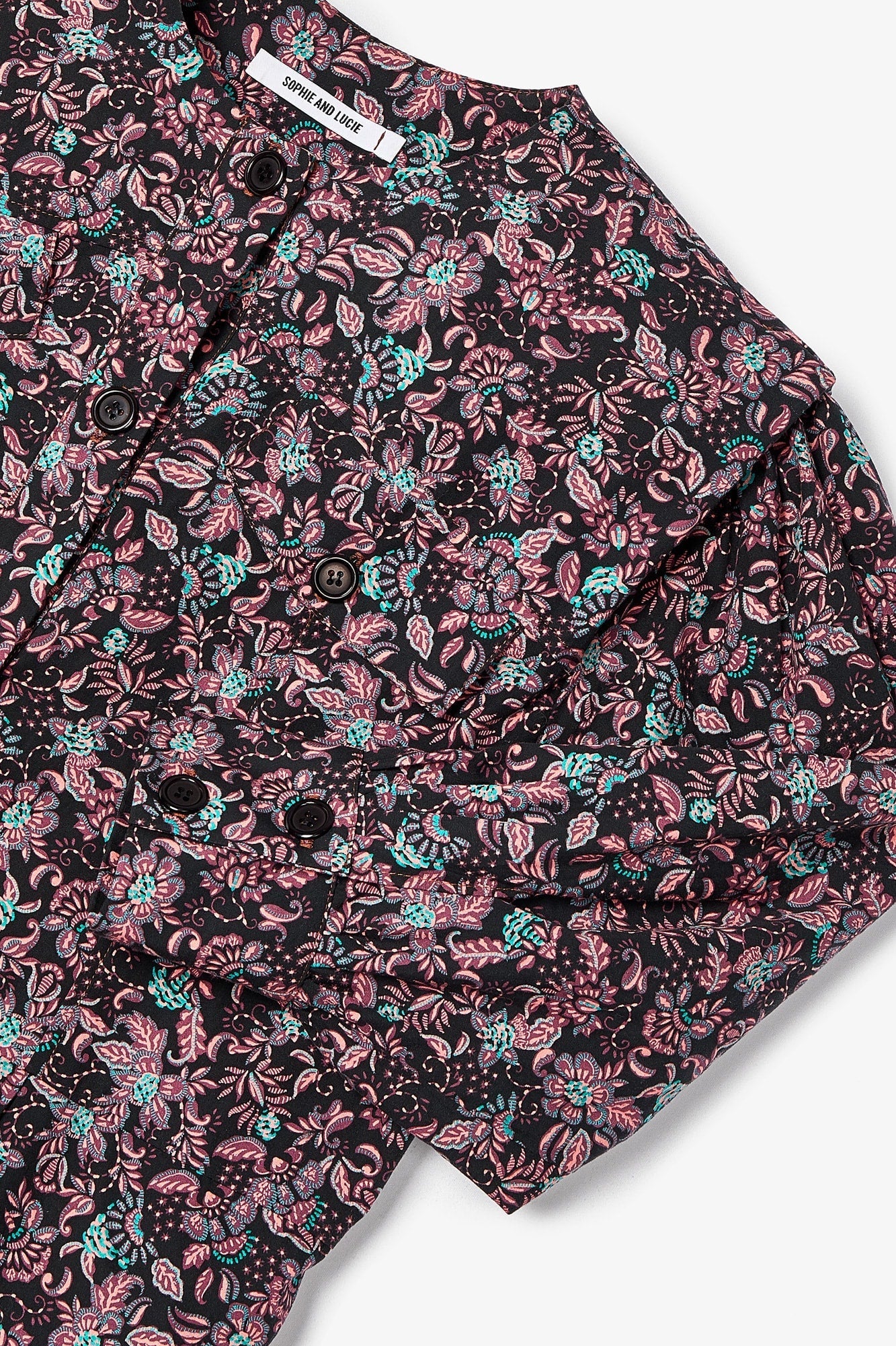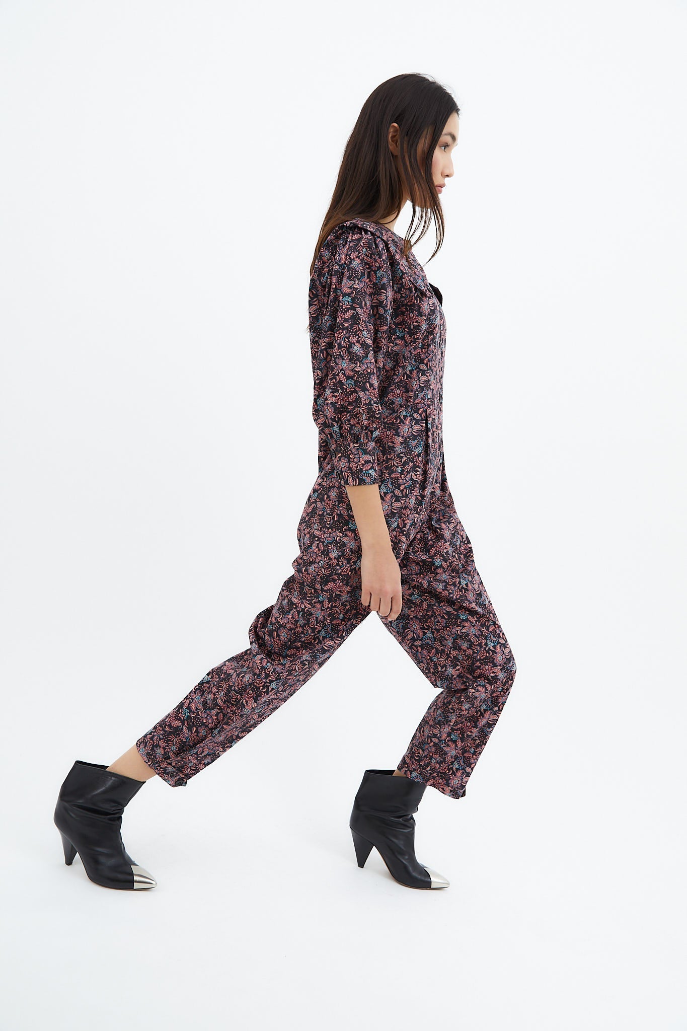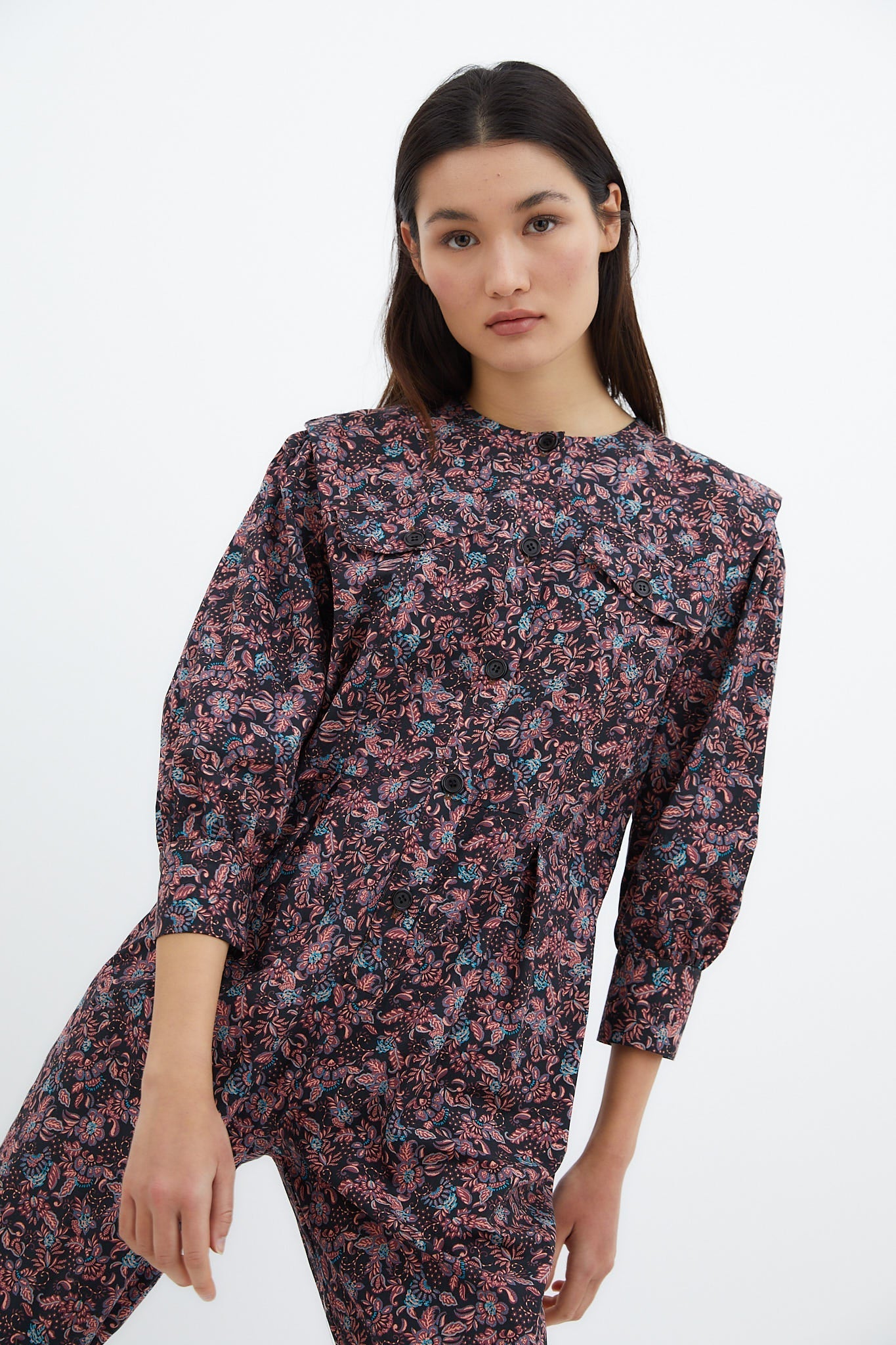 Long-sleeved, crew-neck jumpsuit made from 100% cotton fabric with floral print. Button closure on the front and slouchy trousers.
