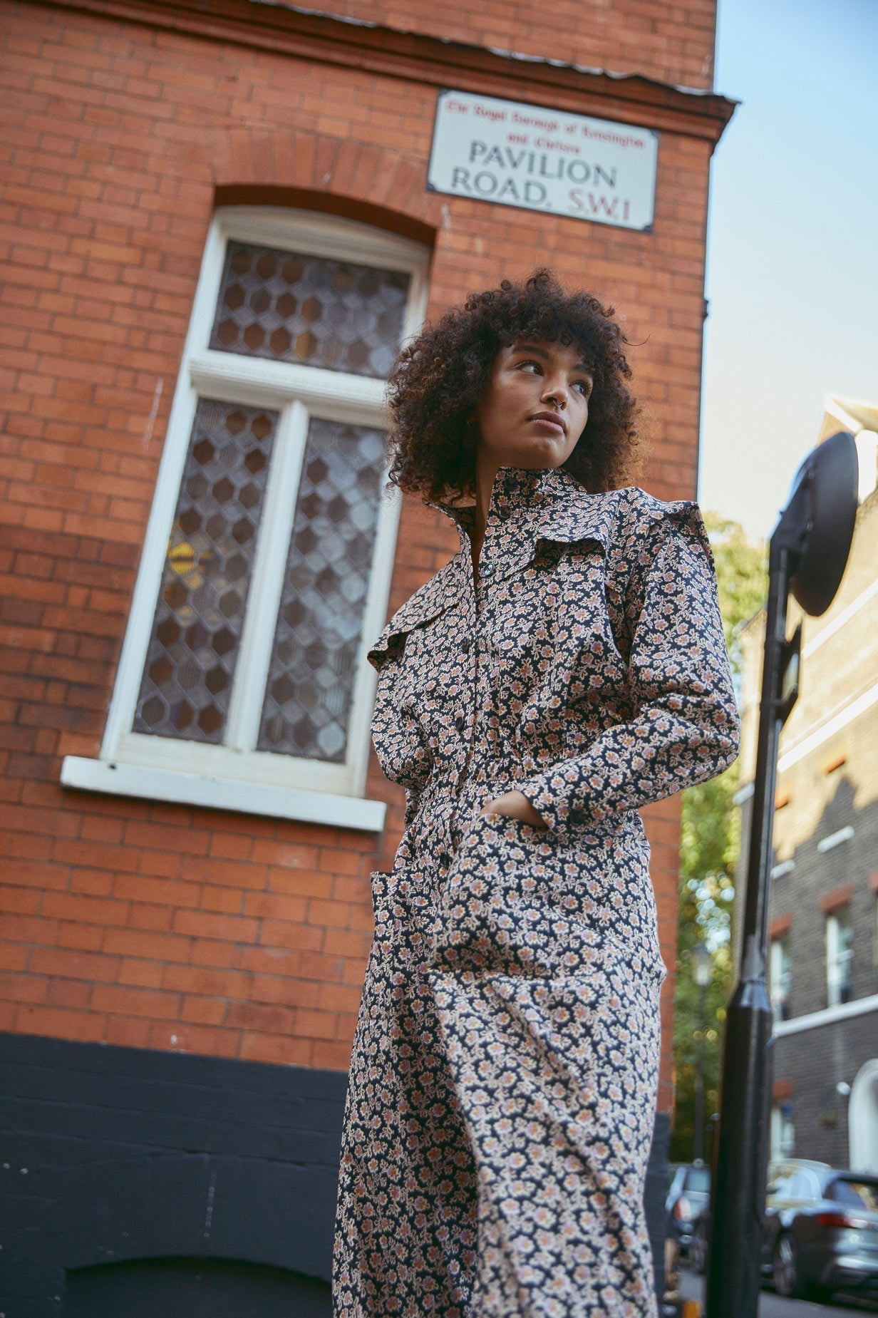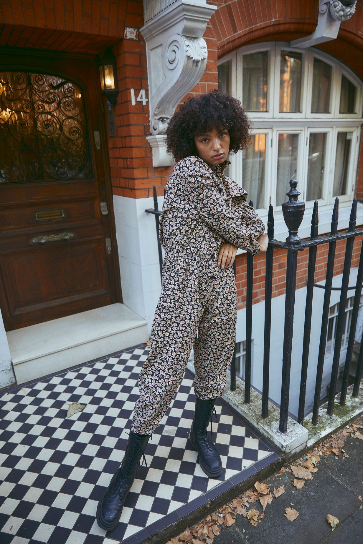 Funnel-neck jumpsuit with short sleeves made of printed cotton fabric. It fastens with covered buttons on the front and features slouchy pants.