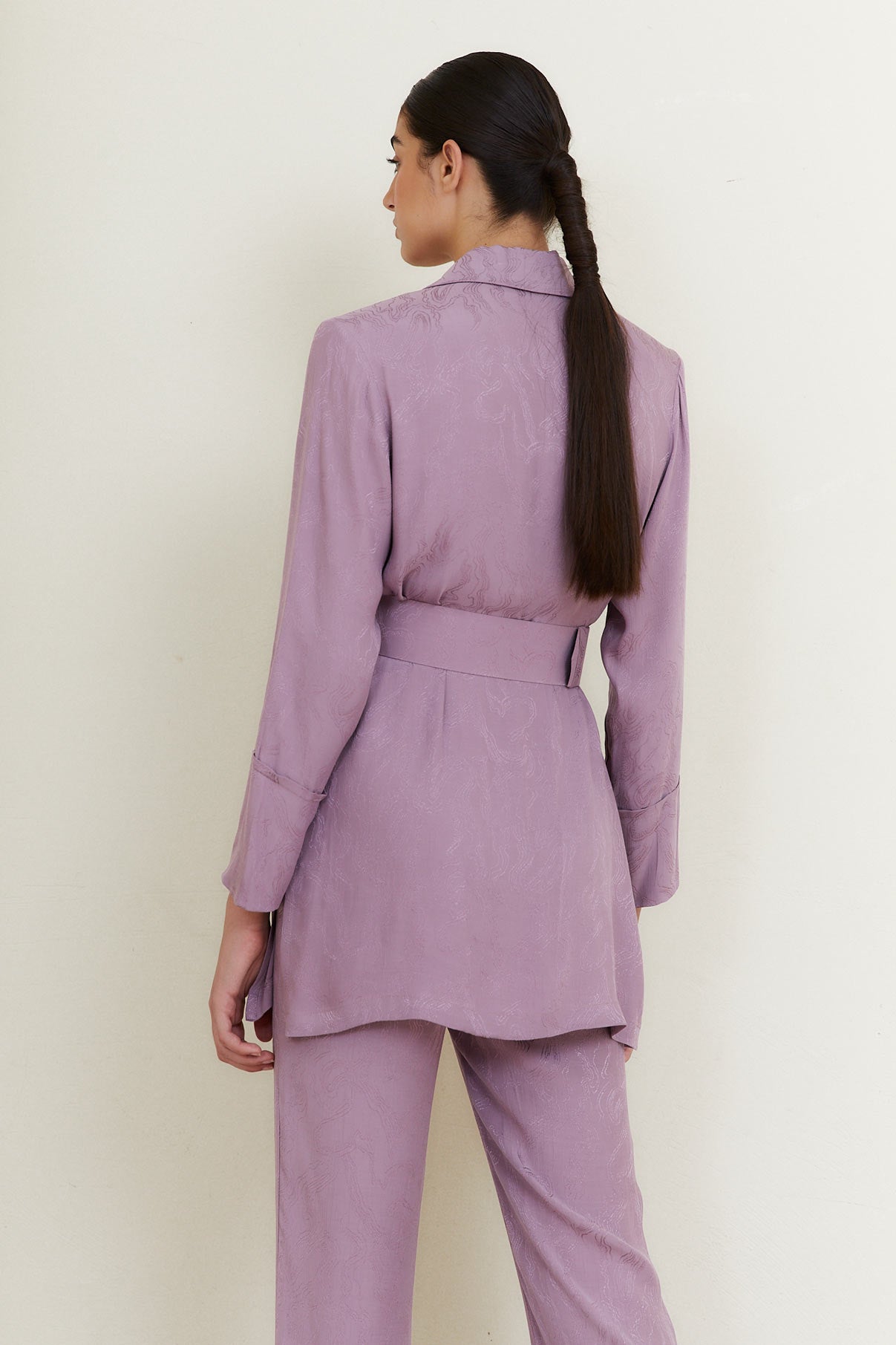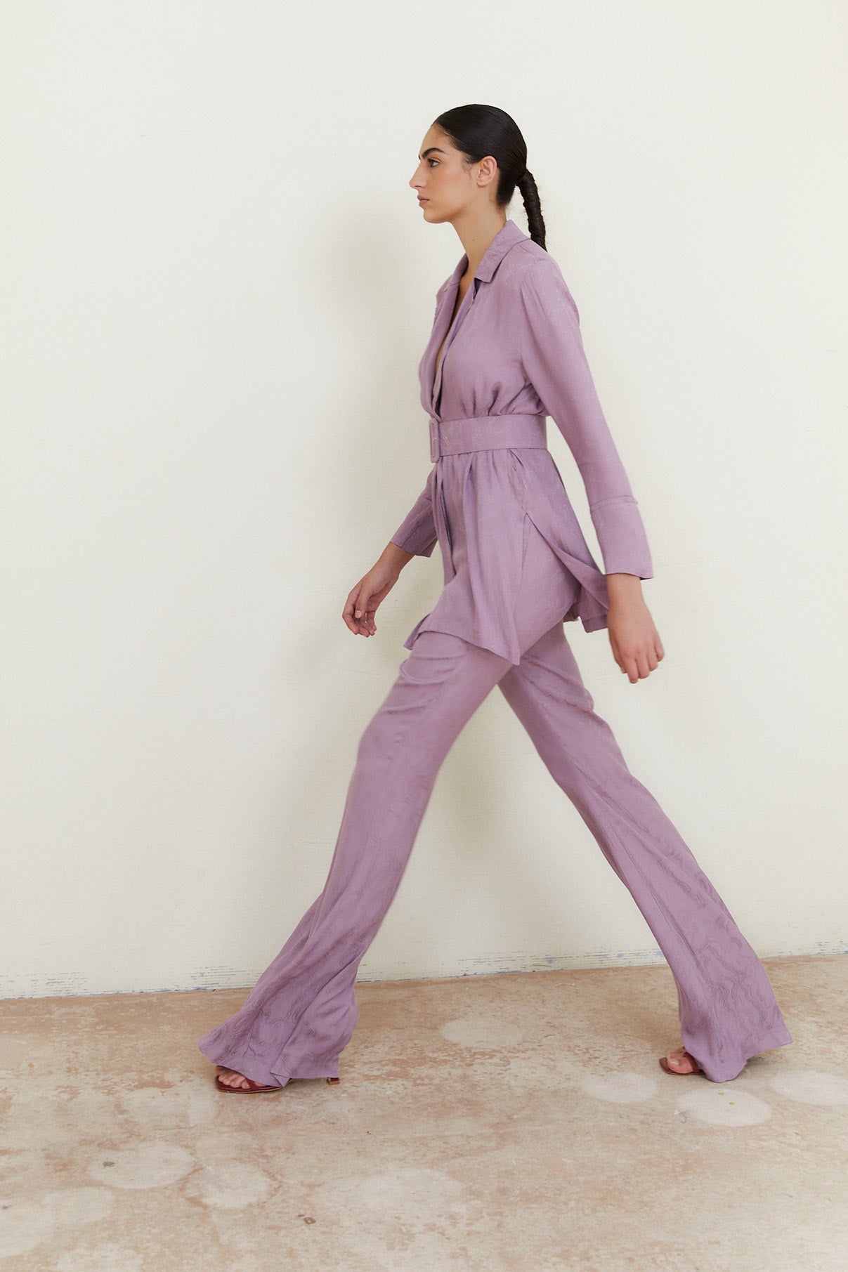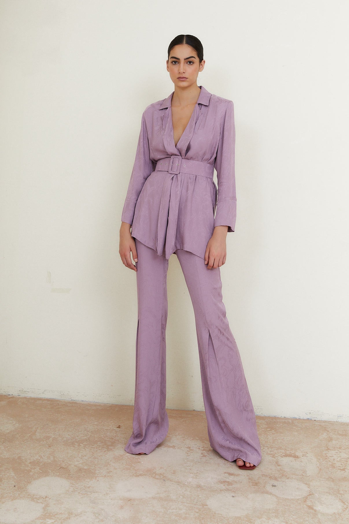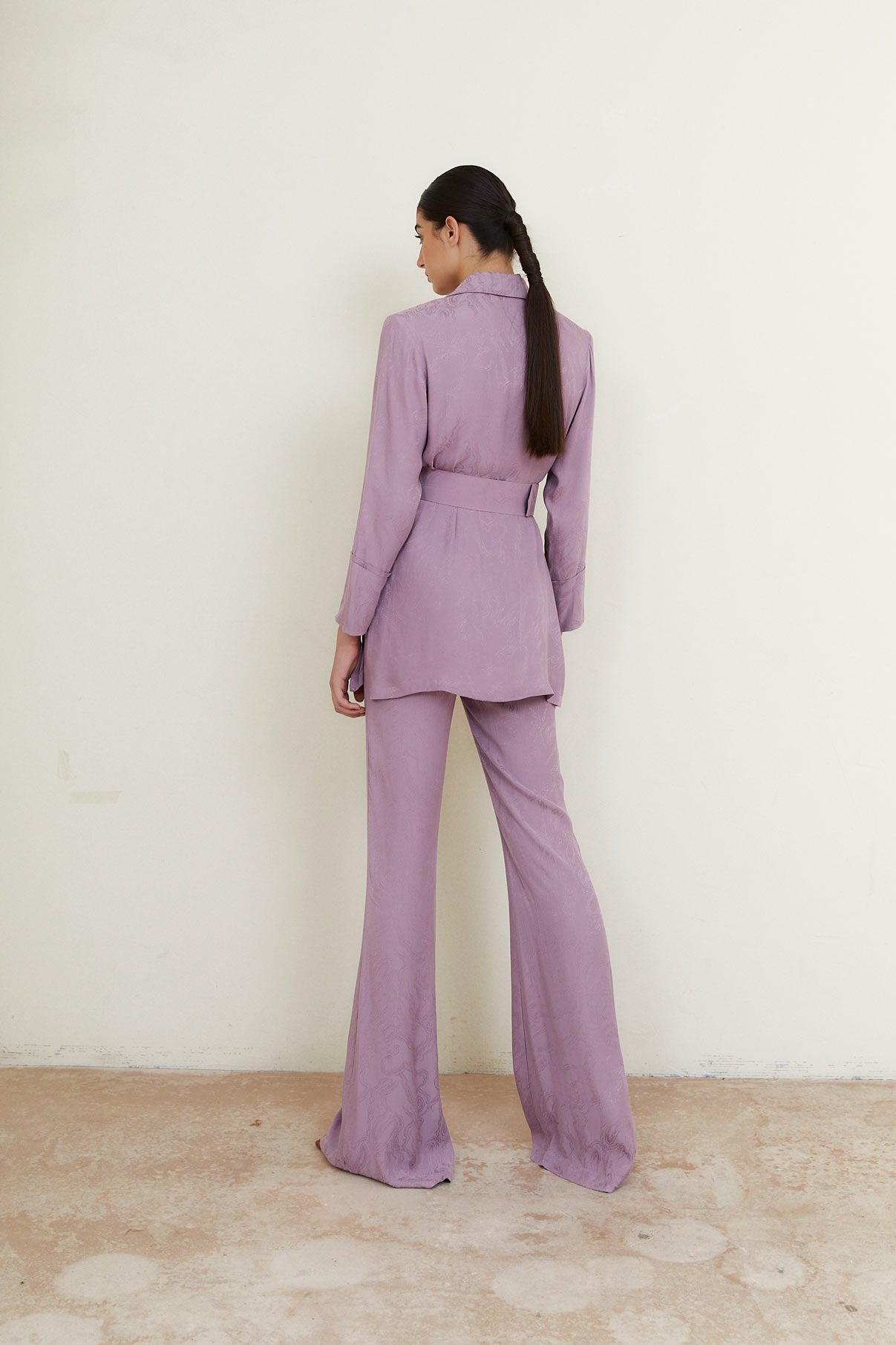 The Lion jacket is our best-selling and versatile jacket. It has double lapels and marked shoulder pads. Long sleeves and covered buttons on the front, a belt in the same fabric to cinch the waist. Our pleated trousers made of viscose jacquard, fixed waistband and side zip closure.