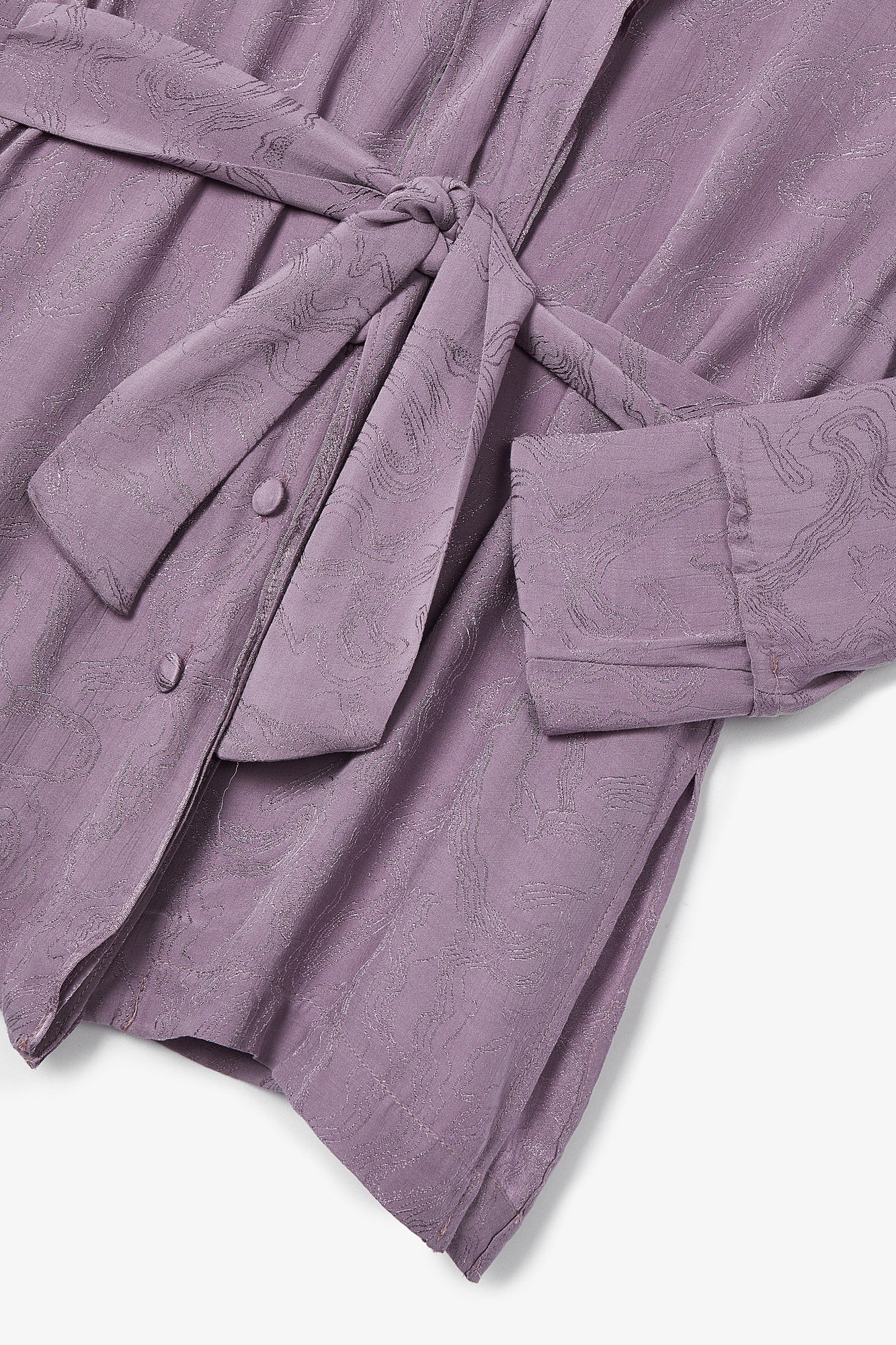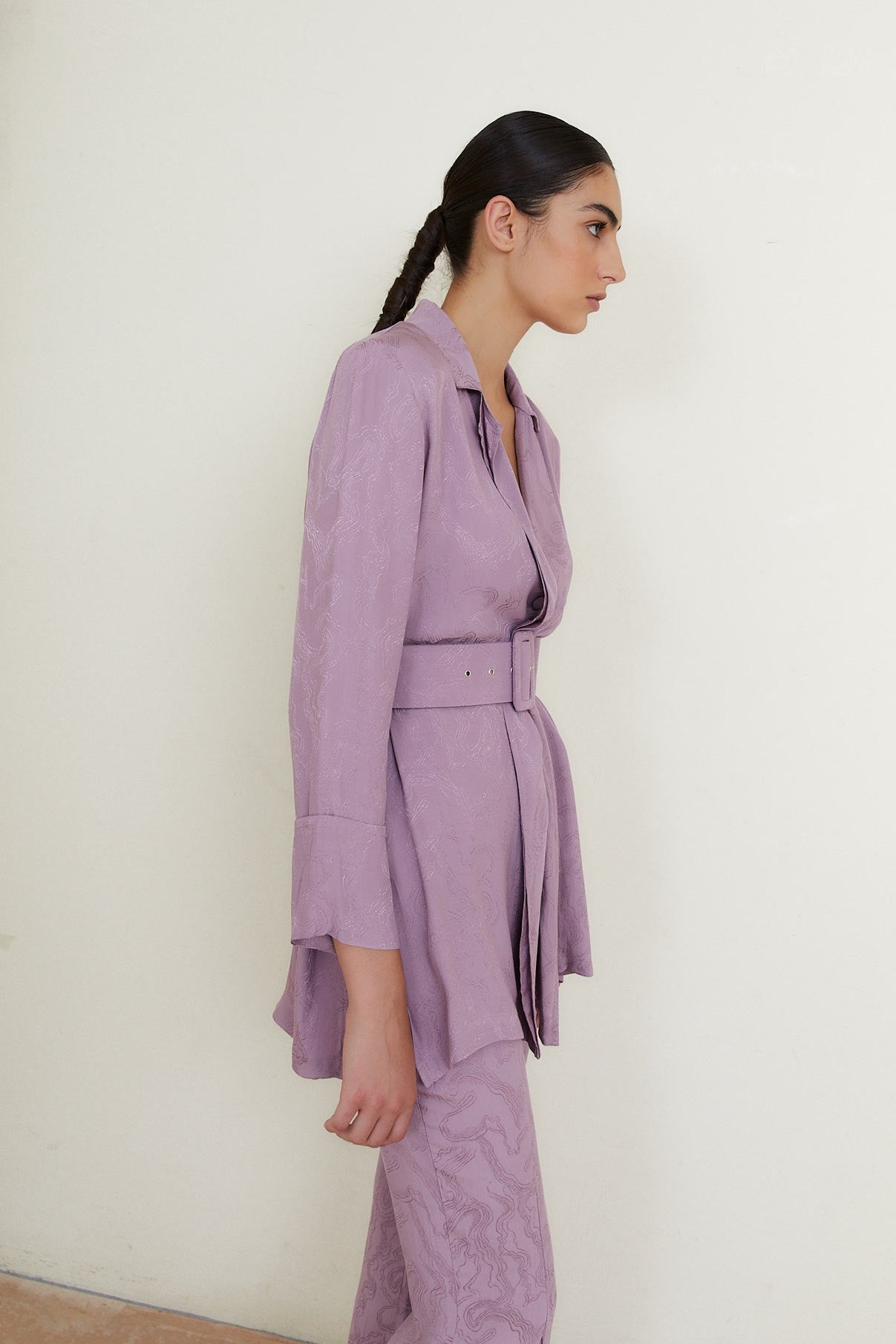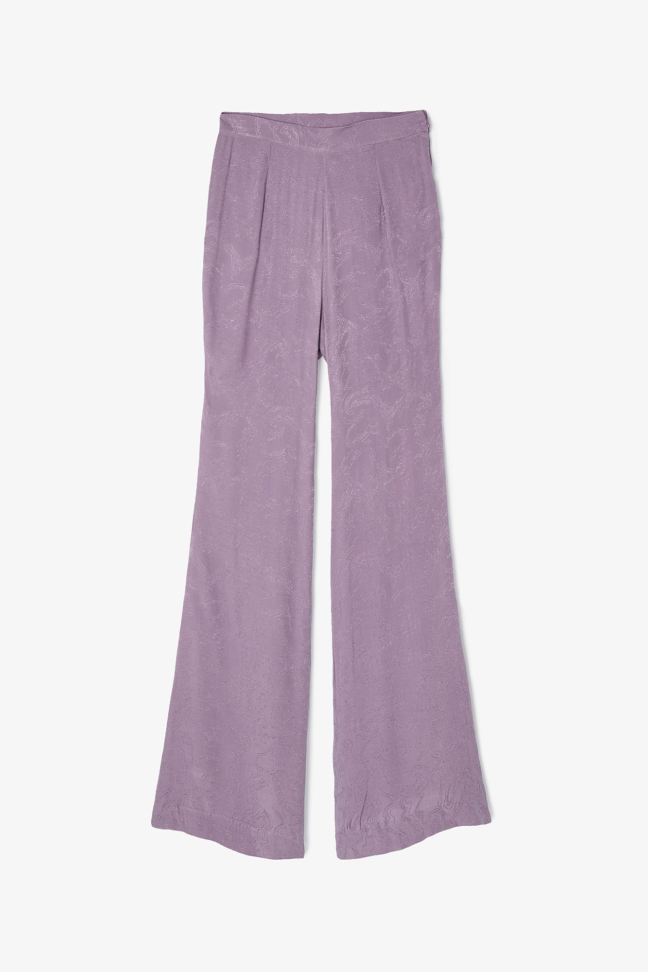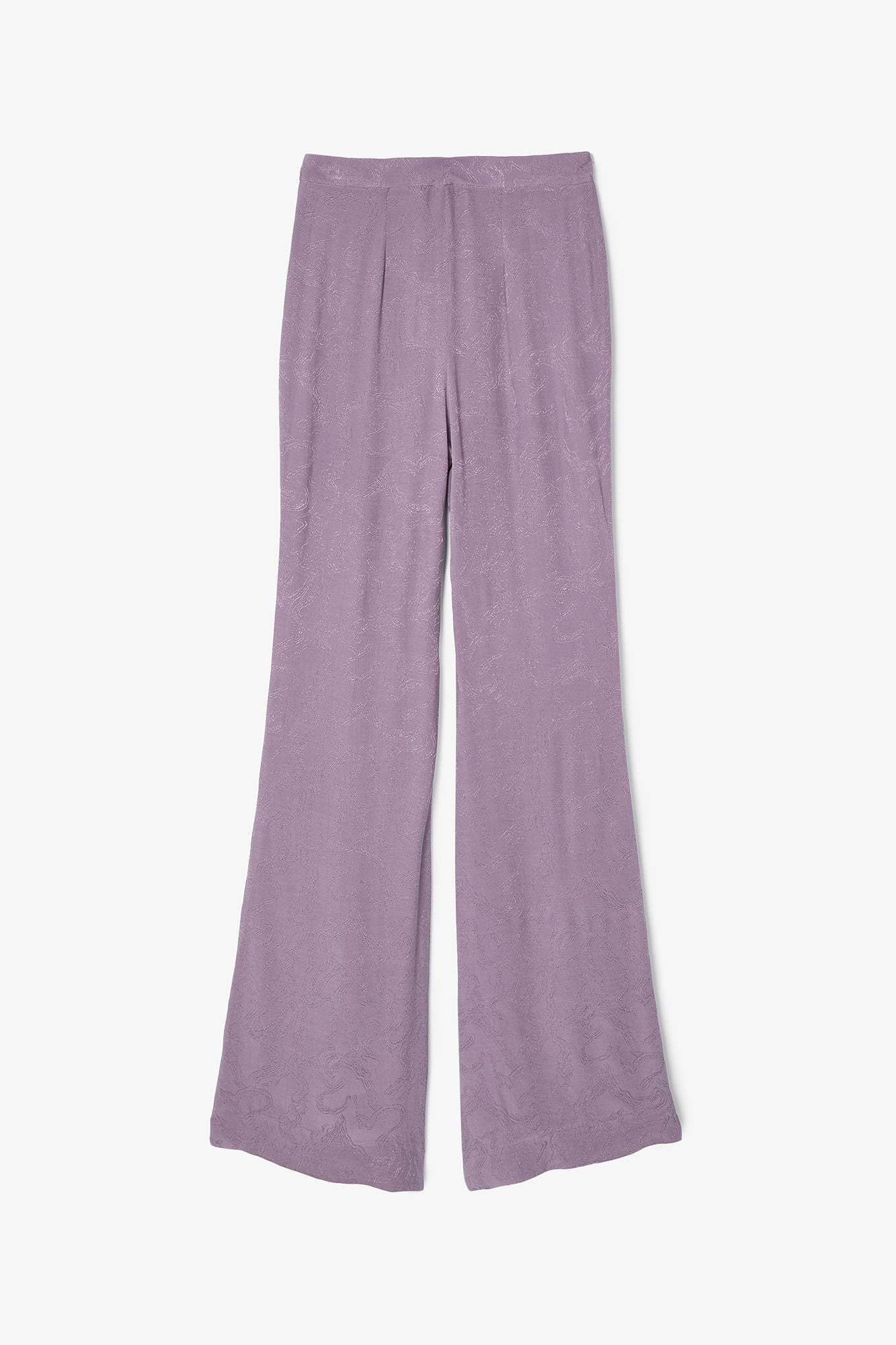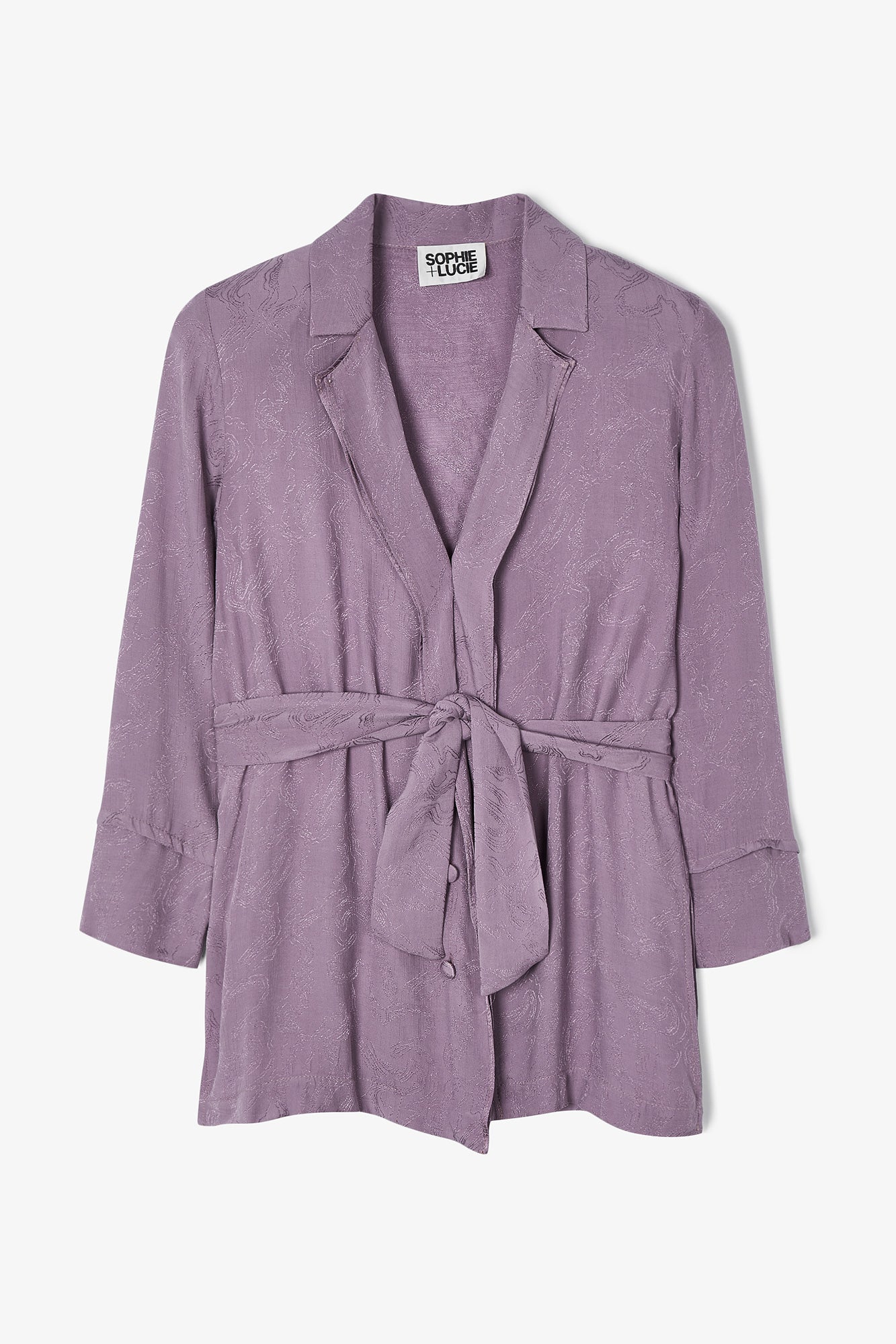 The Lion jacket is our best-selling and versatile jacket. It has double lapels and marked shoulder pads. Long sleeves and covered buttons on the front, a belt in the same fabric to cinch the waist. Our pleated trousers made of viscose jacquard, fixed waistband and side zip closure.