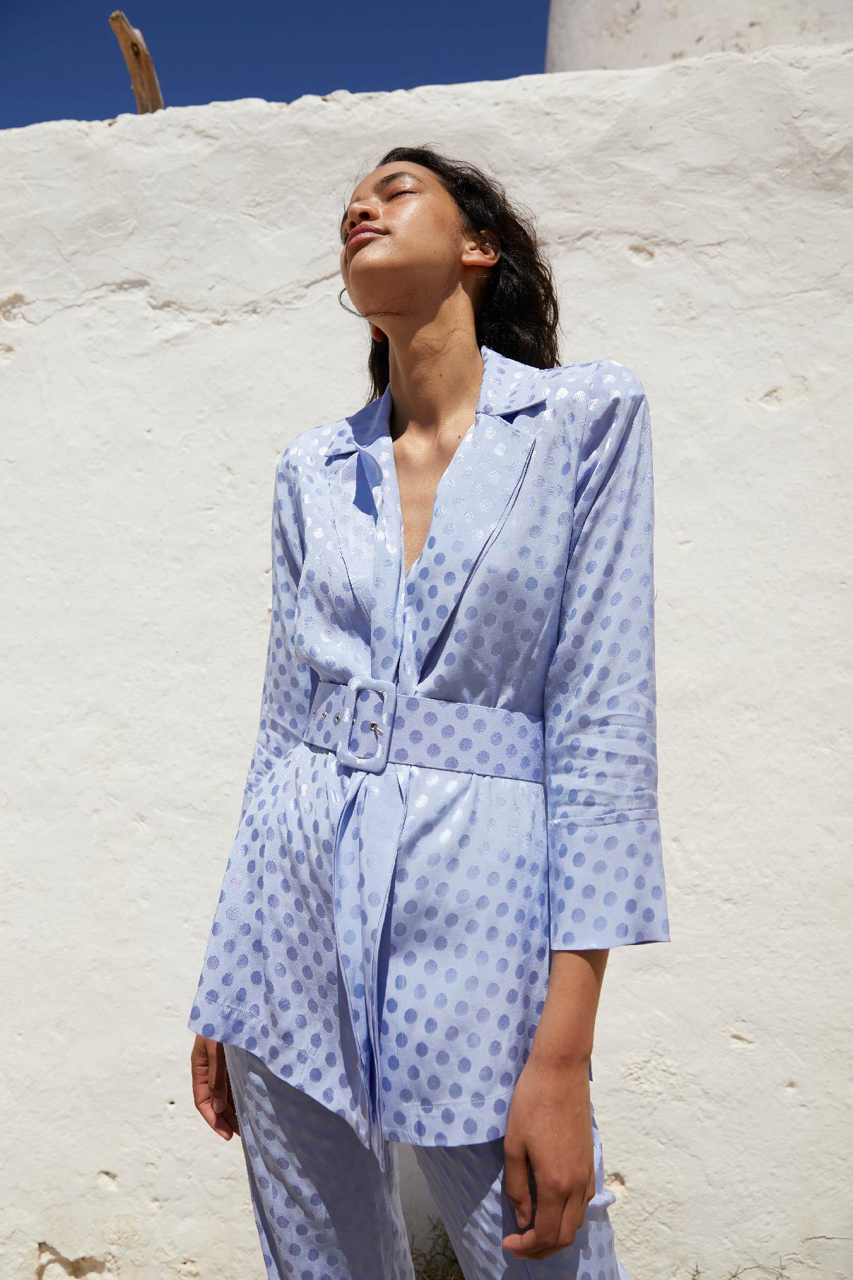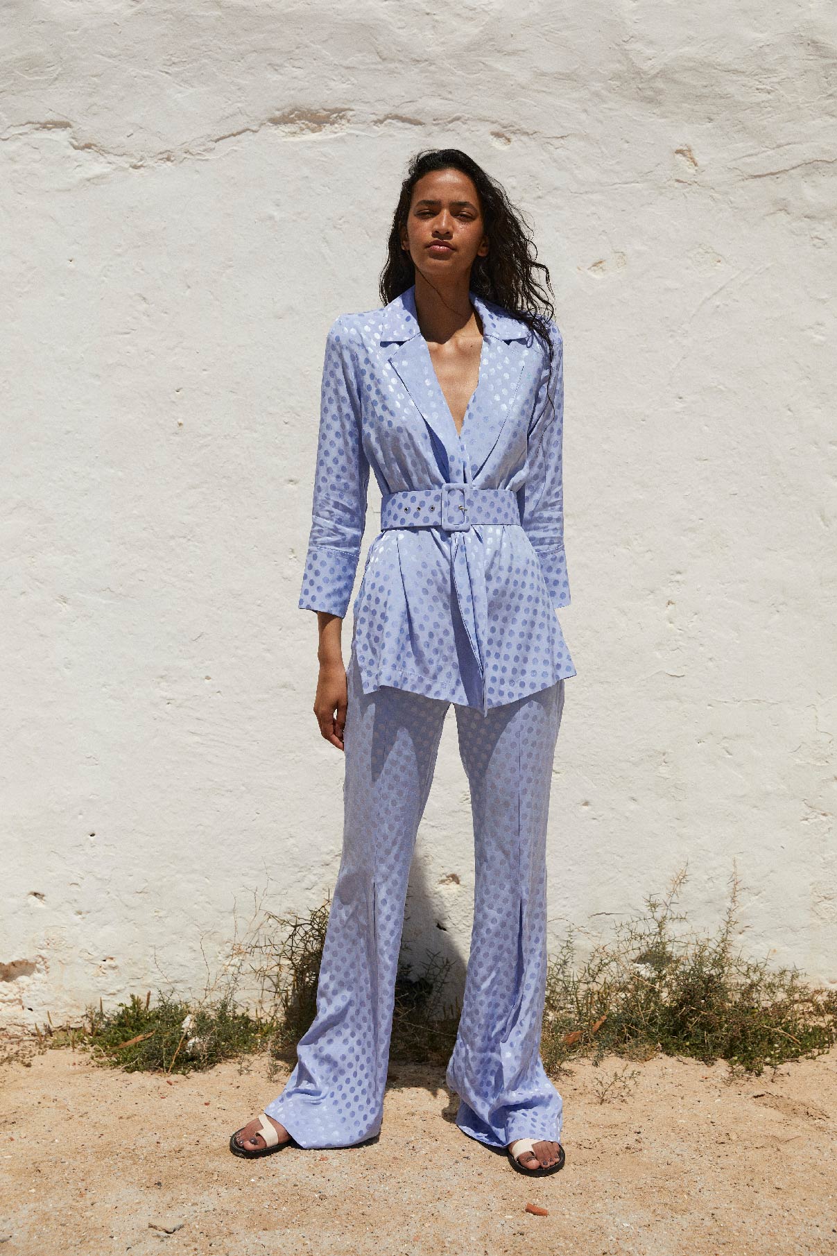 SOPHIE AND LUCIE's most special total look is updated every season in fabric and color. The flowing jacket with shoulder pads and a belt is flattering, and the pleated pants flatter all our customers. This total look has become a staple for our brand.