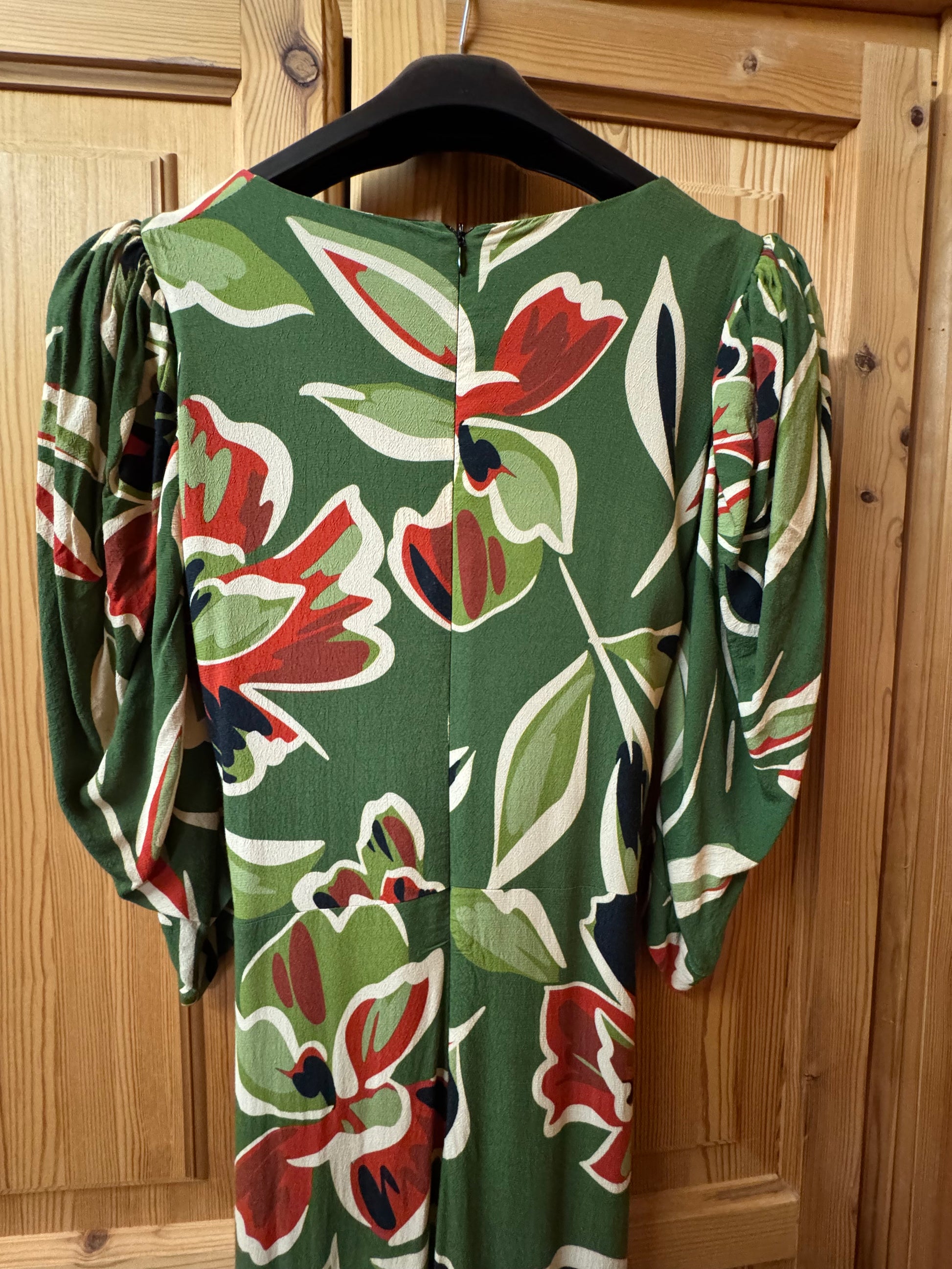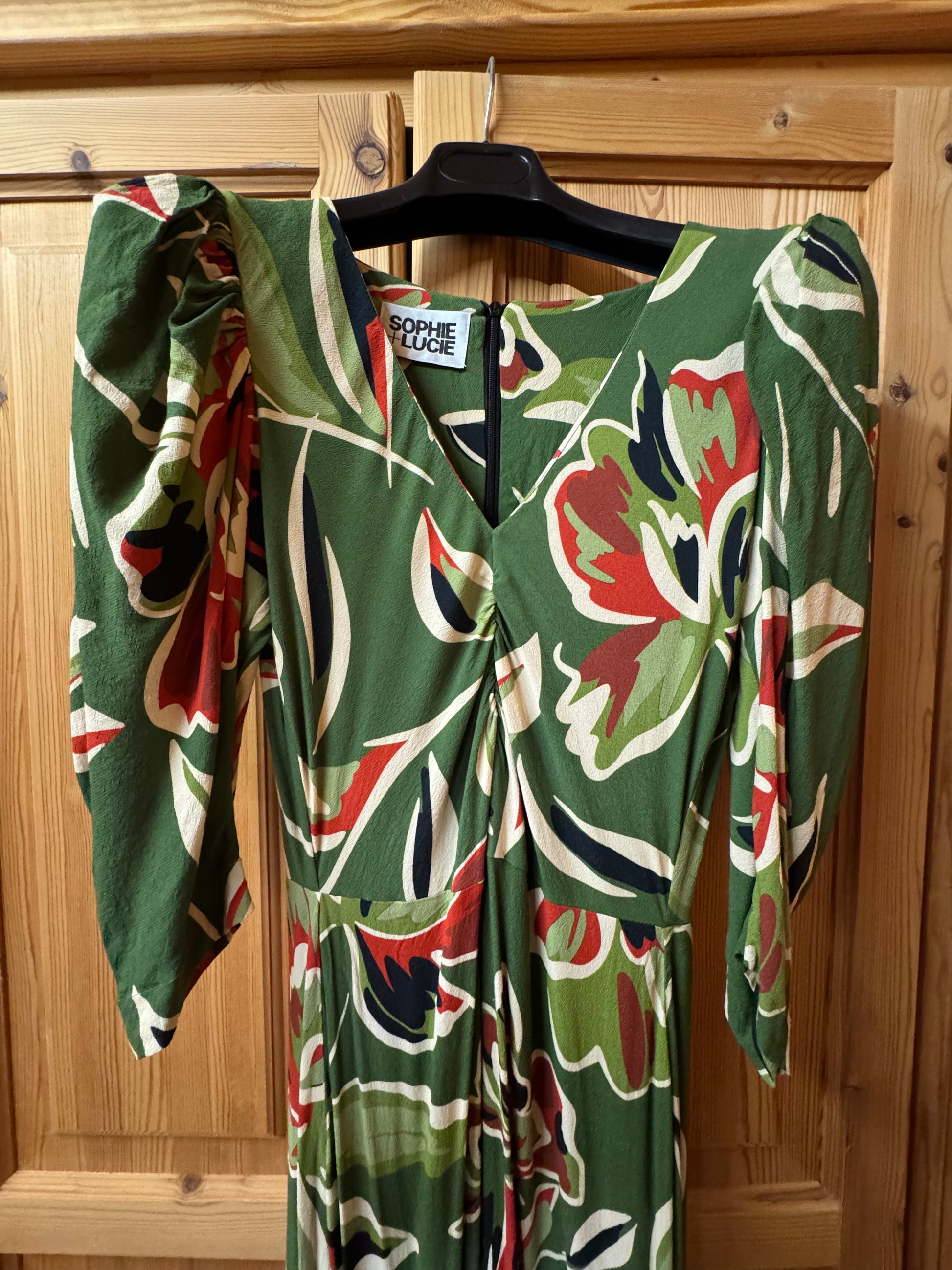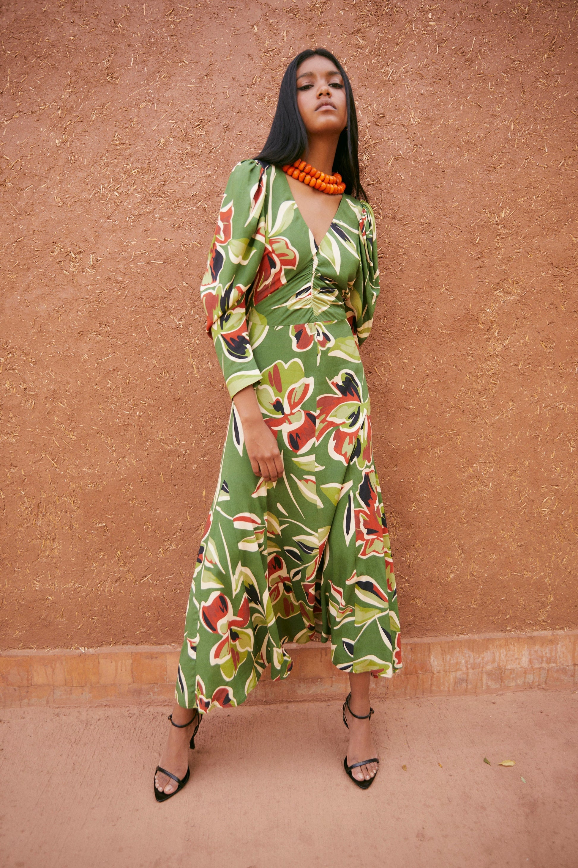 Dress made with a green floral print. Long-sleeved midi dress, V-neckline with gathering at the chest. The bottom of the skirt has a slight flare to facilitate movement and give volume to the skirt of the dress. The dress closes with an invisible zipper at the back.
