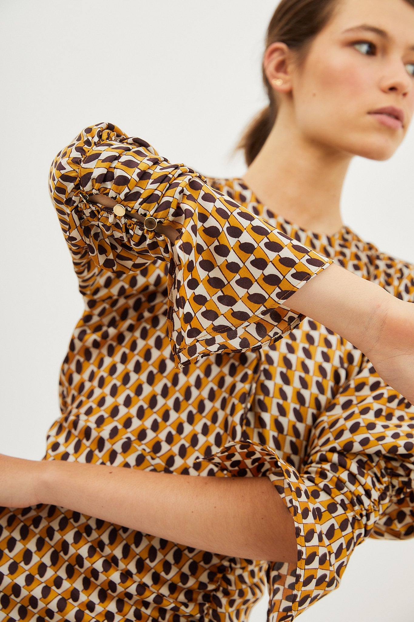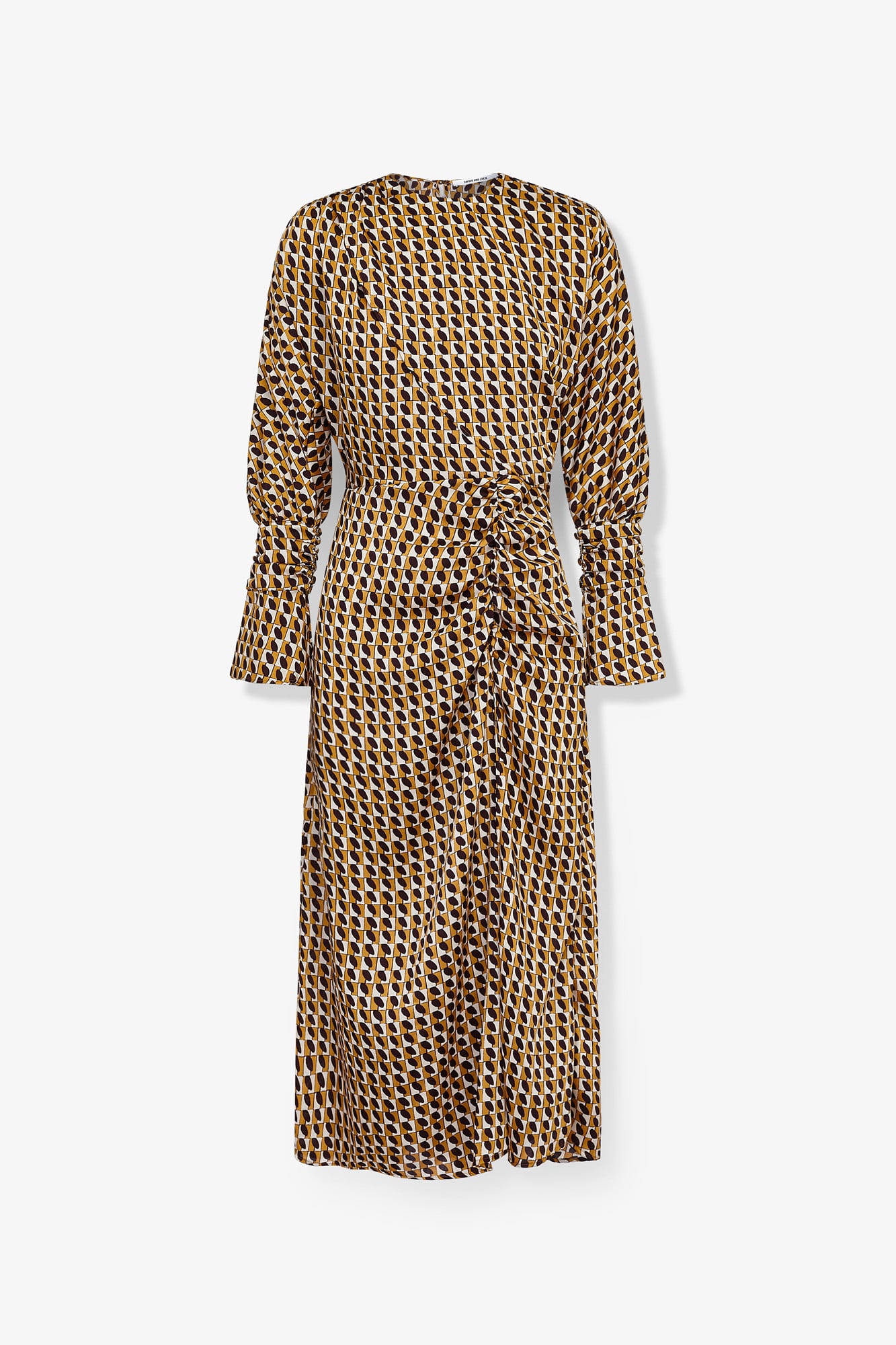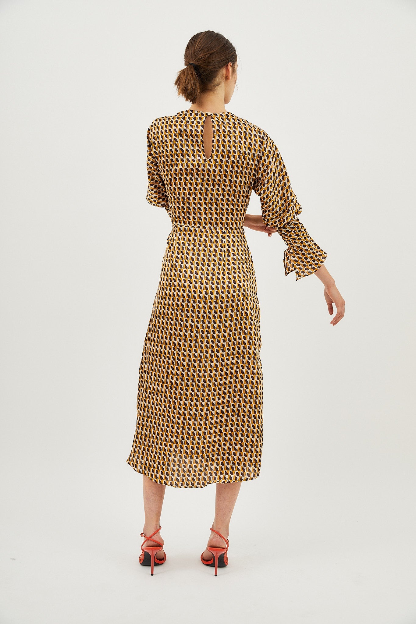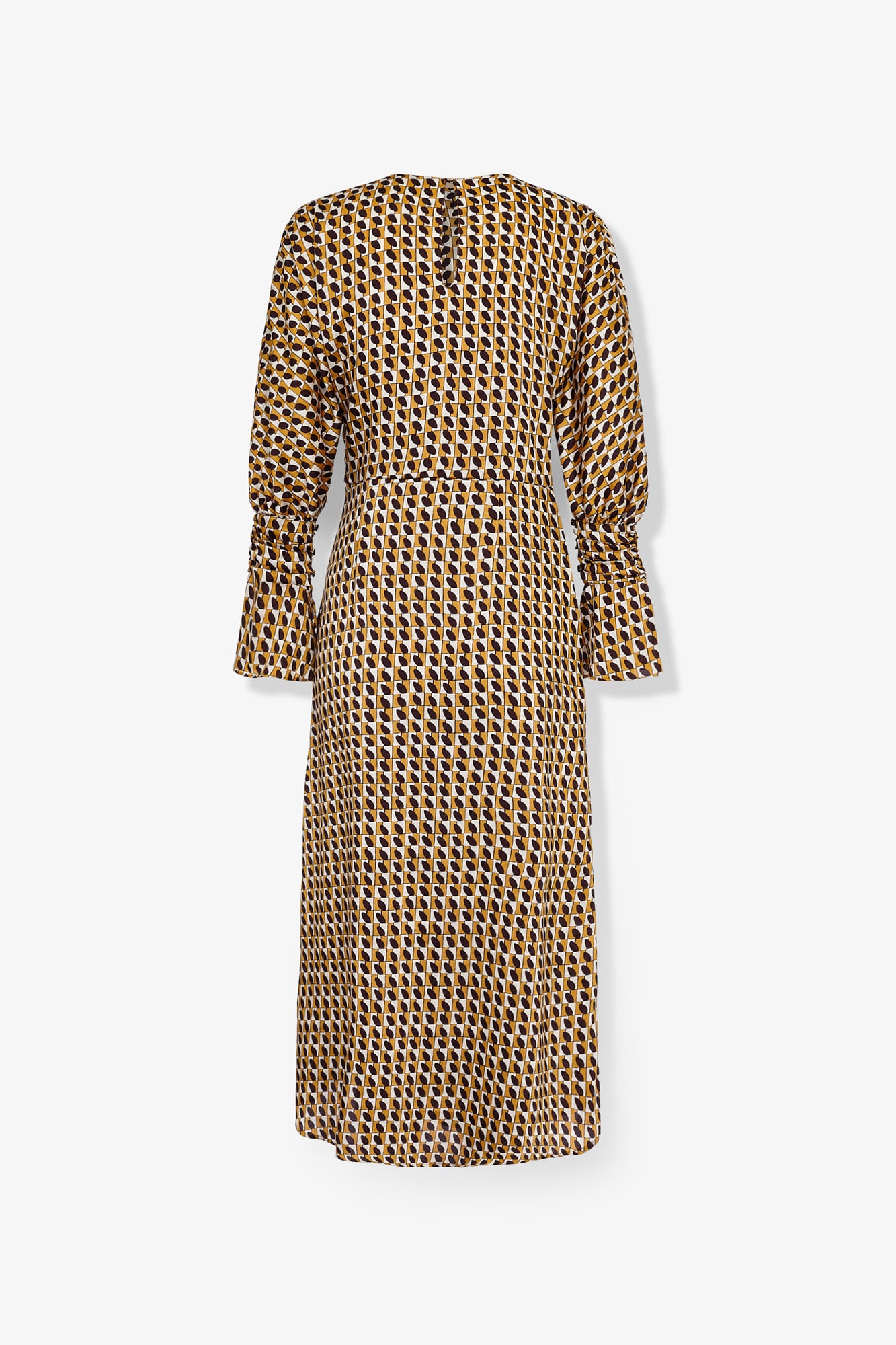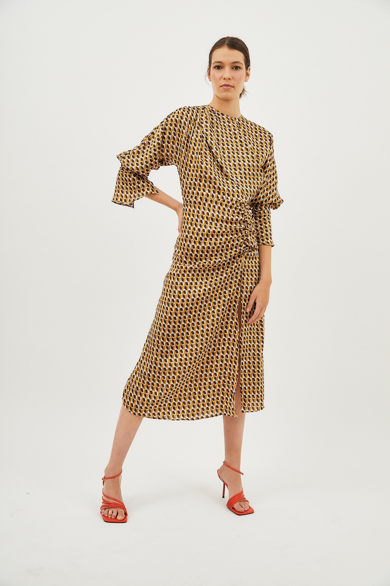 Midi dress made of printed fabric in brown tones. Dress with a round neckline. Long, voluminous sleeves ending in a buttoned ruffled cuff. Skirt with gathered detail and side slit for movement.