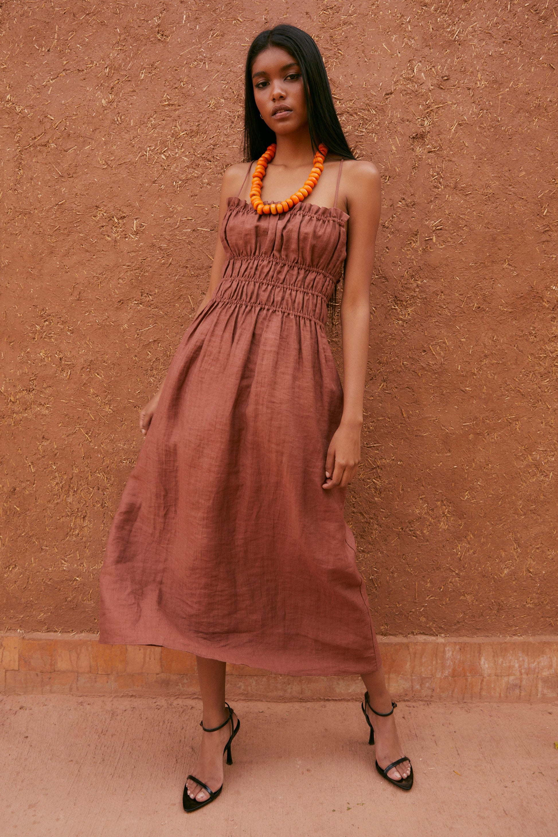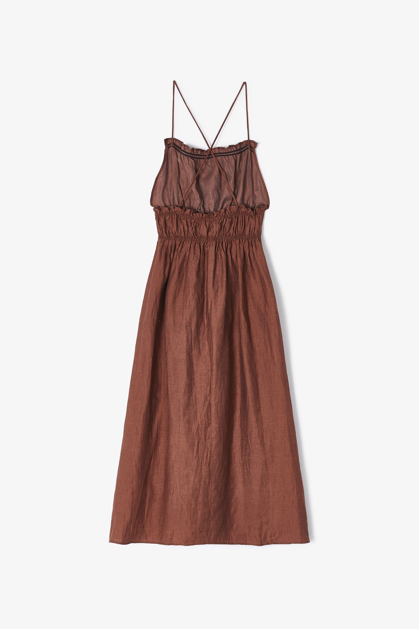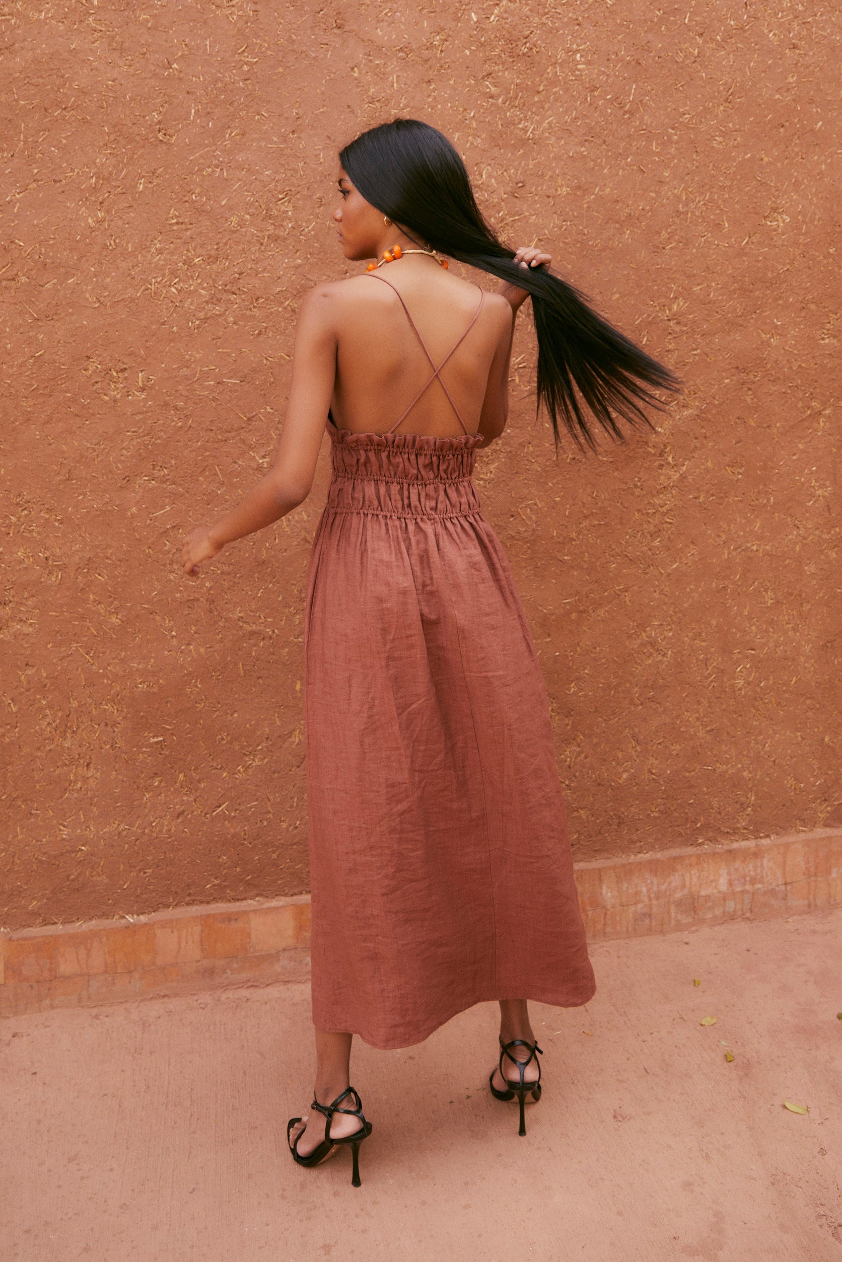 Midi dress made in terracotta color. Square neckline with thin straps and bare shoulders. The back is open with crossed straps. Elastic detail up to the waist, creating gathers that adjust the dress at the top, making it easier to put on.