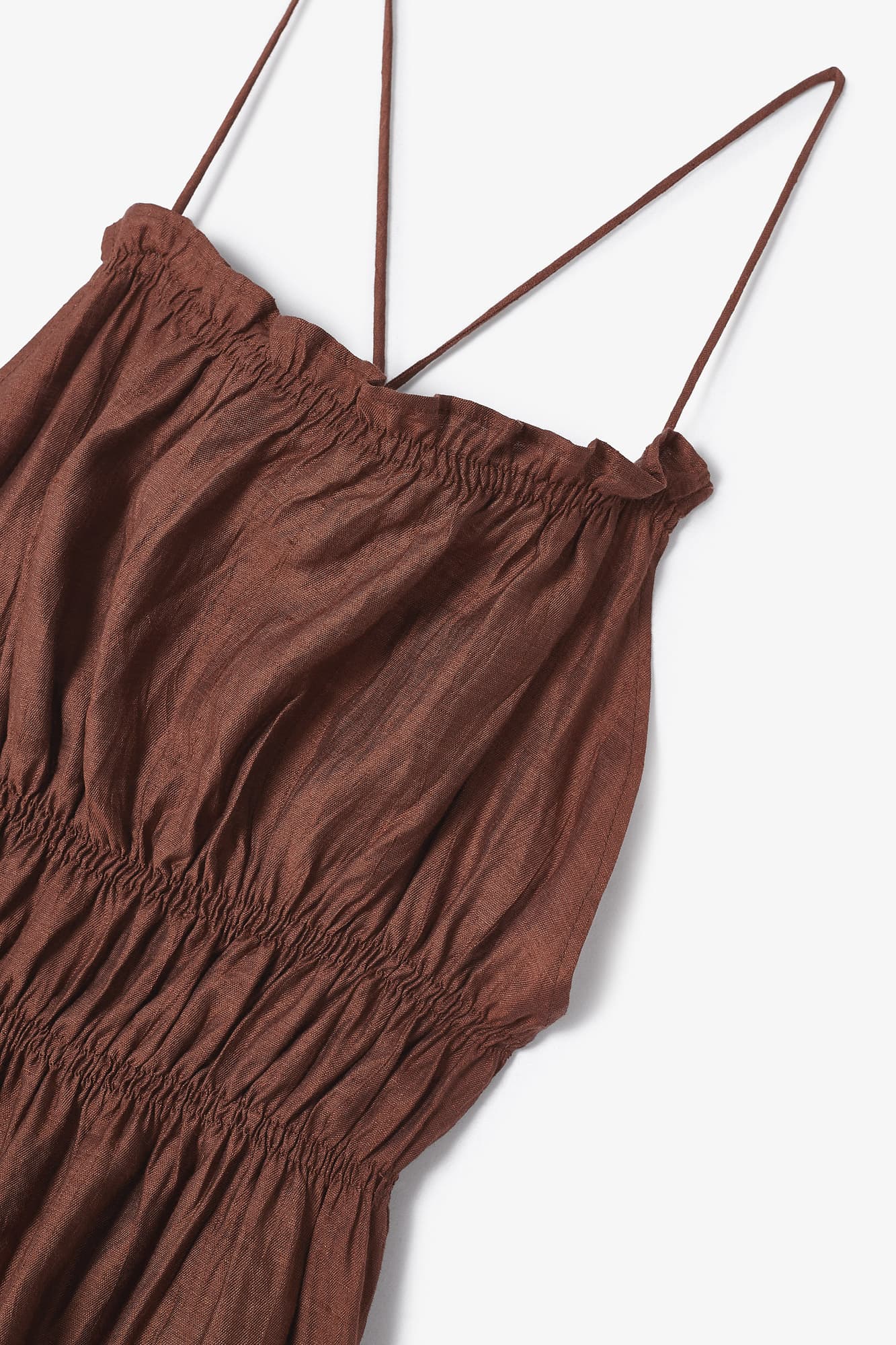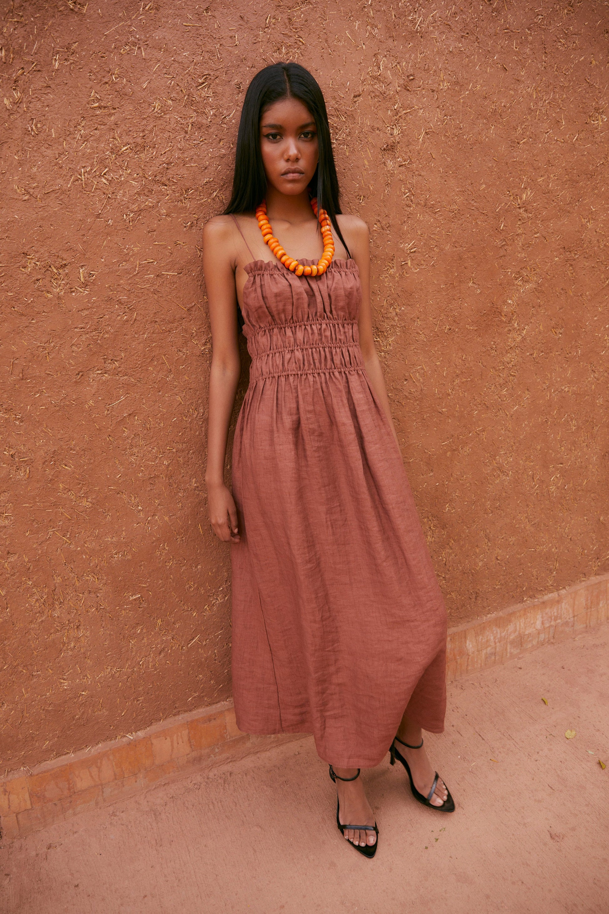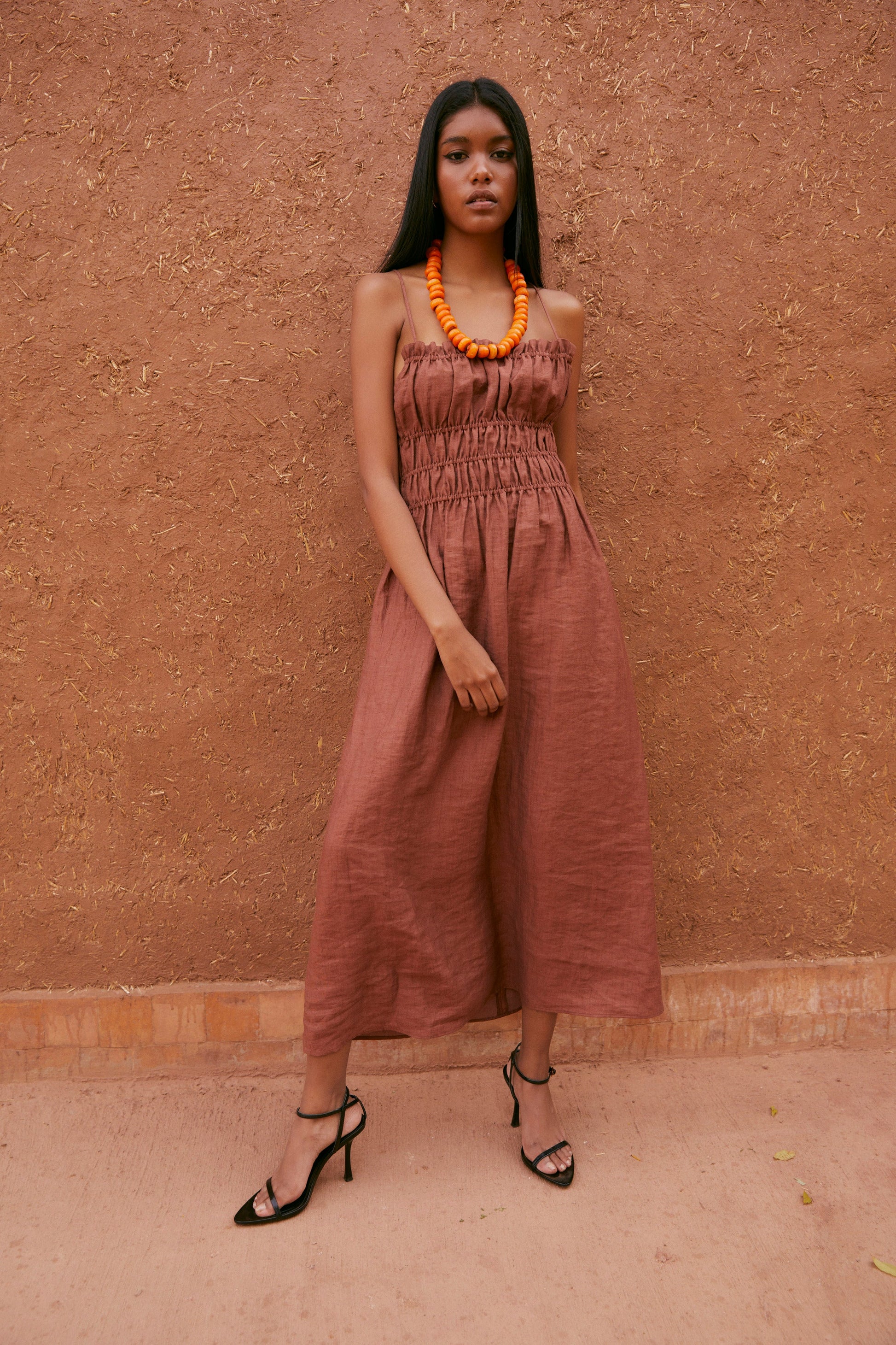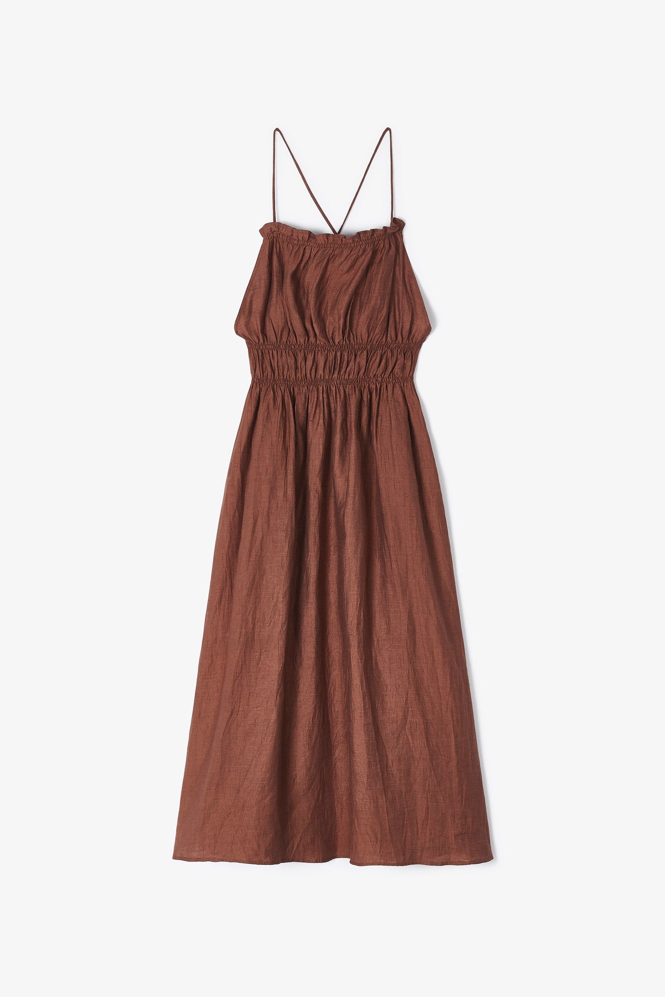 Midi dress made in terracotta color. Square neckline with thin straps and bare shoulders. The back is open with crossed straps. Elastic detail up to the waist, creating gathers that adjust the dress at the top, making it easier to put on.