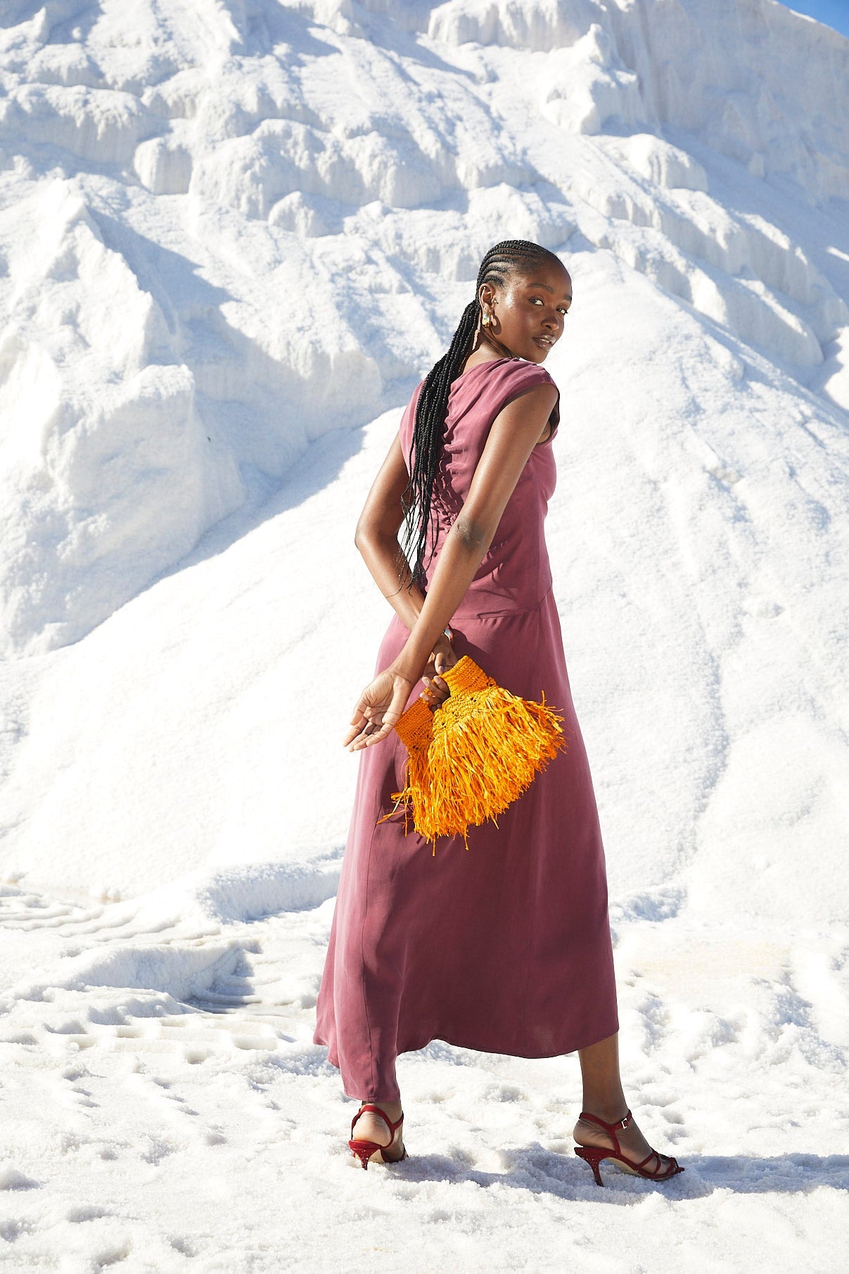 The Paula dress is made from 100% wine-coloured cupro fabric. Sleeveless and with a slight V-neckline. Gathered detail on the front and back that gives shape and personality to the garment. Invisible zip fastening on the side.