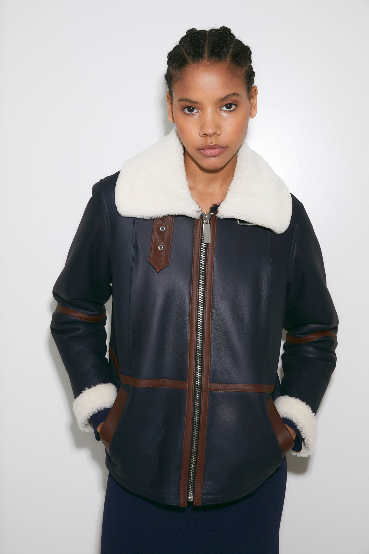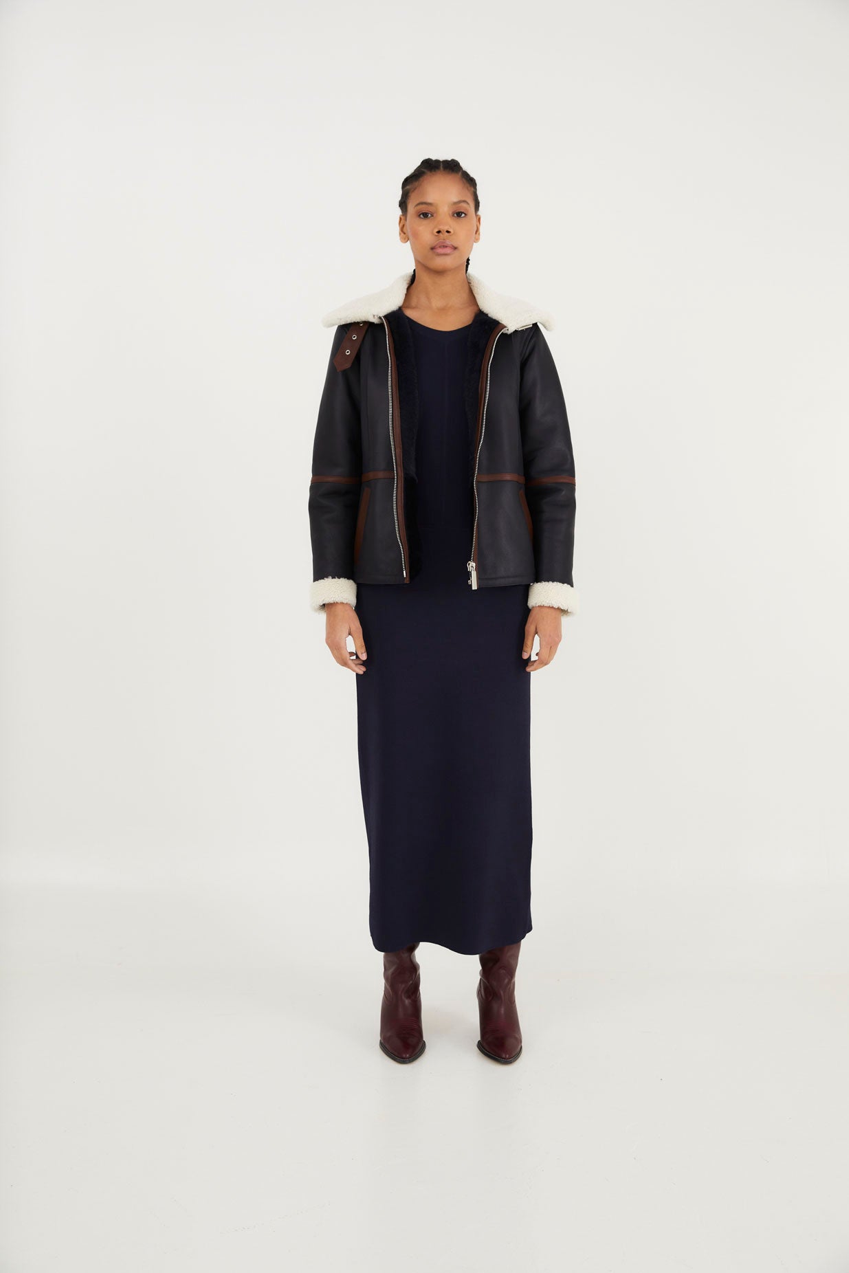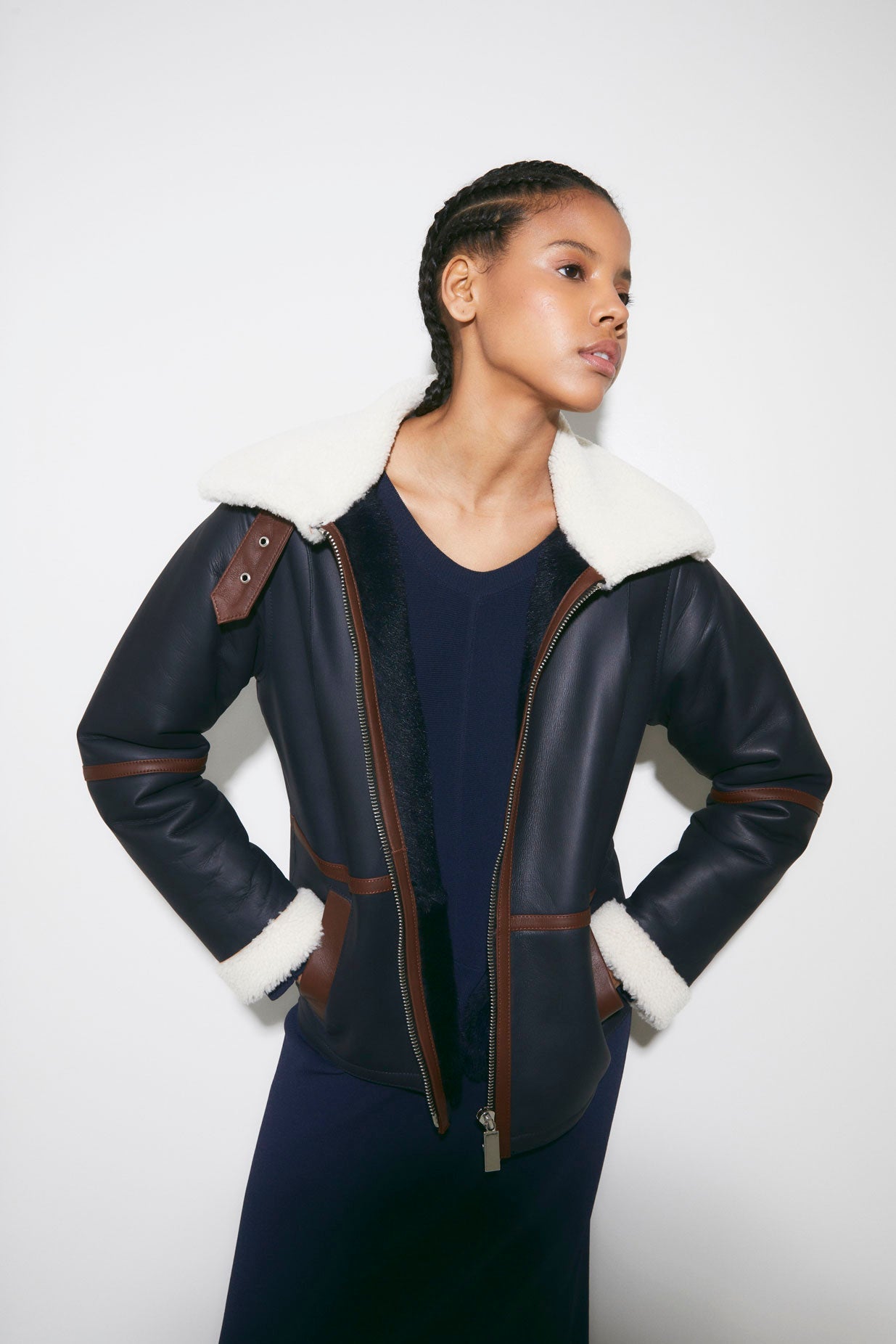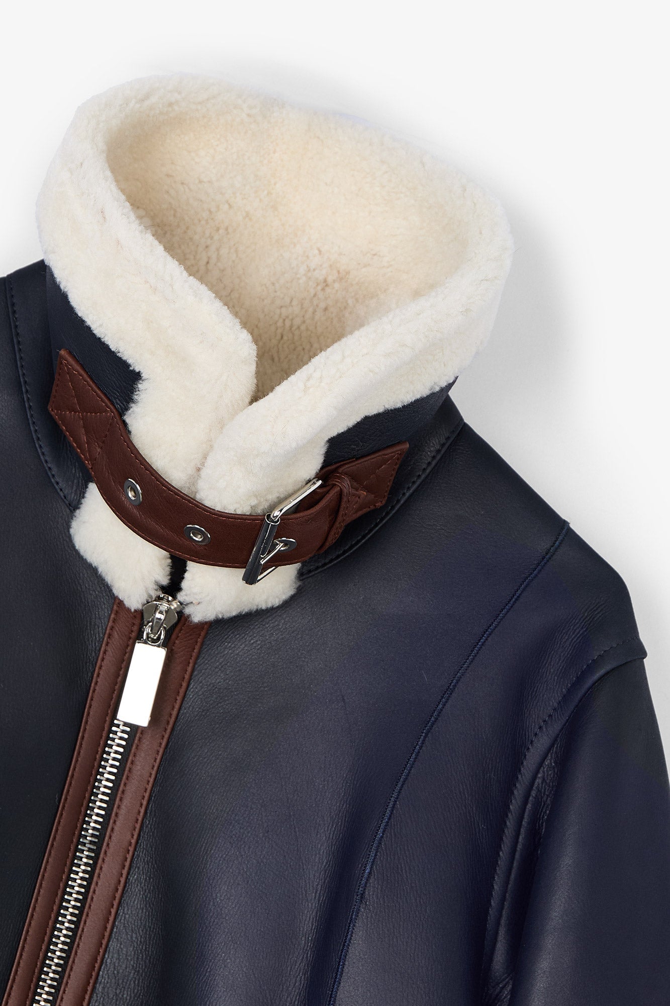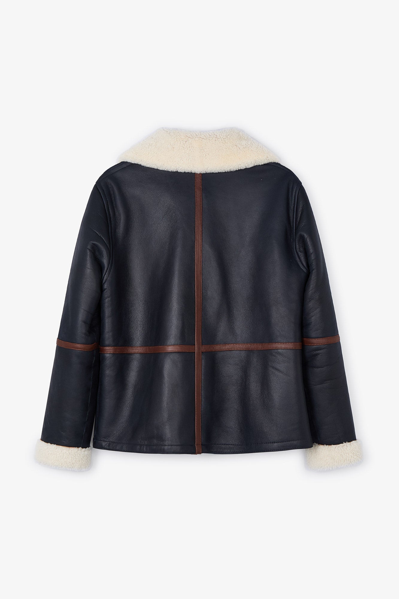 Nuestro abrigo Aviador color marino 100% piel vuelta de cordero español, tiene el cuello solapa, bolsillos laterales y cierre con cremallera en el delantero.