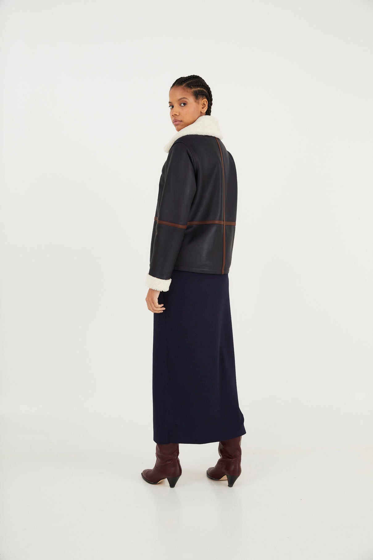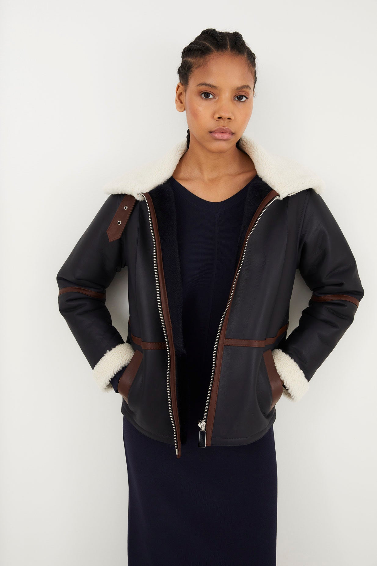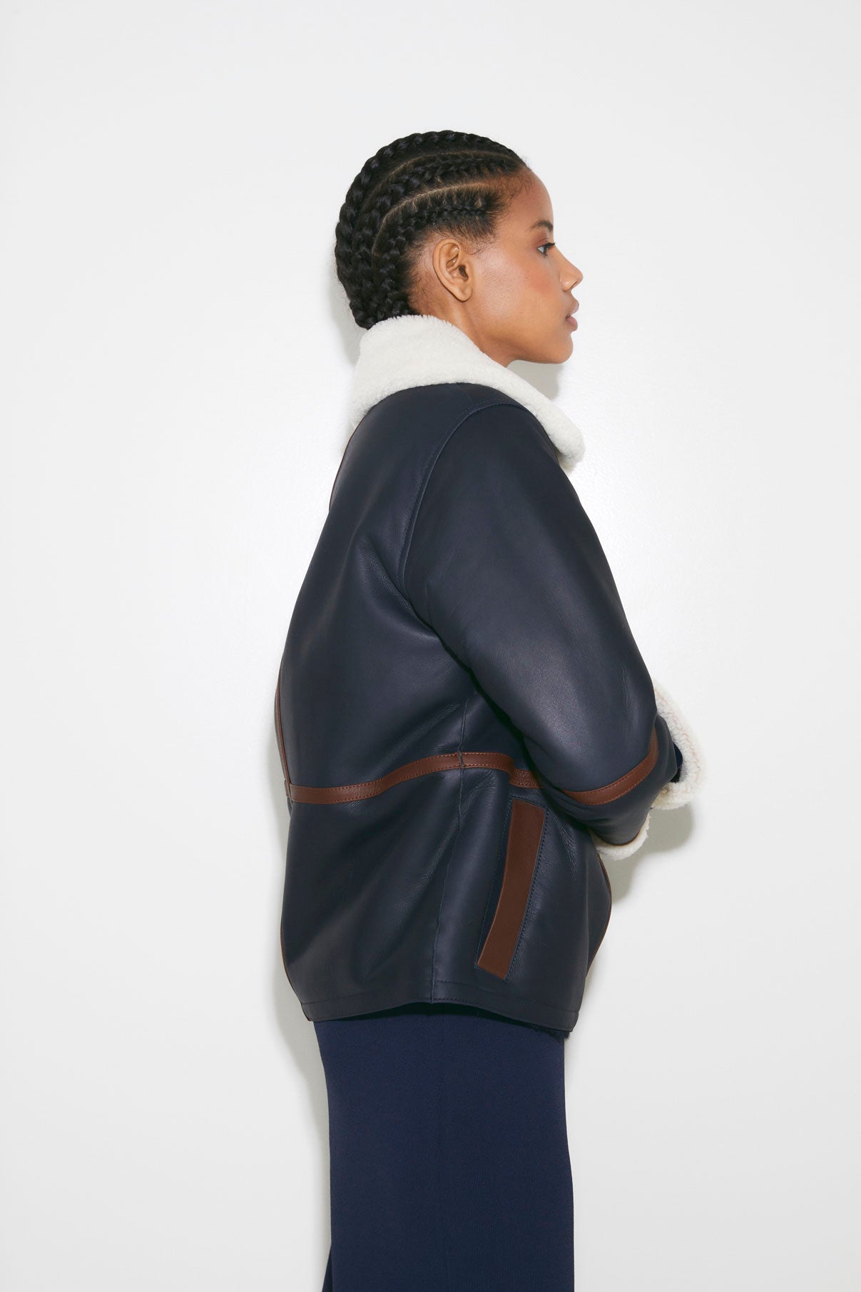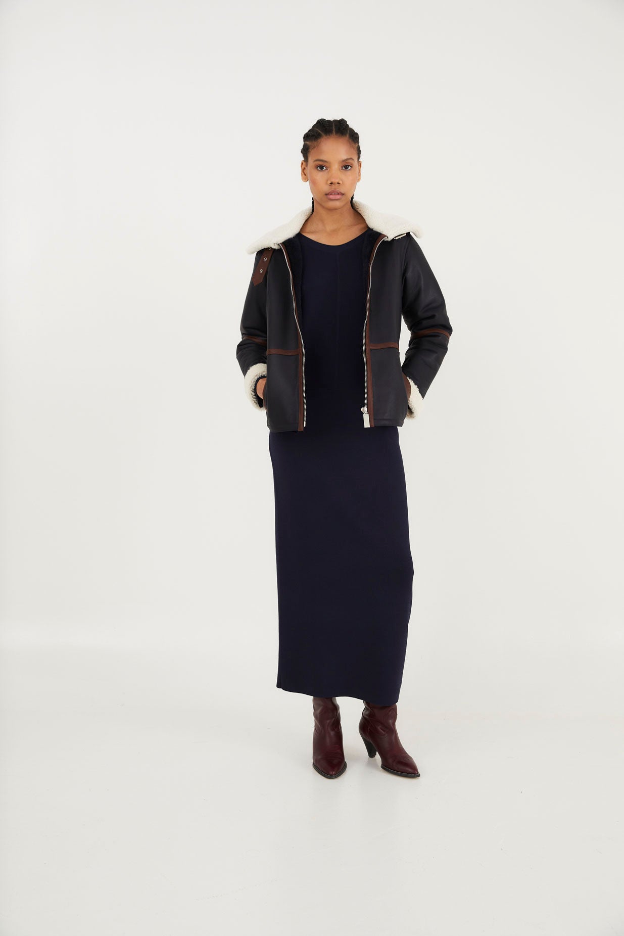 Nuestro abrigo Aviador color marino 100% piel vuelta de cordero español, tiene el cuello solapa, bolsillos laterales y cierre con cremallera en el delantero.