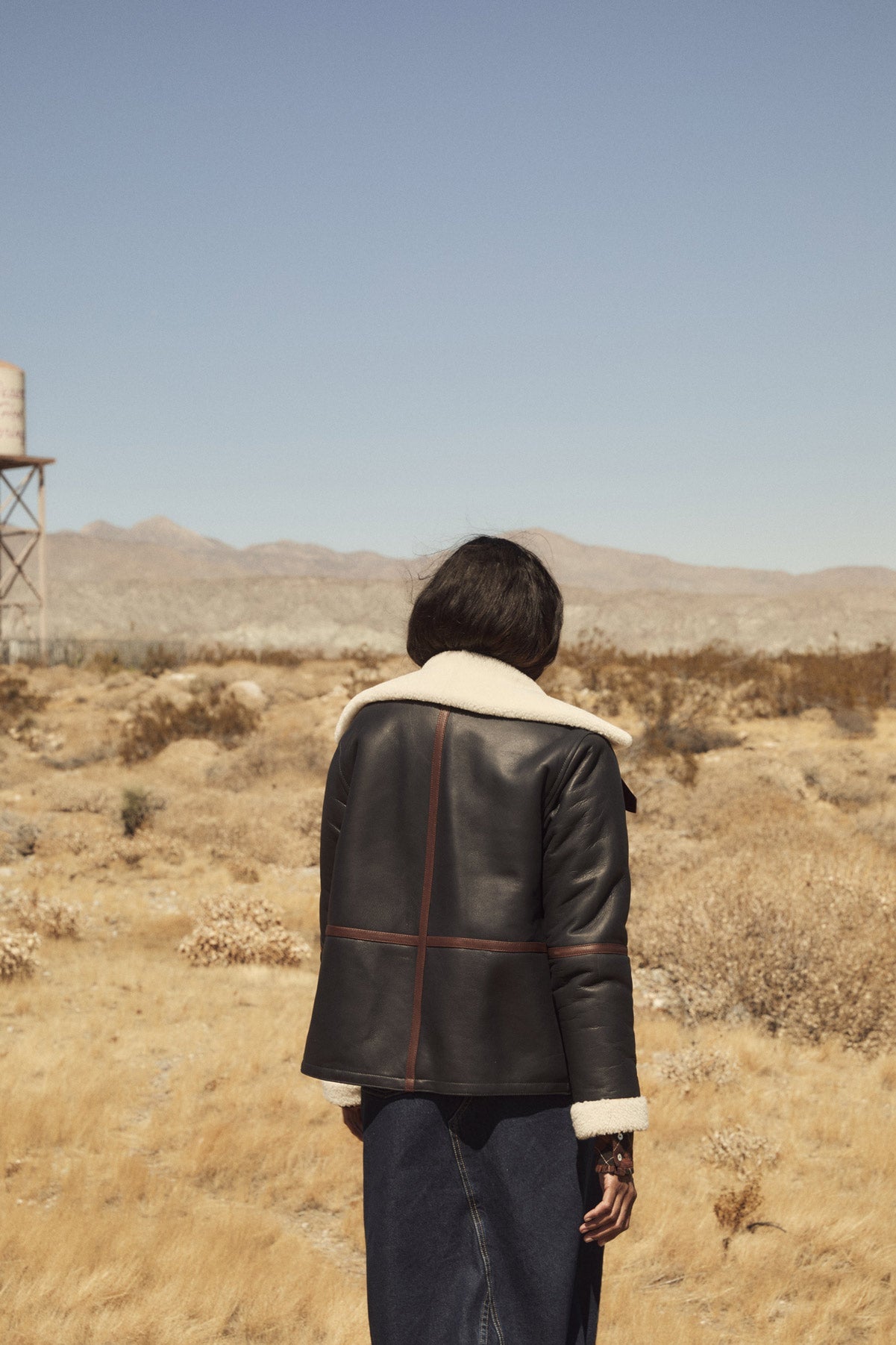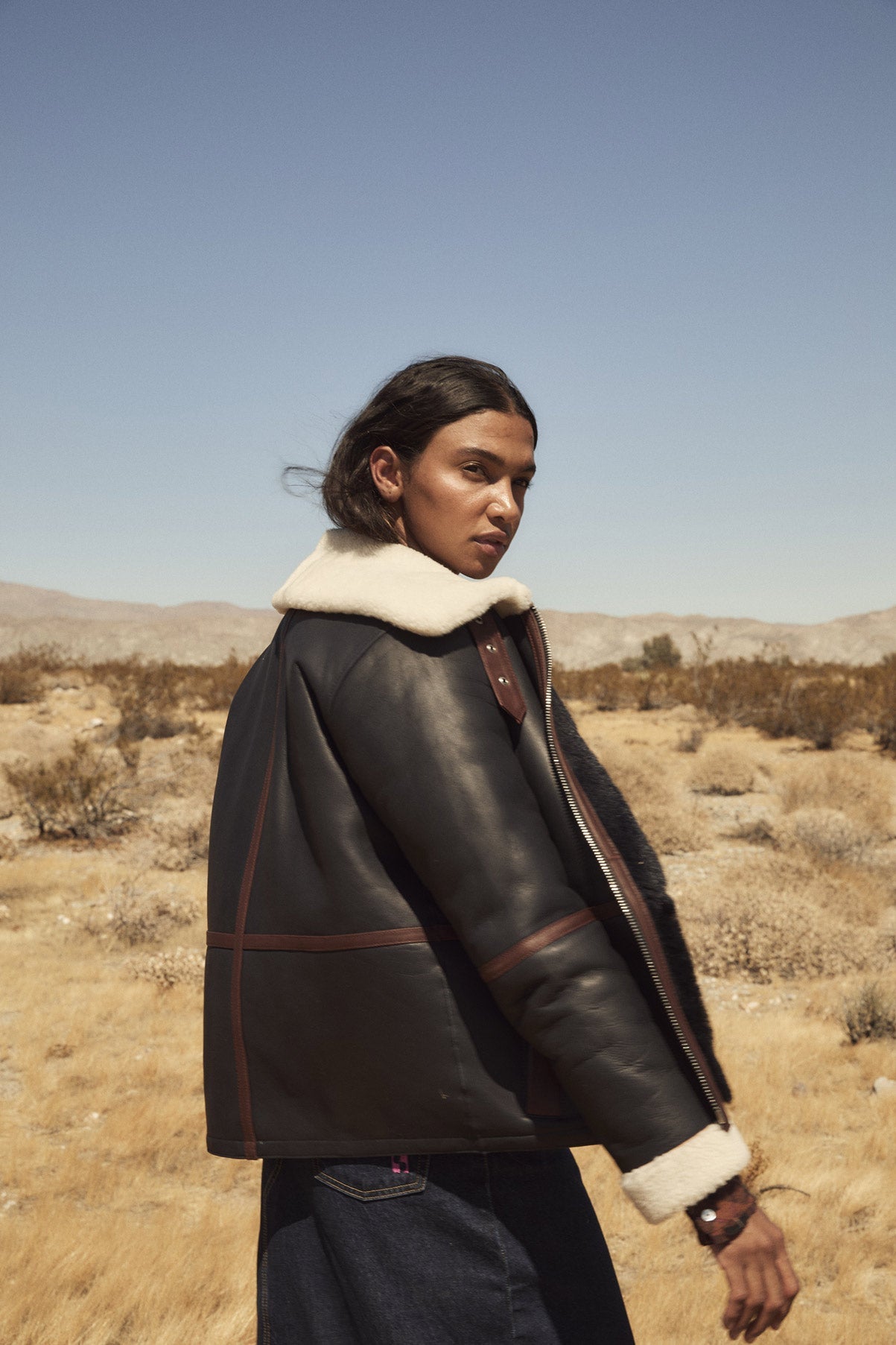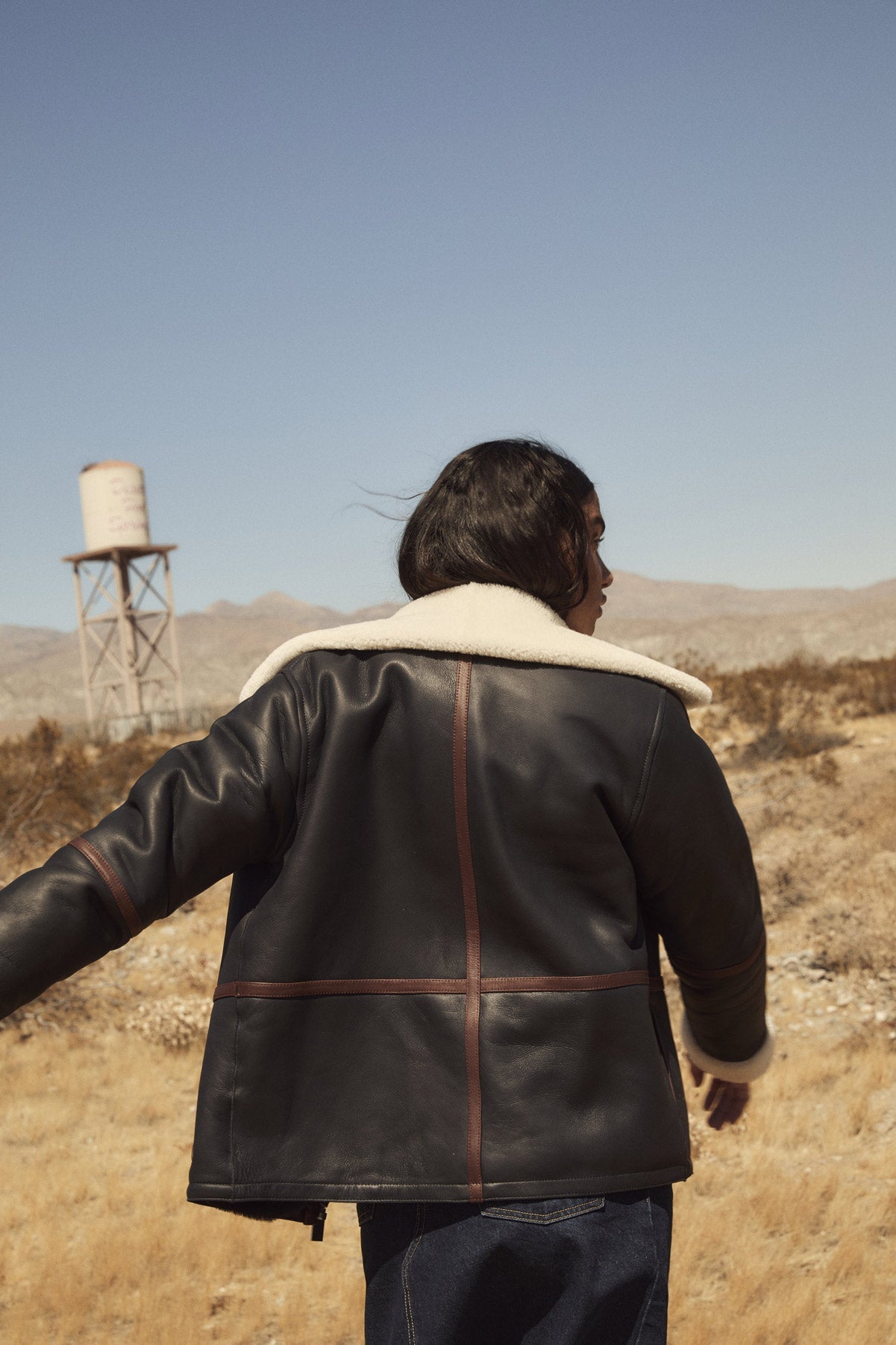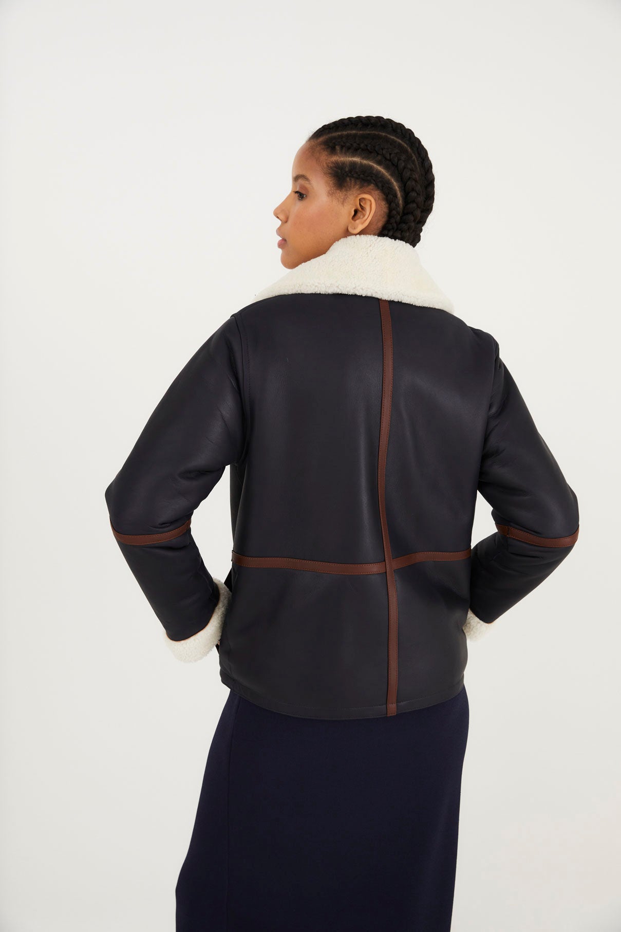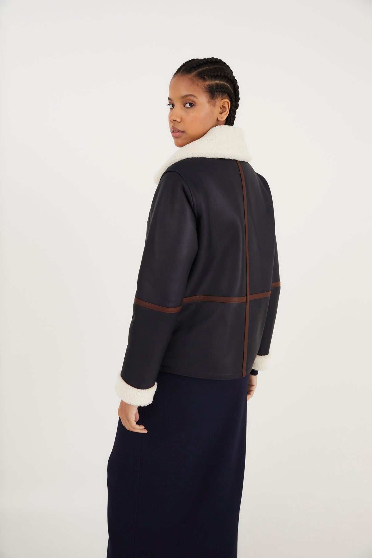 Nuestro abrigo Aviador color marino 100% piel vuelta de cordero español, tiene el cuello solapa, bolsillos laterales y cierre con cremallera en el delantero.