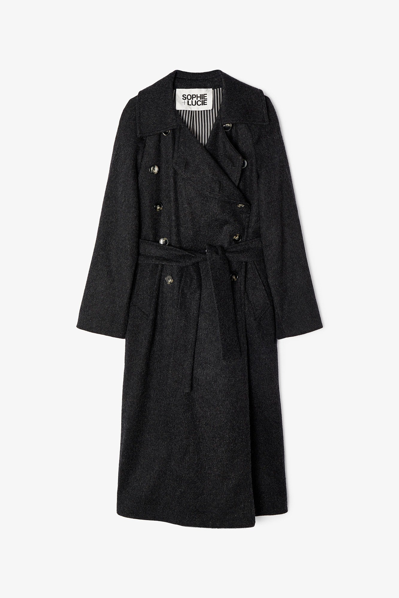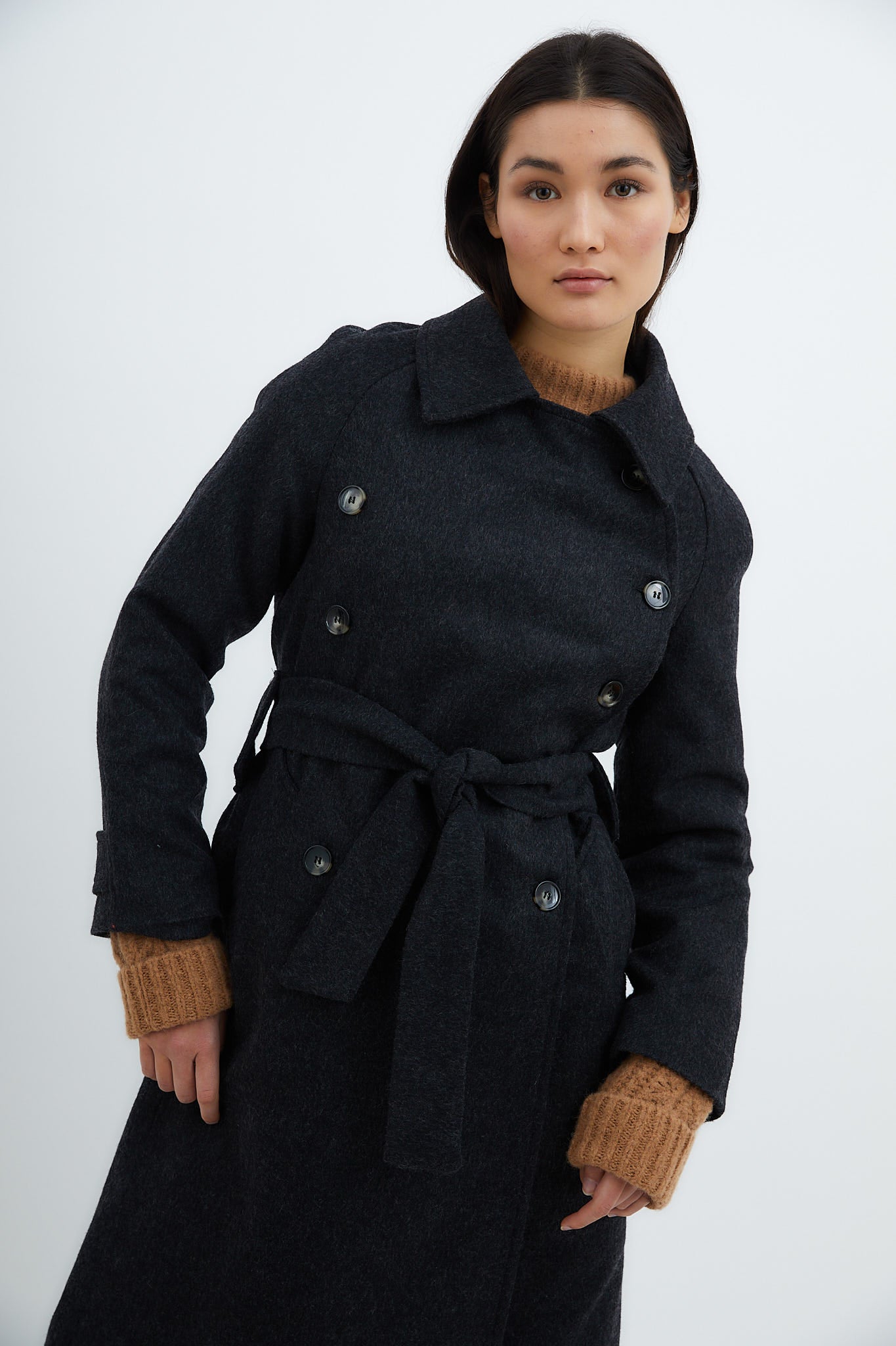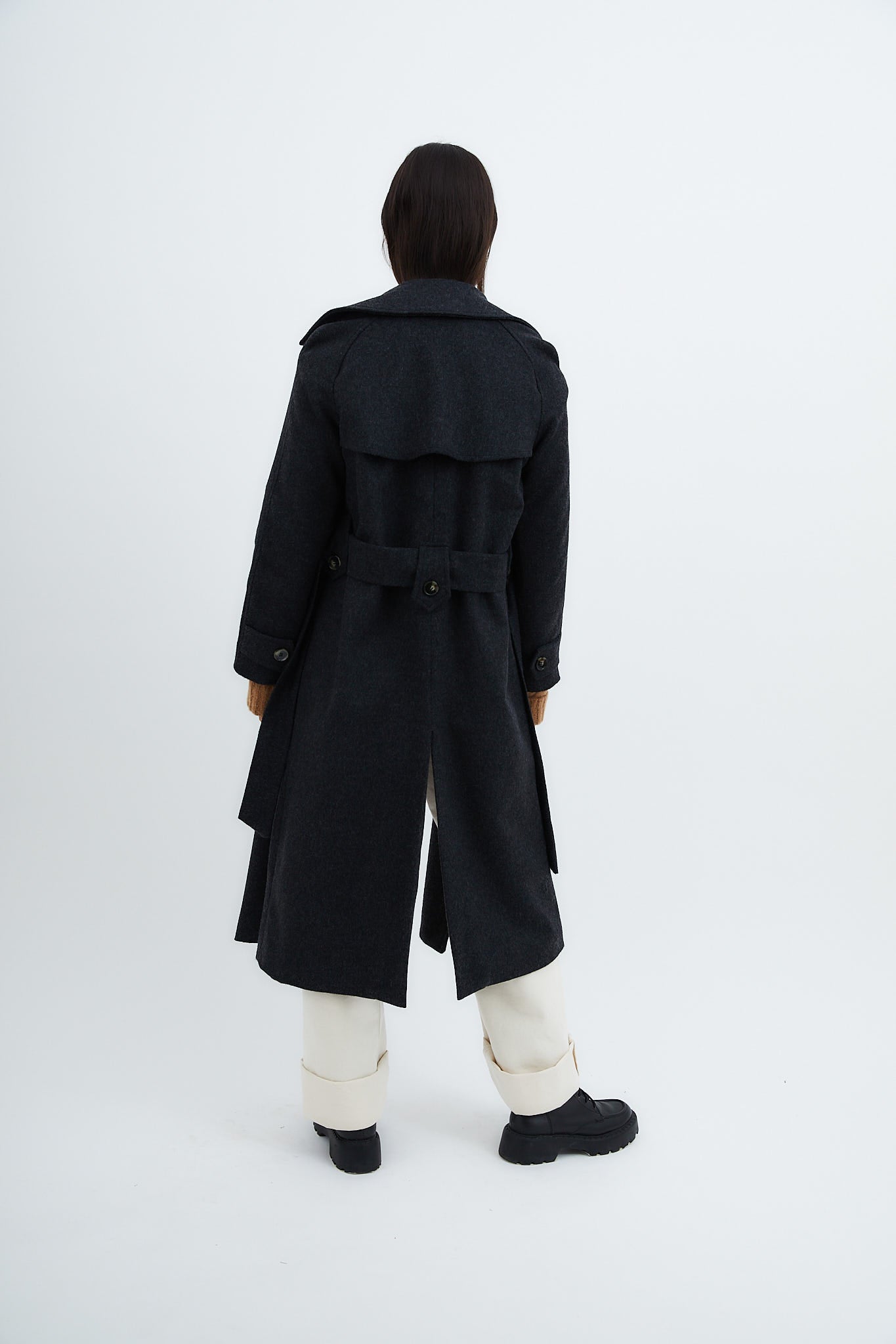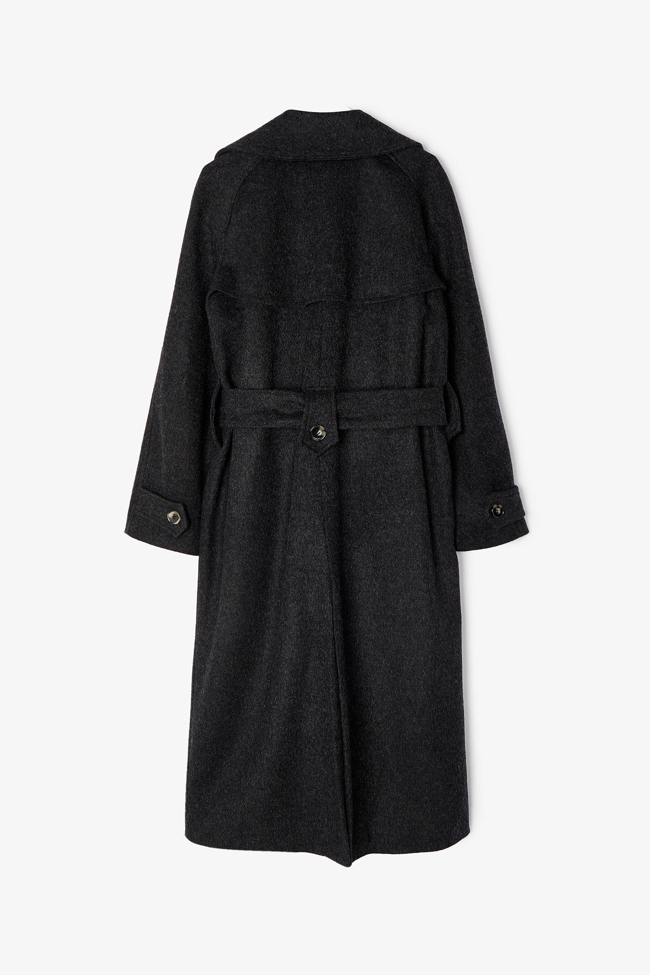 Abrigo confeccionado en tejido de lana color marengo. Cierre delantero con doble botonadura y cinturón en el mismo tejido. Bolsillos laterales y apertura trasera para dar movimiento.