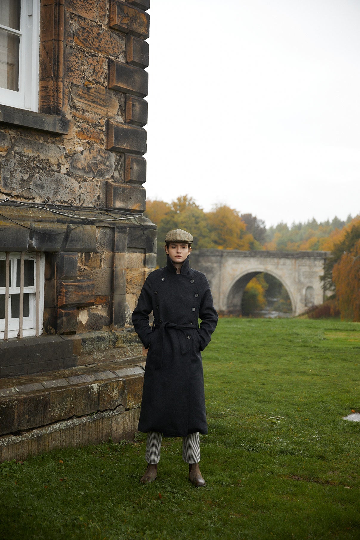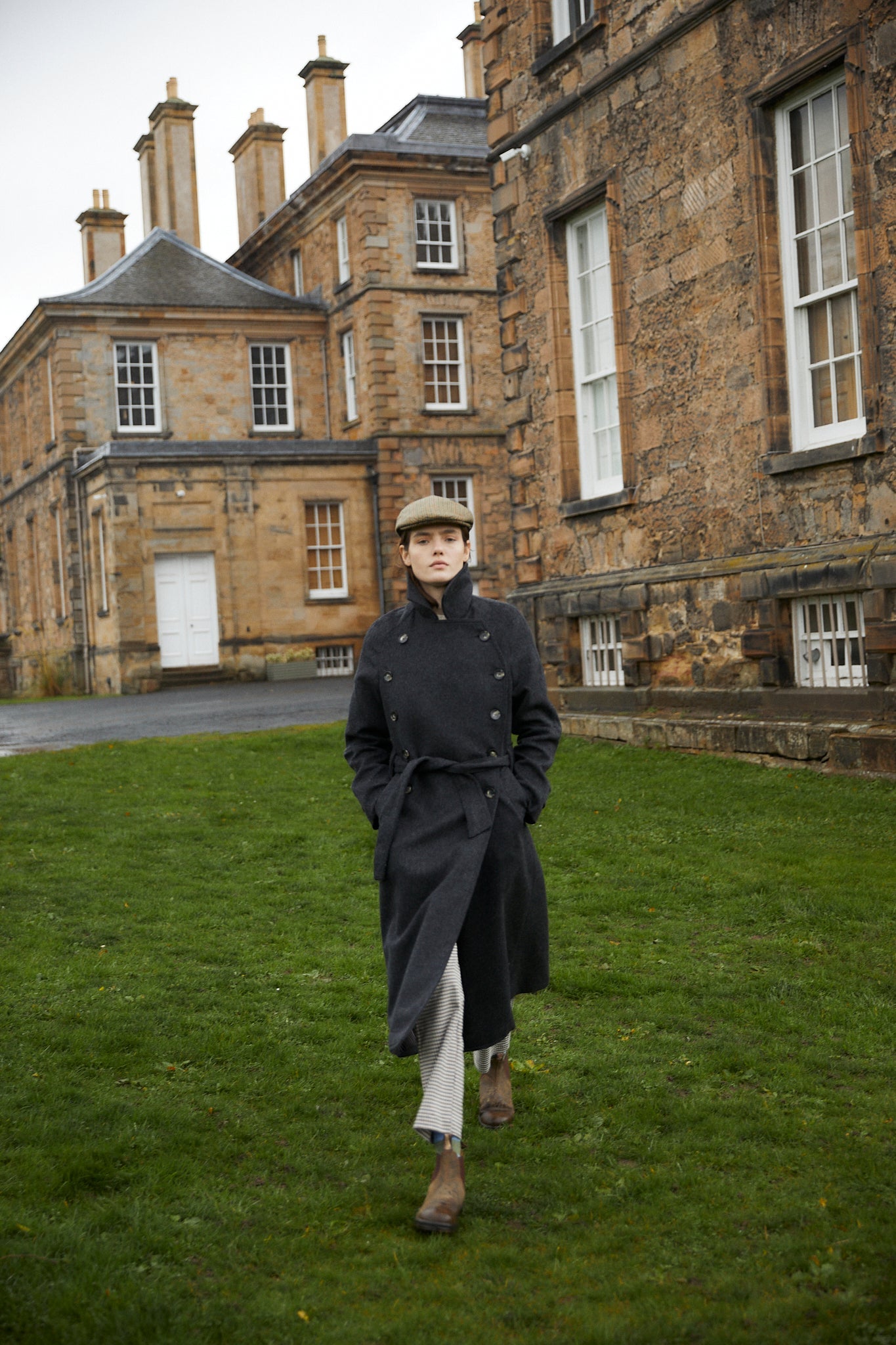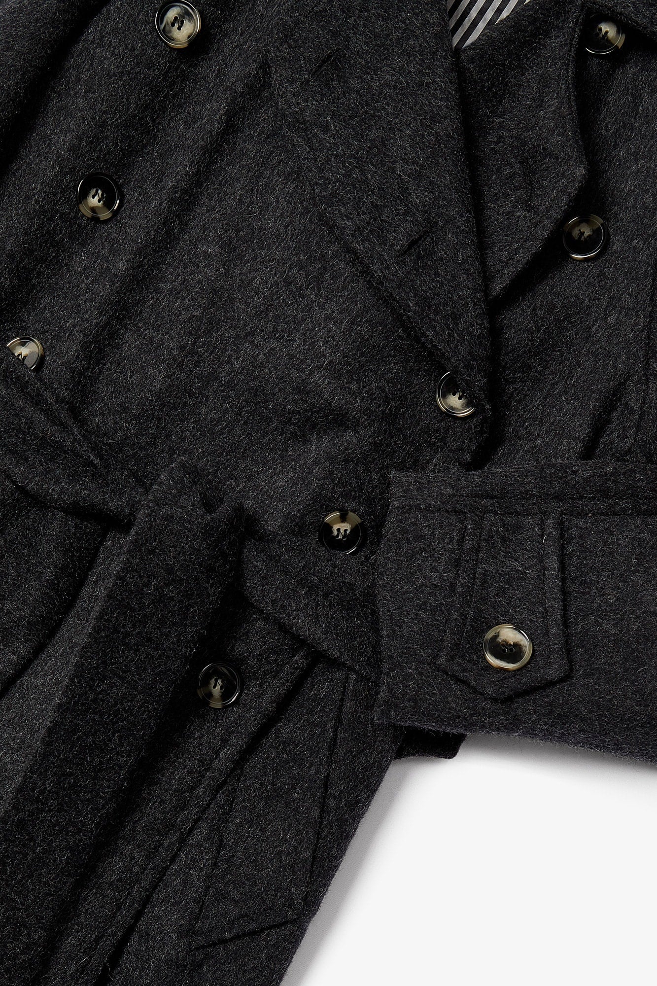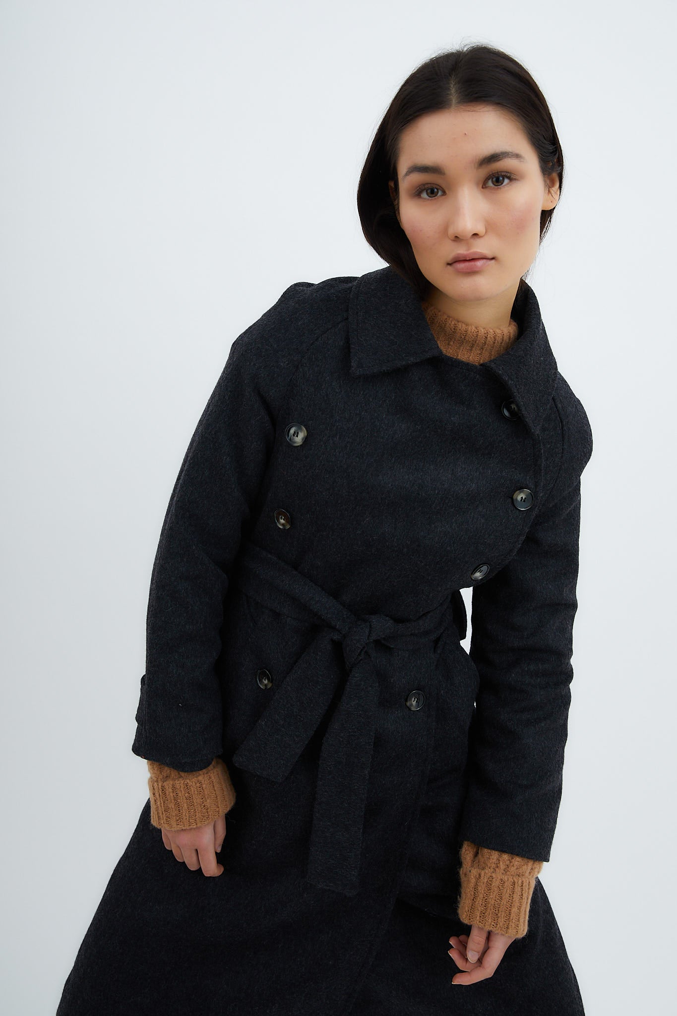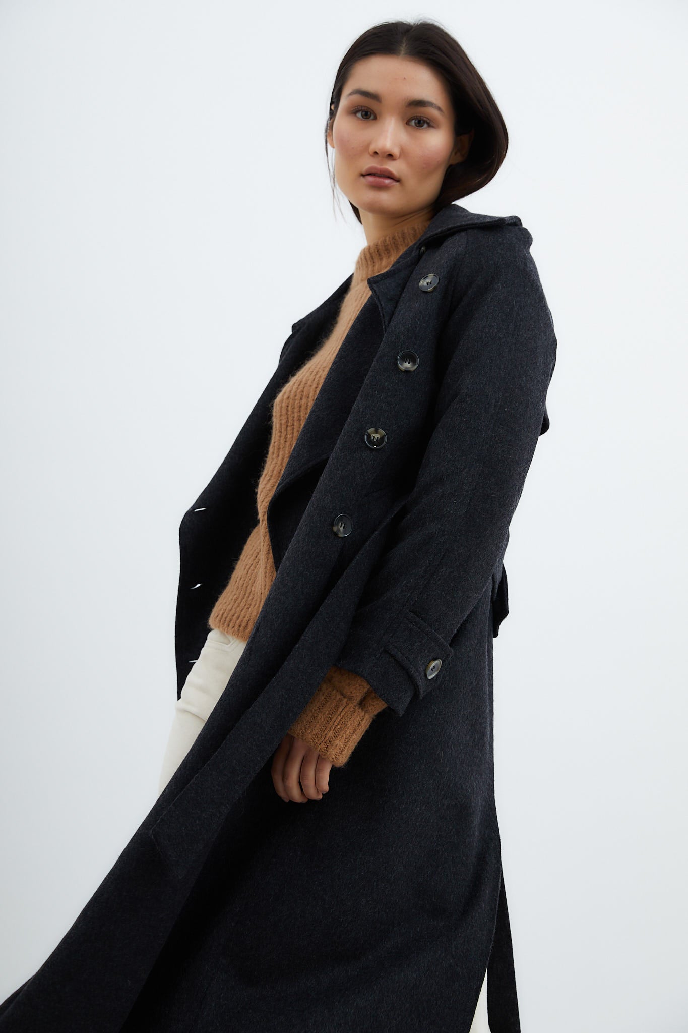 Abrigo confeccionado en tejido de lana color marengo. Cierre delantero con doble botonadura y cinturón en el mismo tejido. Bolsillos laterales y apertura trasera para dar movimiento.