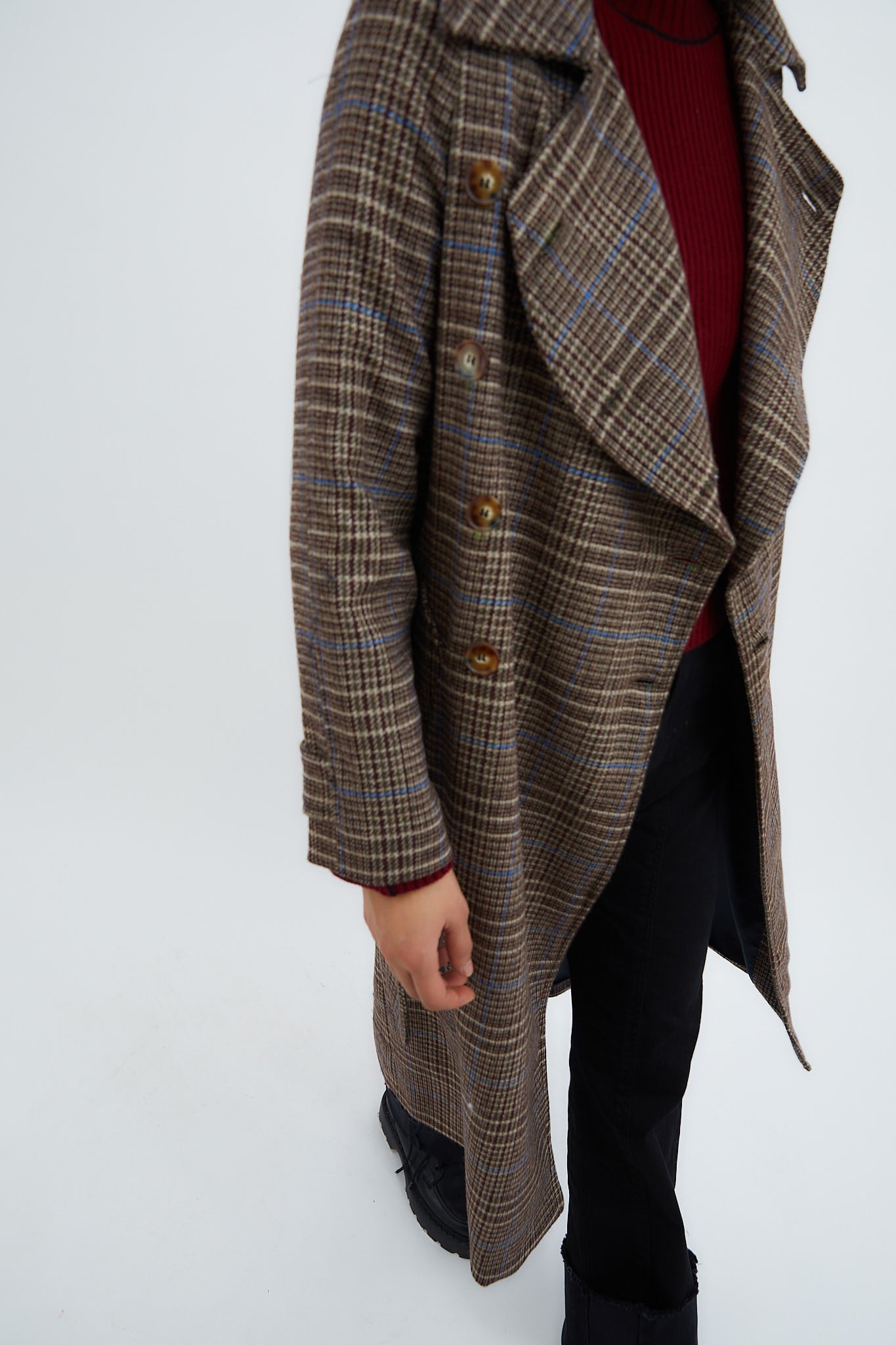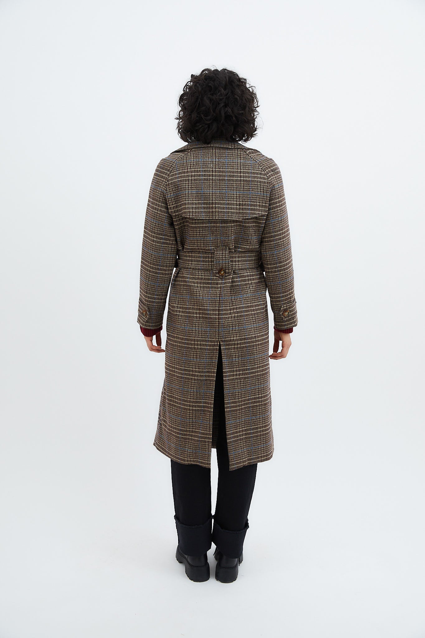 Abrigo confeccionado en tejido de cuadros marrón. Cierre delantero con doble botonadura y cinturón en el mismo tejido. Bolsillos laterales y apertura trasera para dar movimiento.