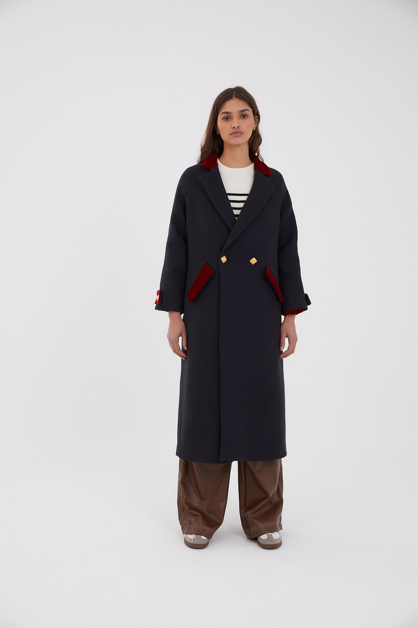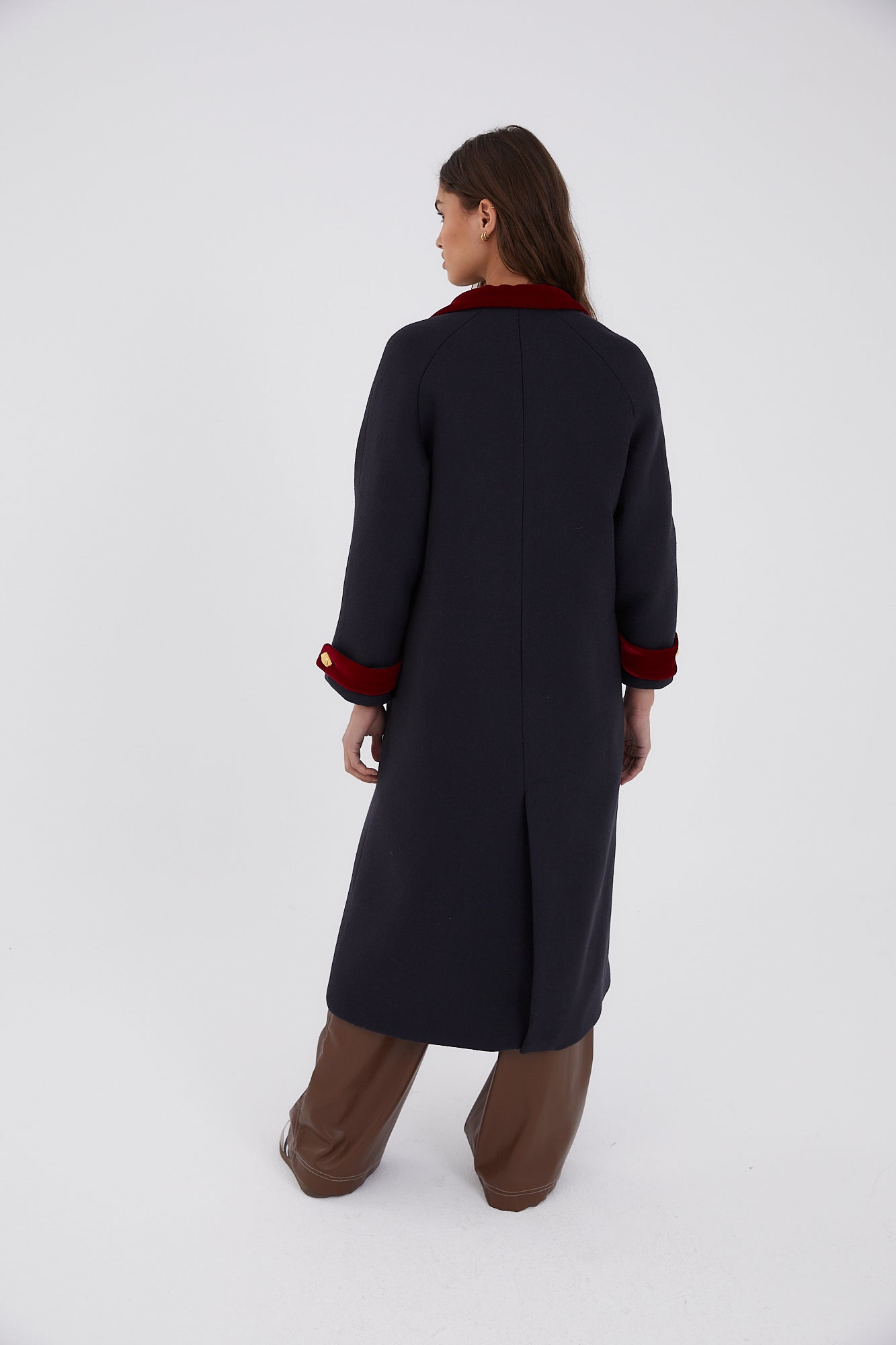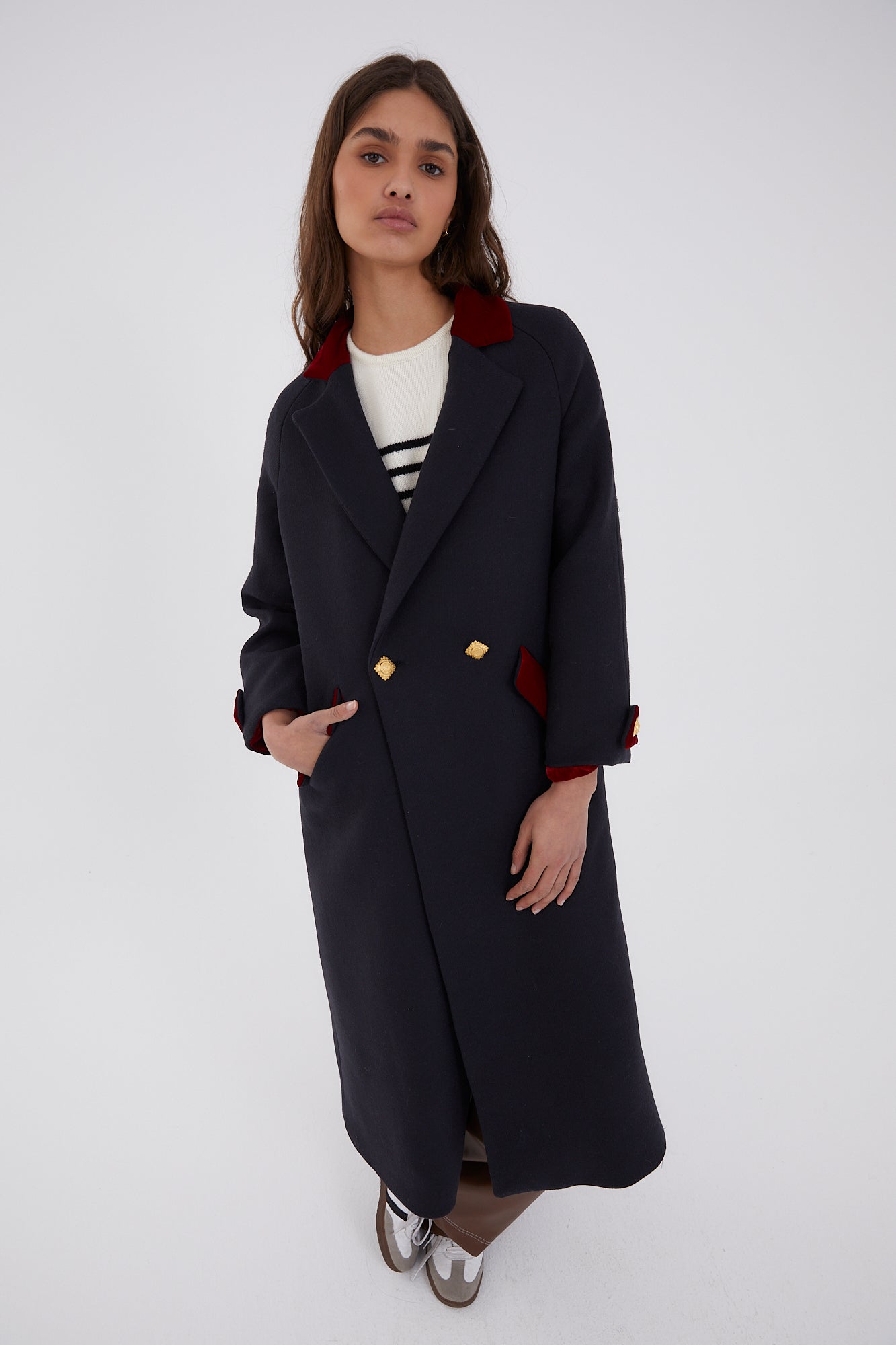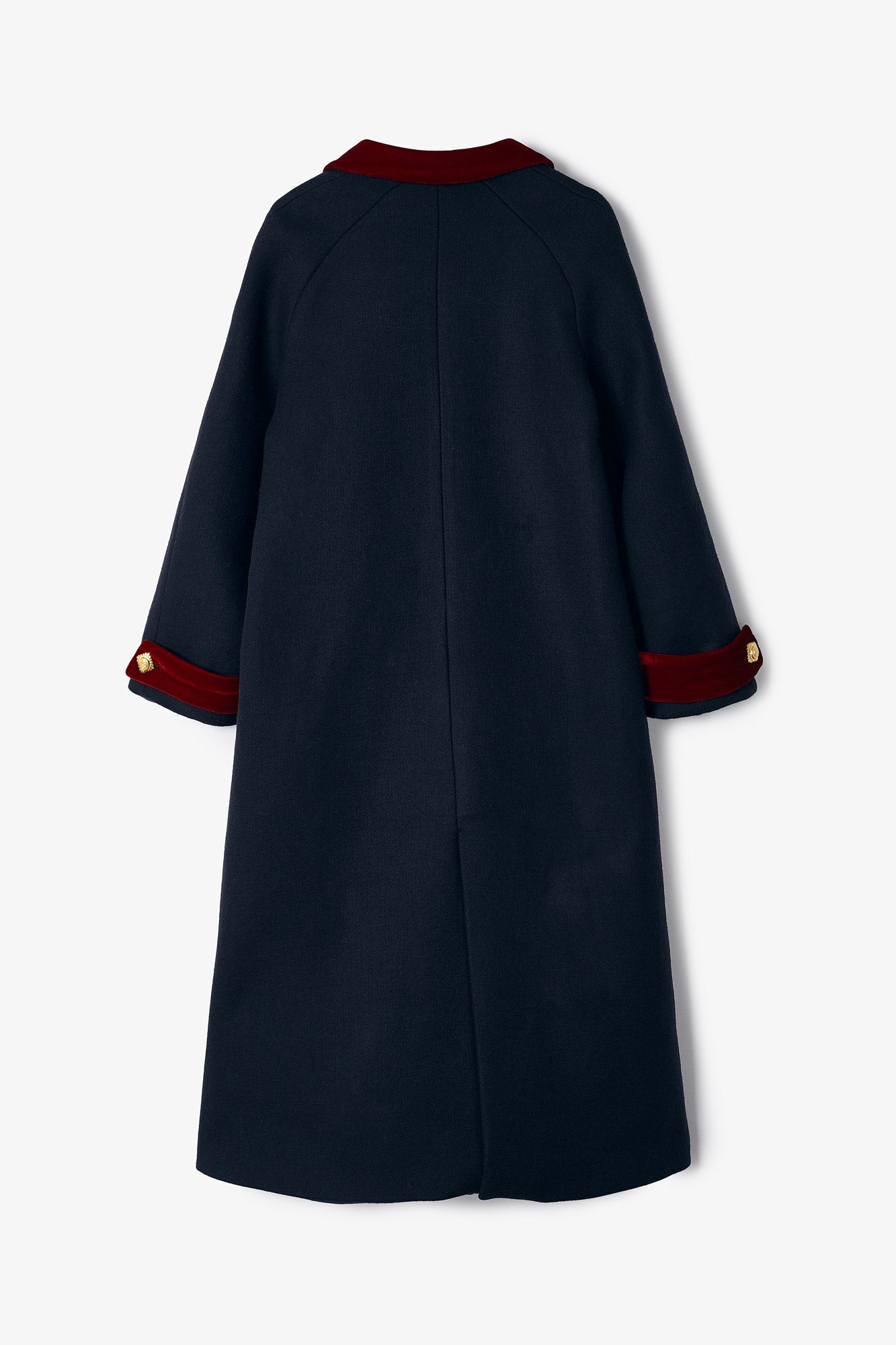 Abrigo largo oversize con cuello de solapa, bolsillos en el frontal y cierre cruzado con doble botonadura dorada. Detalle de terciopelo color rojo en las zonas de cuello, bolsillo y mangas.