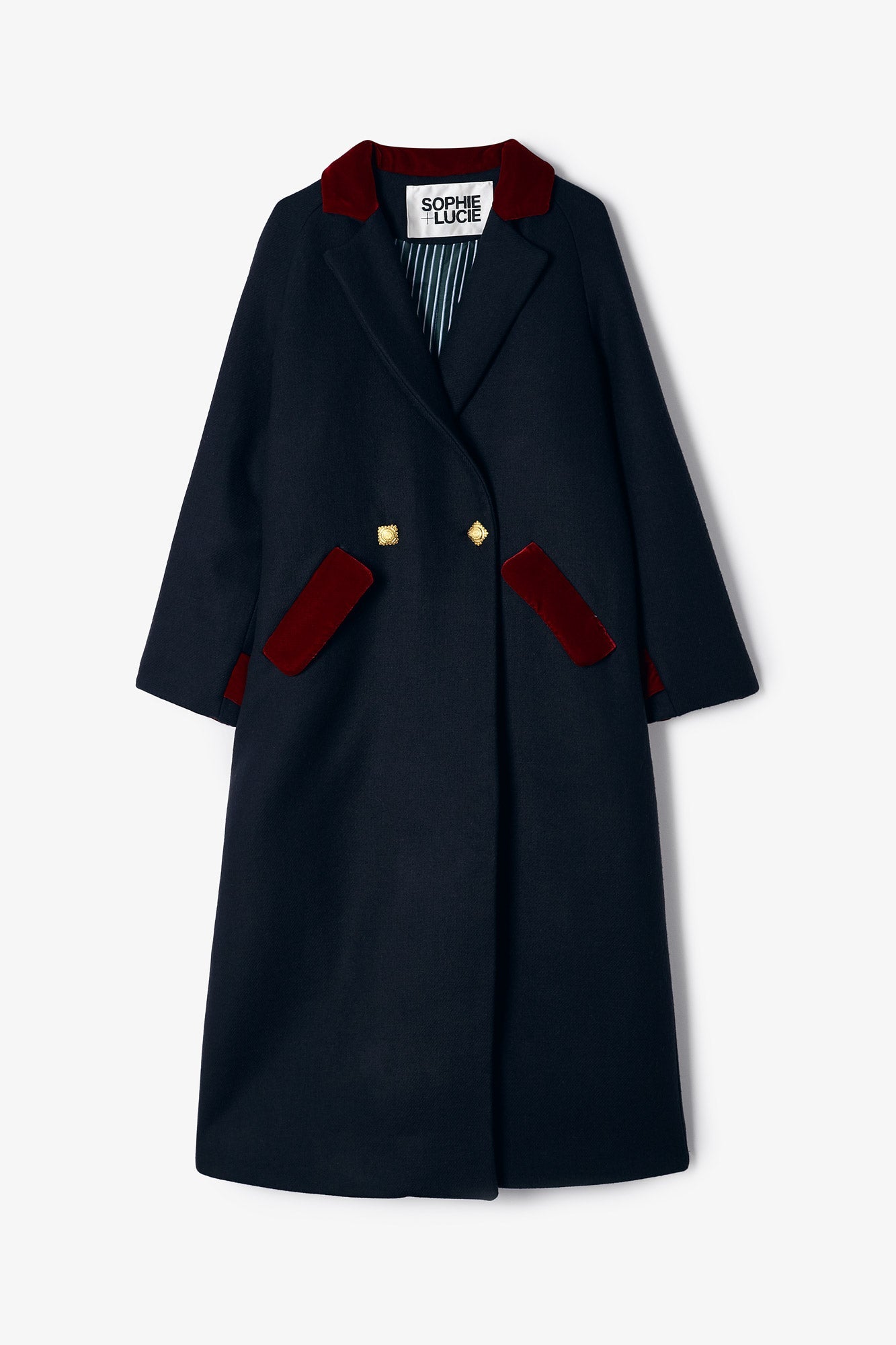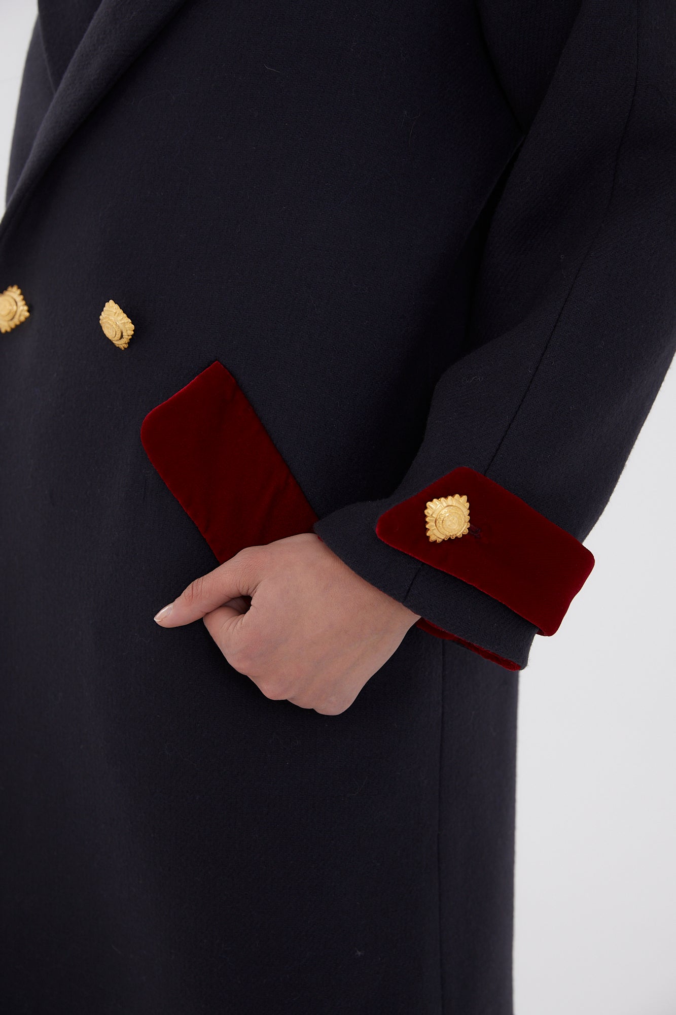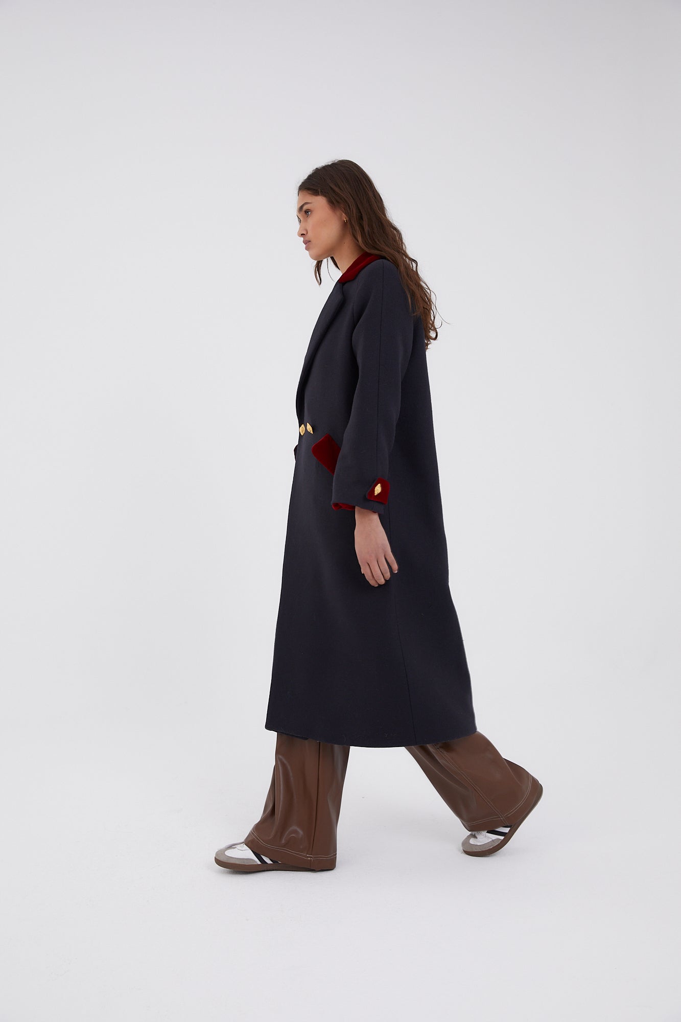 Abrigo largo oversize con cuello de solapa, bolsillos en el frontal y cierre cruzado con doble botonadura dorada. Detalle de terciopelo color rojo en las zonas de cuello, bolsillo y mangas.