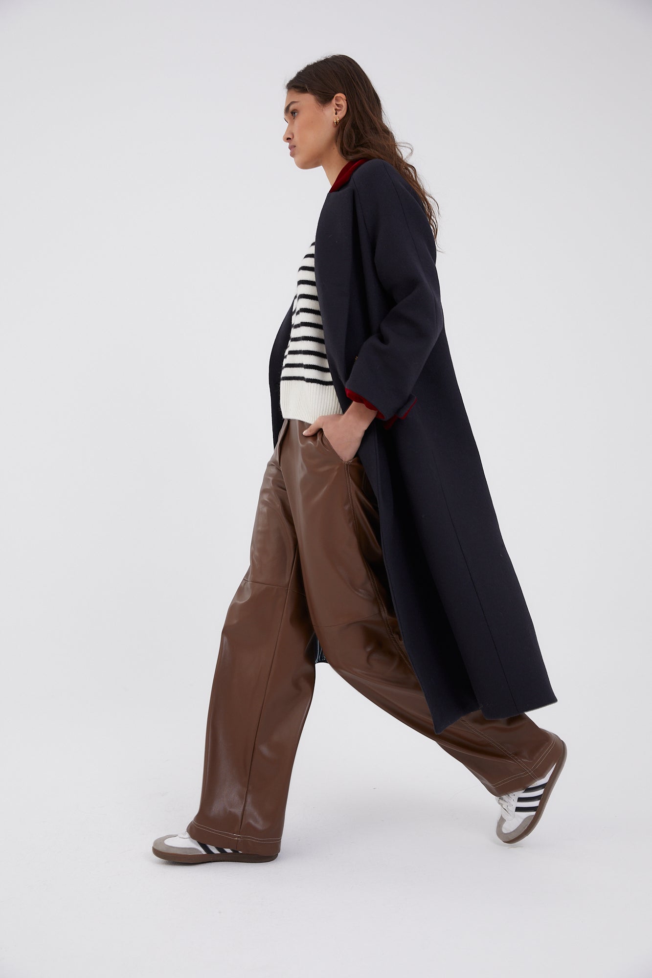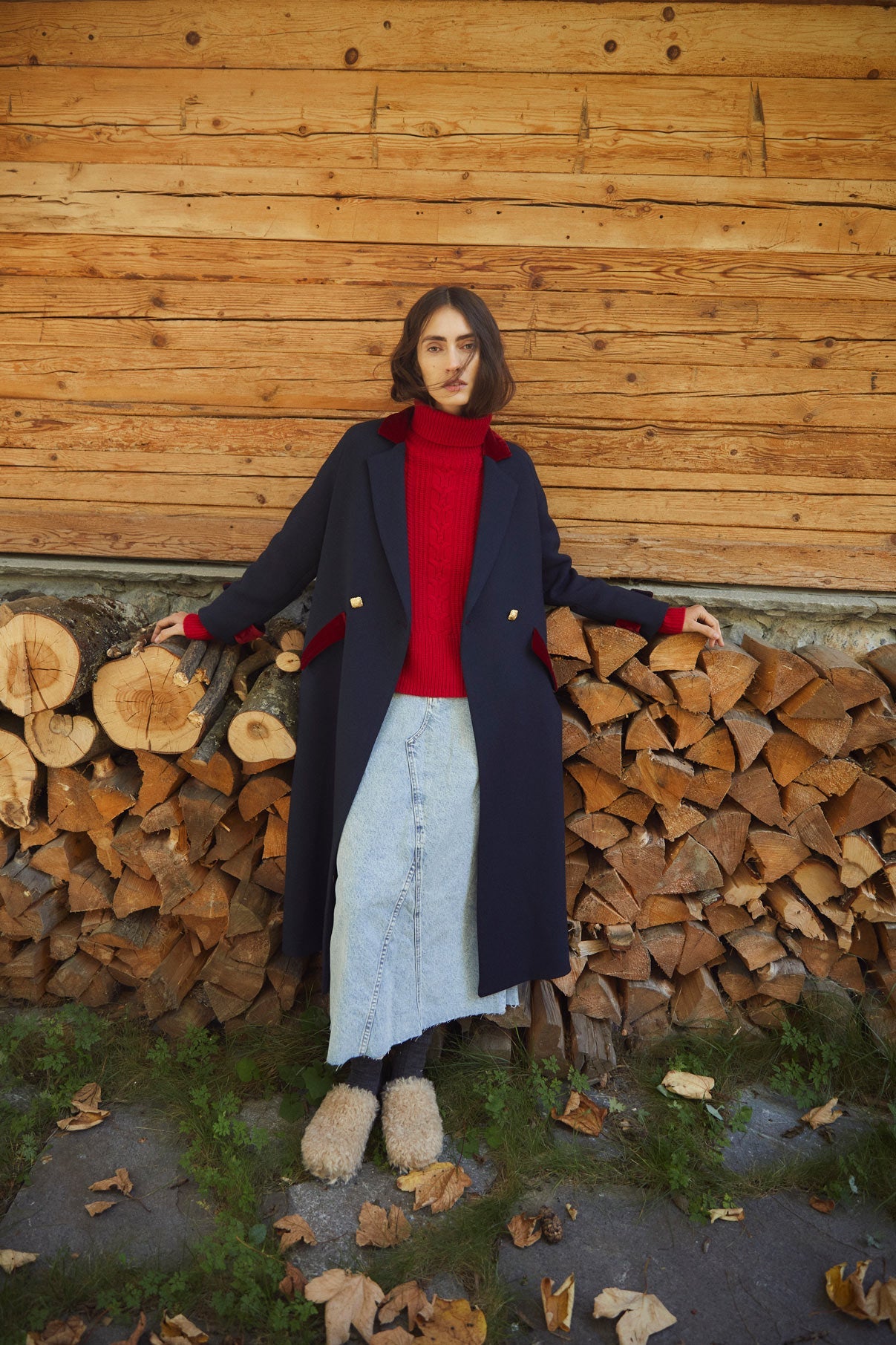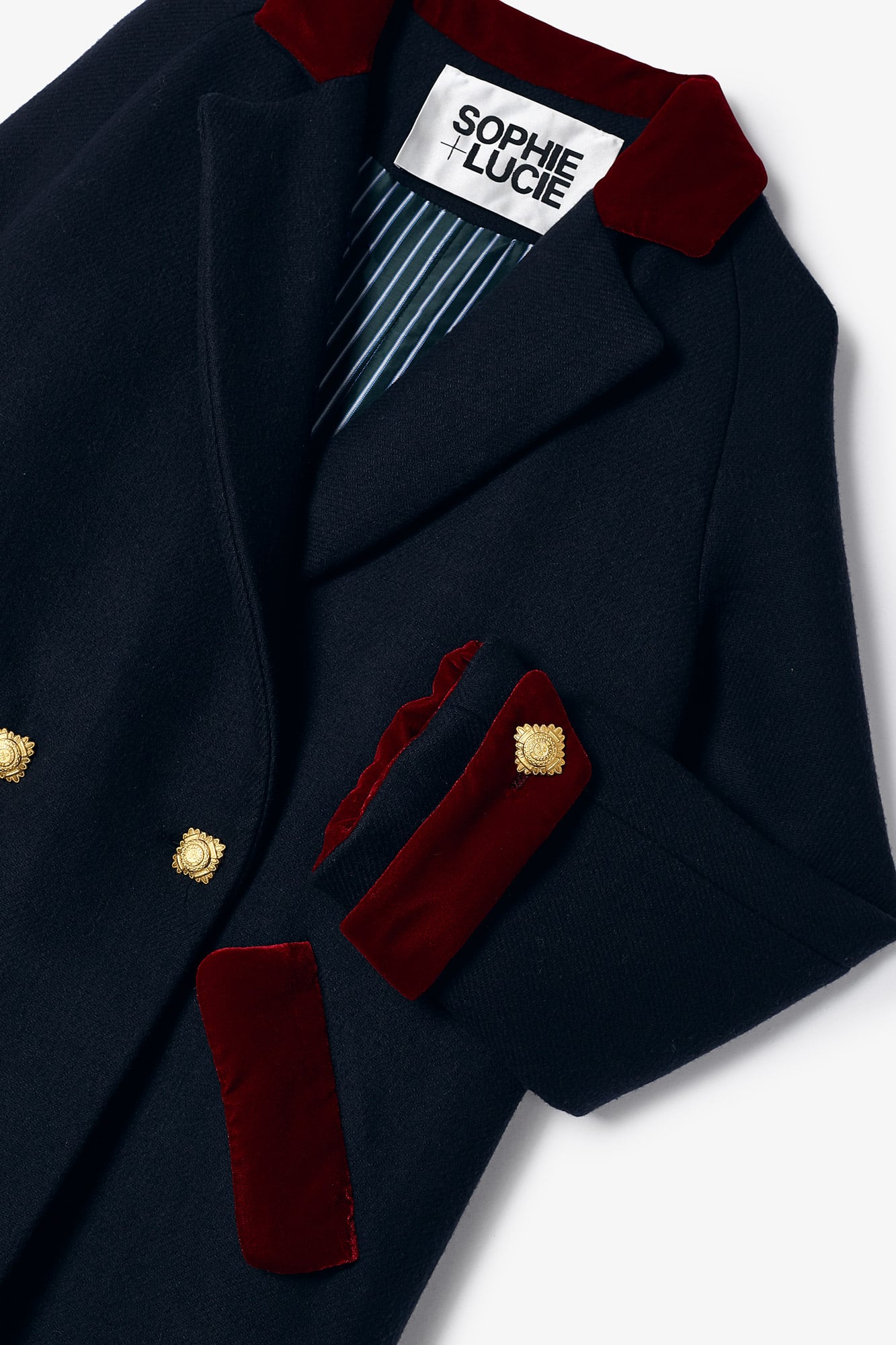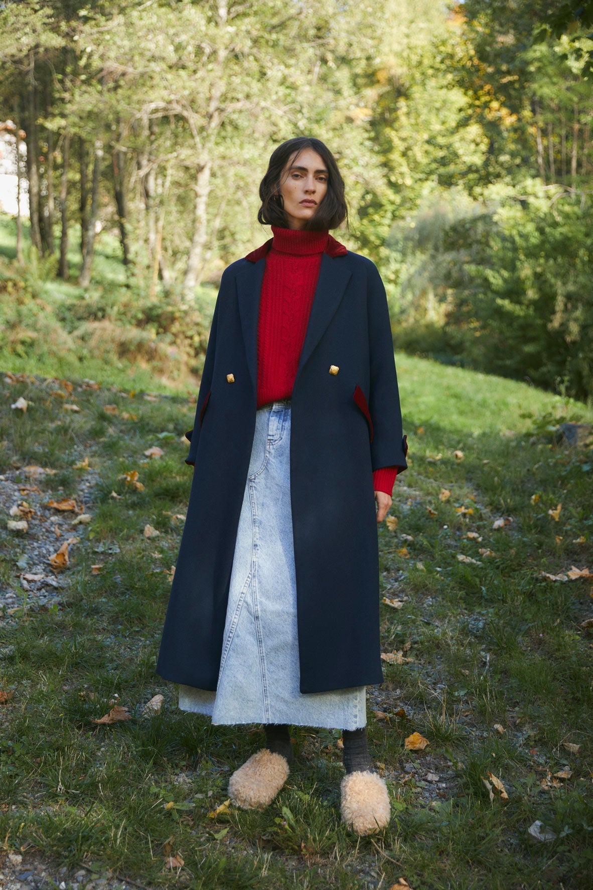 Abrigo largo oversize con cuello de solapa, bolsillos en el frontal y cierre cruzado con doble botonadura dorada. Detalle de terciopelo color rojo en las zonas de cuello, bolsillo y mangas.