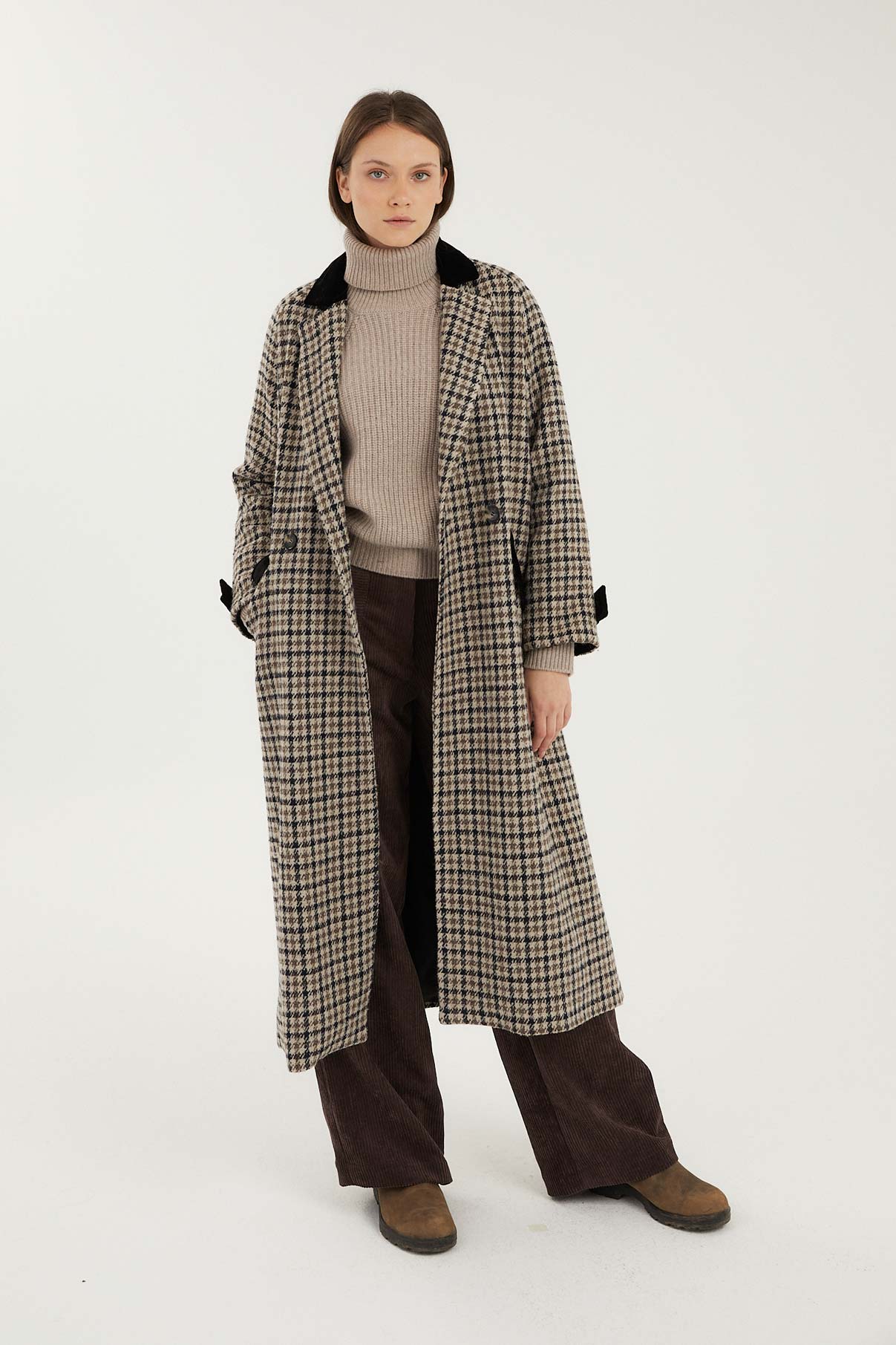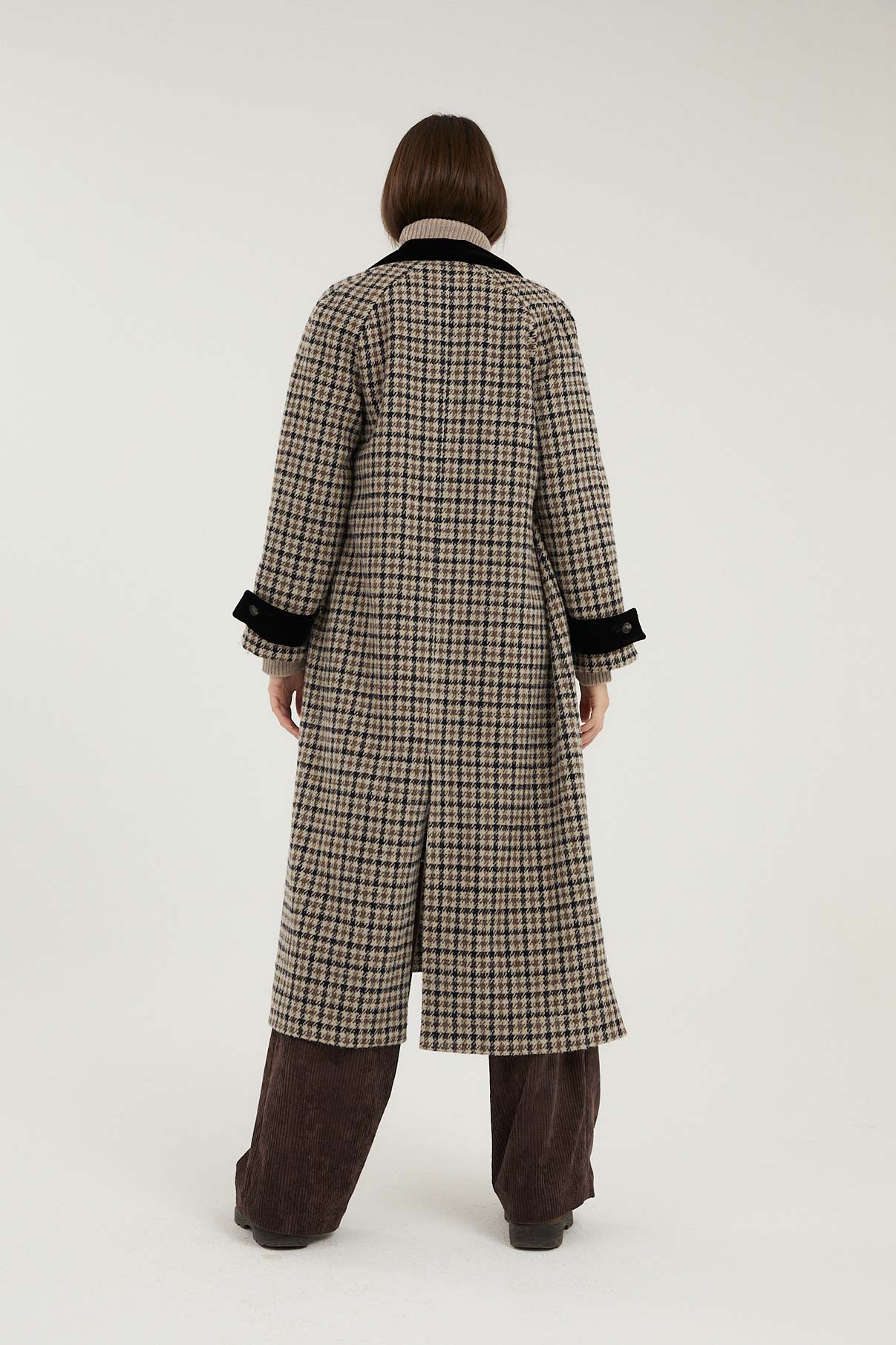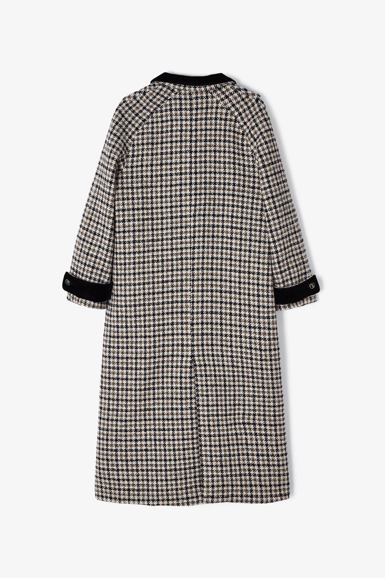 Abrigo largo de cuadros con cuello sastre. Bolsillos laterales y abertura trasera. Detalle de tejido de terciopelo haciendo contraste en la parte de cuello, mangas y bolsillos. Abertura trasera. Cierre con doble botón.
