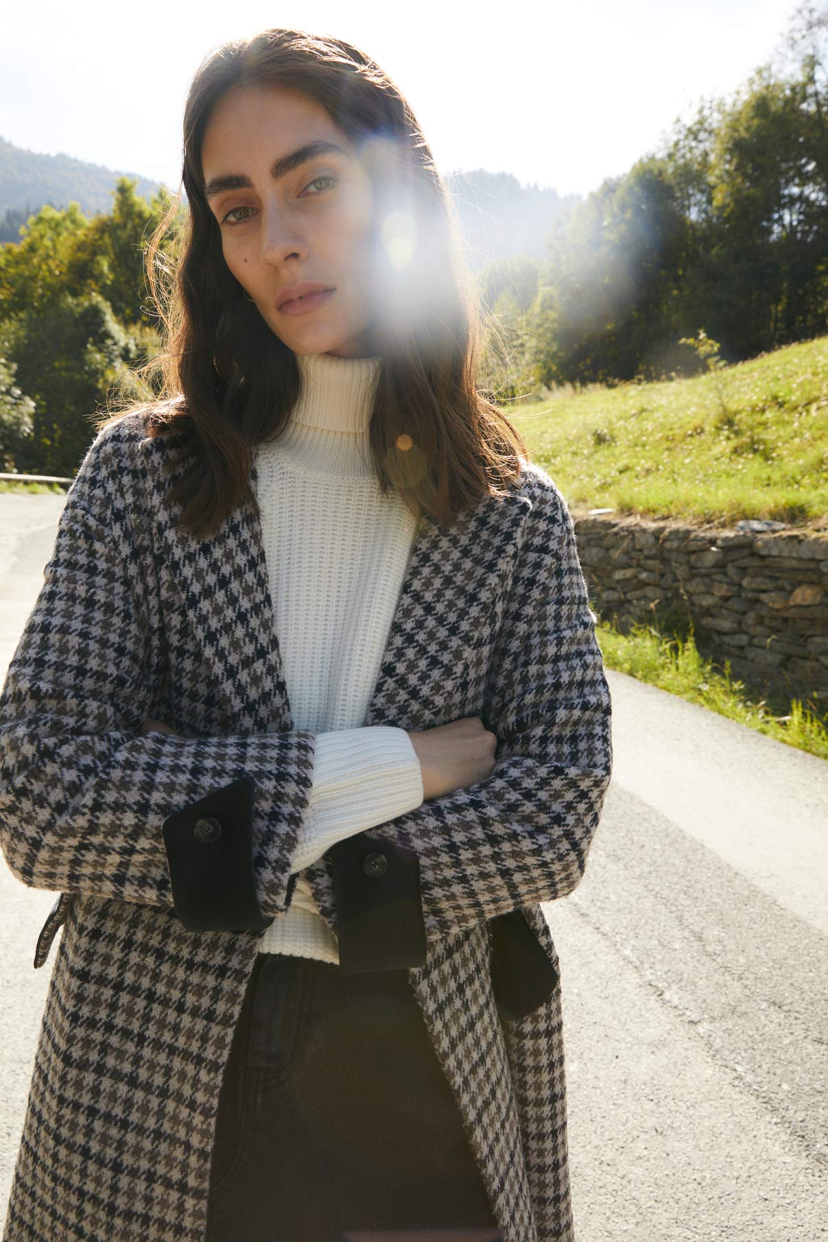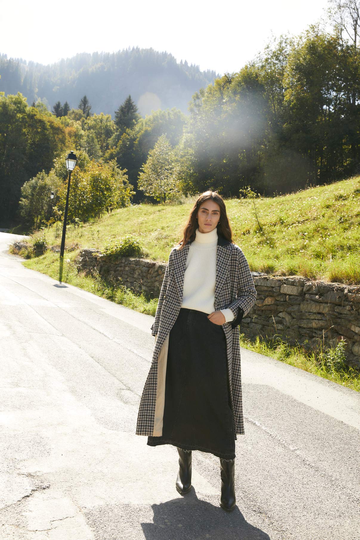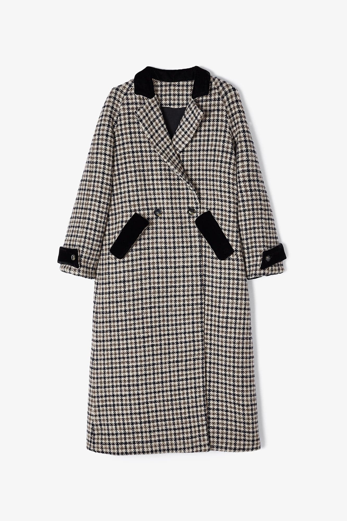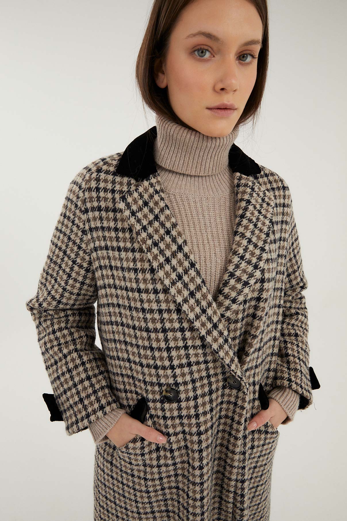 Abrigo largo de cuadros con cuello sastre. Bolsillos laterales y abertura trasera. Detalle de tejido de terciopelo haciendo contraste en la parte de cuello, mangas y bolsillos. Abertura trasera. Cierre con doble botón.