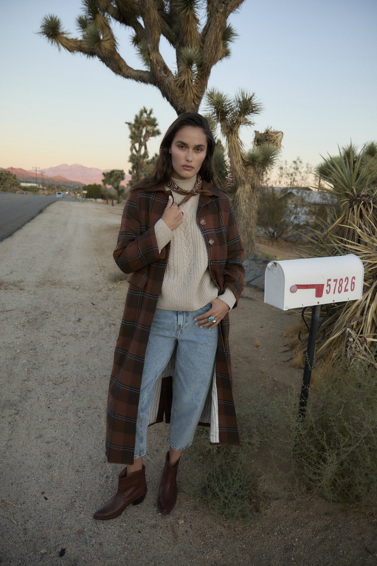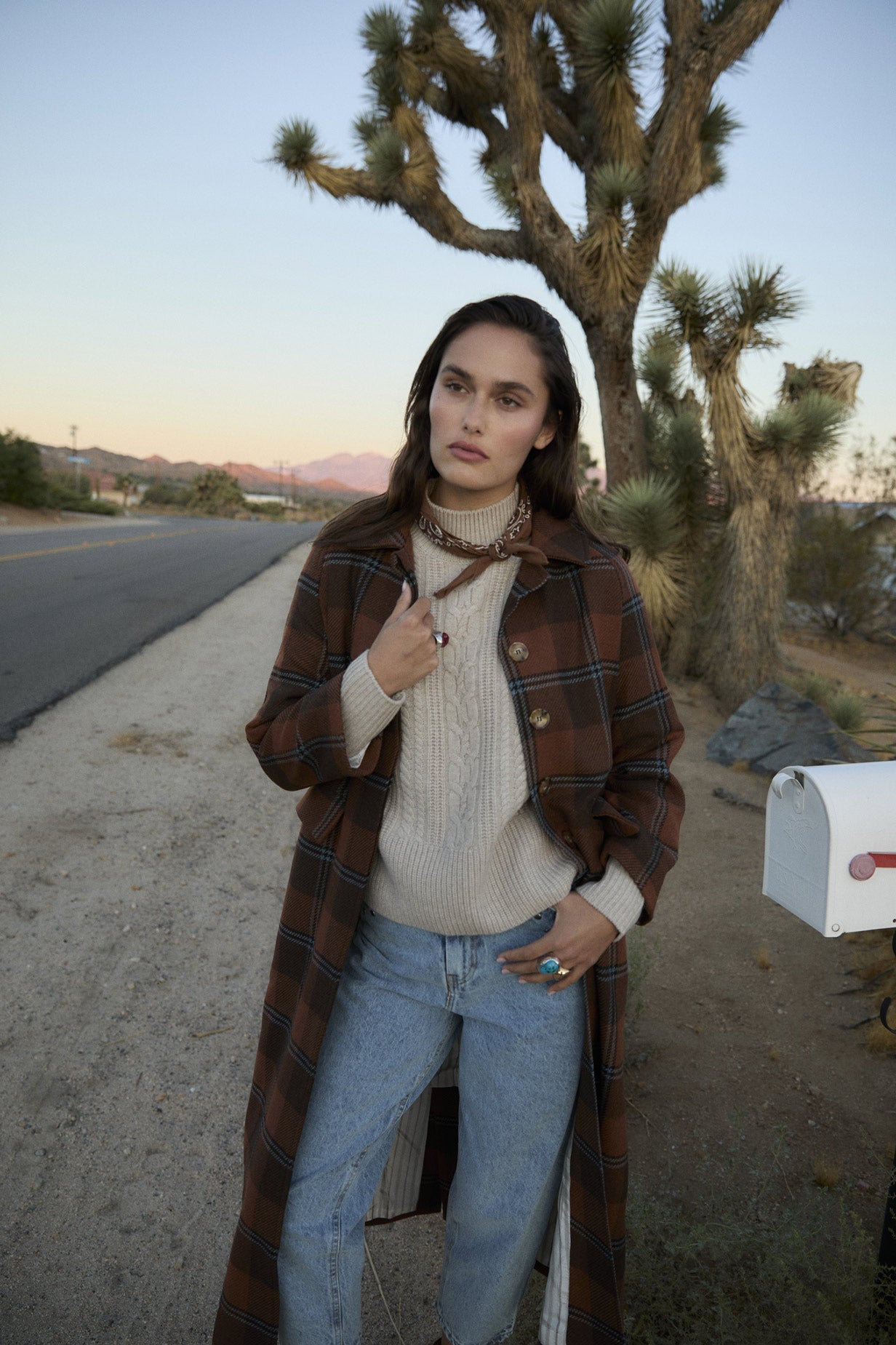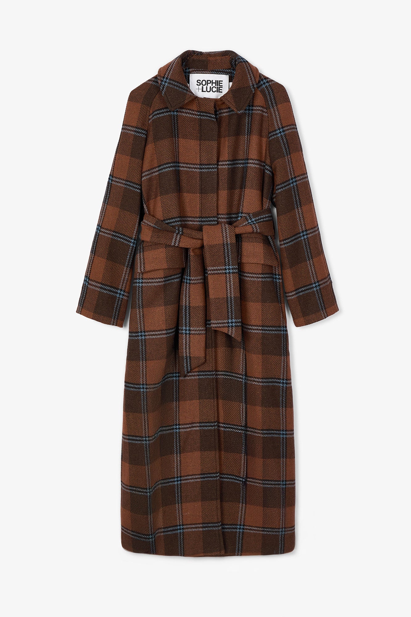 Este abrigo es de corte largo y tiene un diseño clásico de cuadros en tonos marrones, lo que le da un estilo elegante y atemporal. Corte recto y amplio, que cae hasta los tobillos. Bolsillos en los laterales. Cierre con botones carey en el delantero. Detalle de cinturón atado con el mismo tejido.