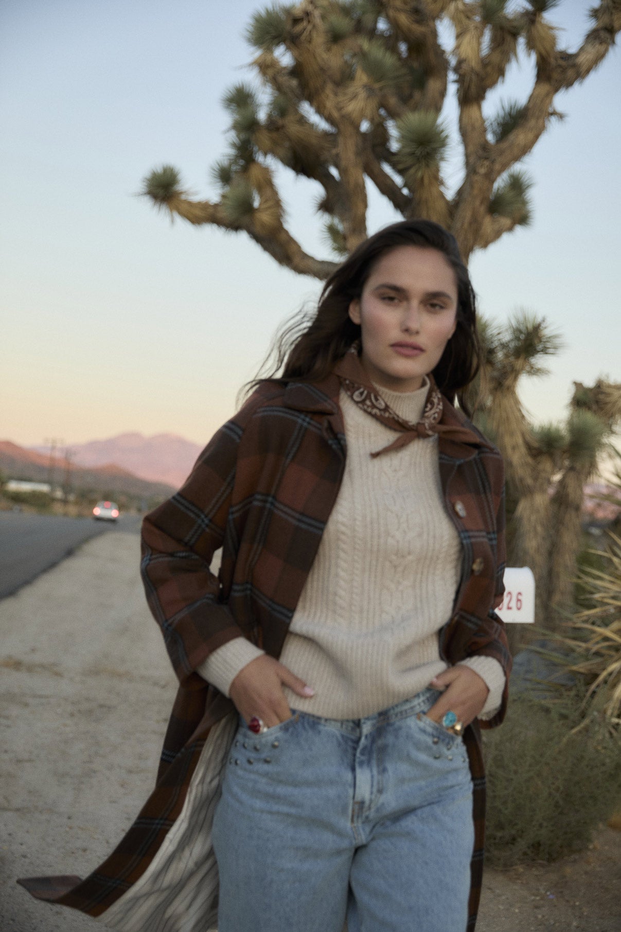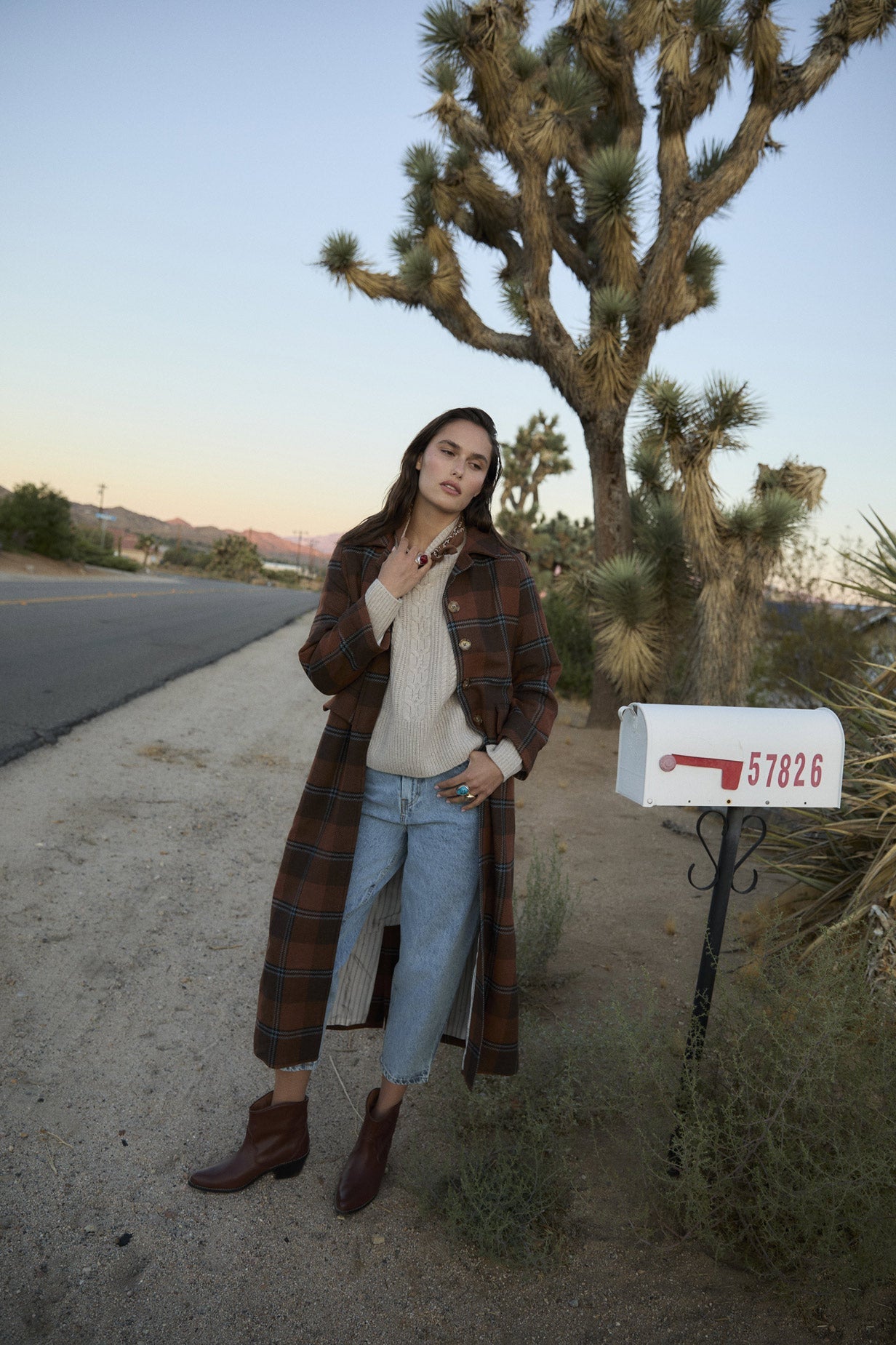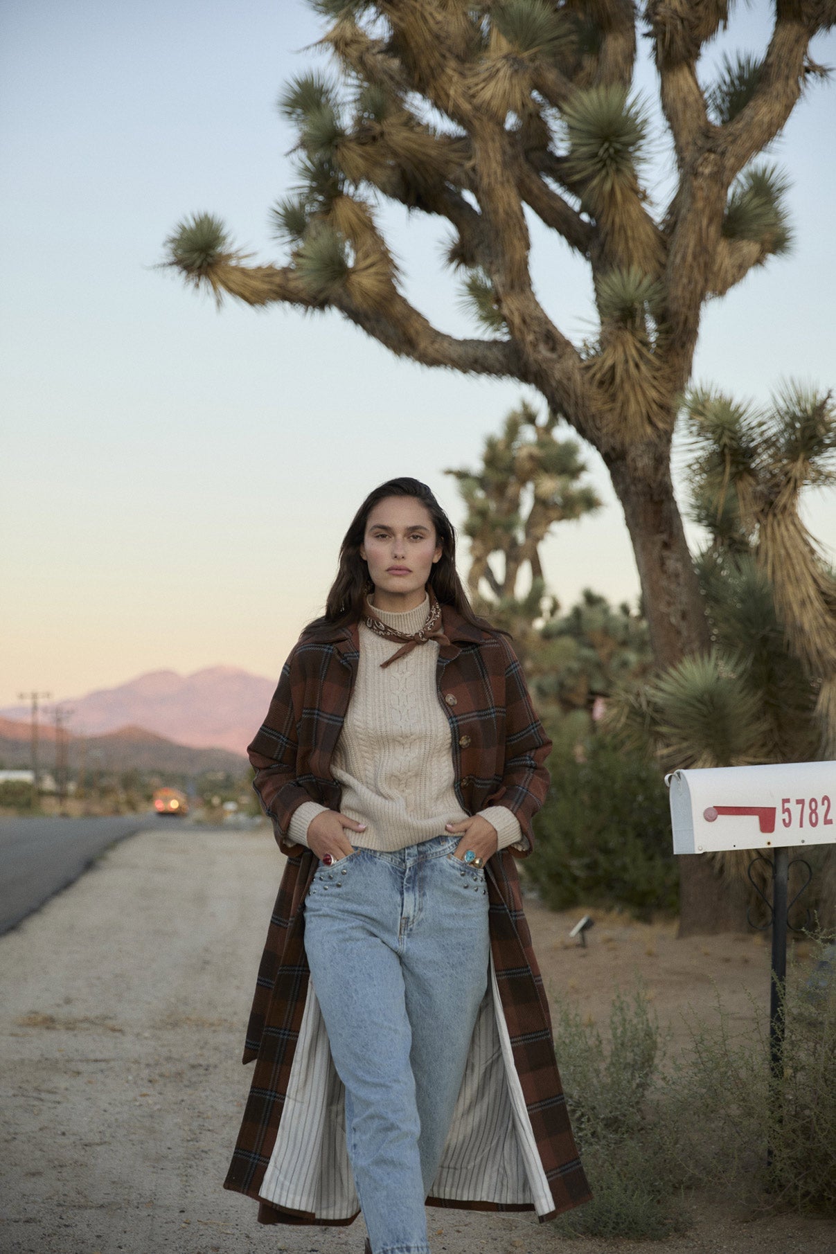 Este abrigo es de corte largo y tiene un diseño clásico de cuadros en tonos marrones, lo que le da un estilo elegante y atemporal. Corte recto y amplio, que cae hasta los tobillos. Bolsillos en los laterales. Cierre con botones carey en el delantero. Detalle de cinturón atado con el mismo tejido.