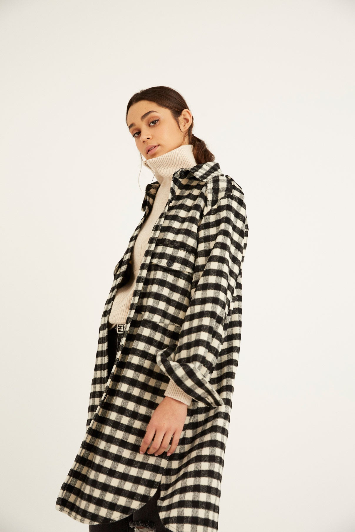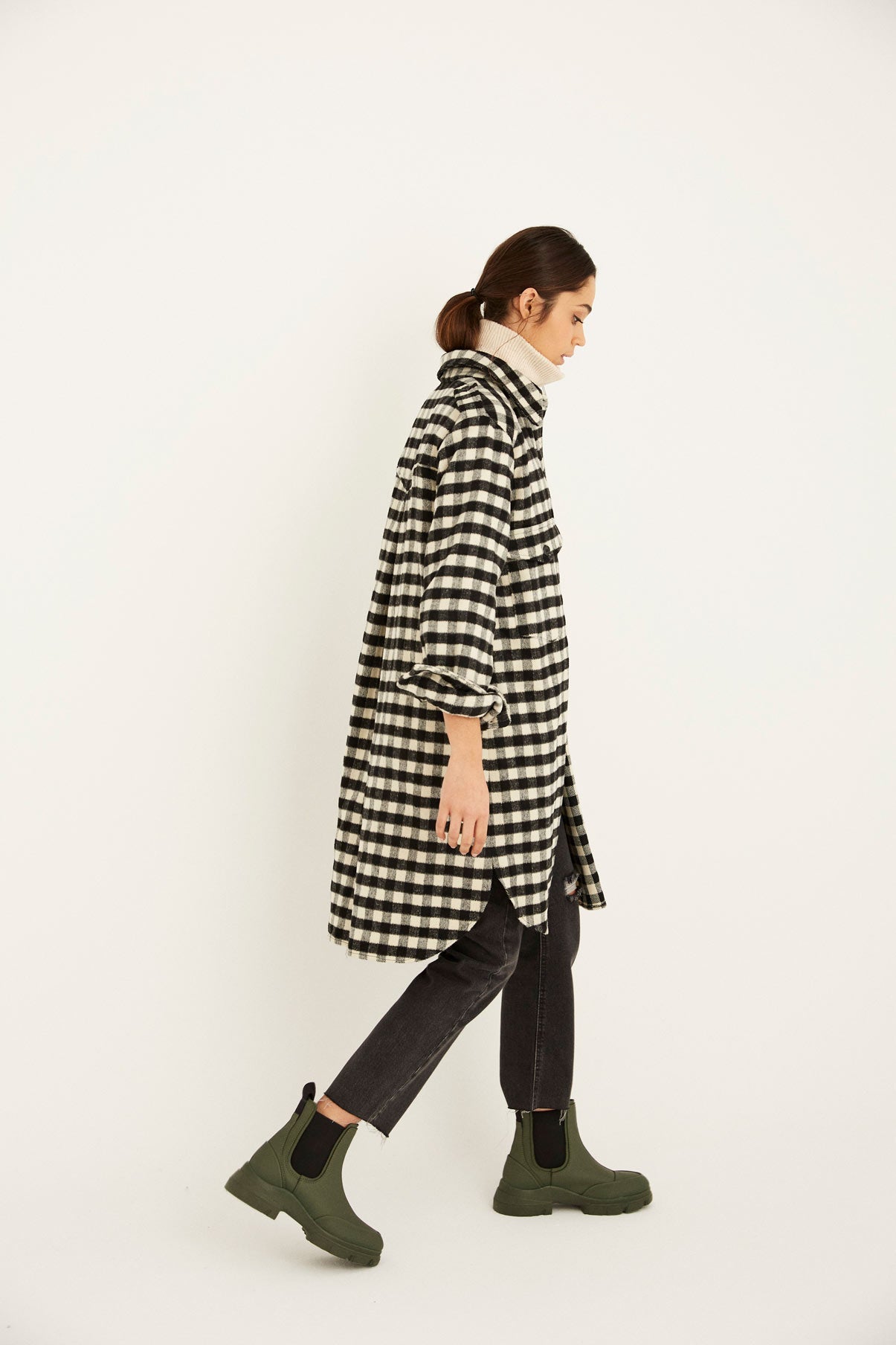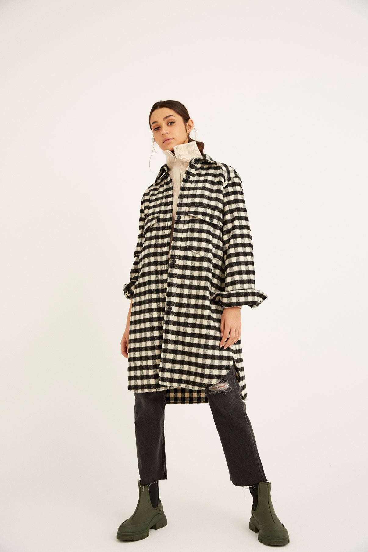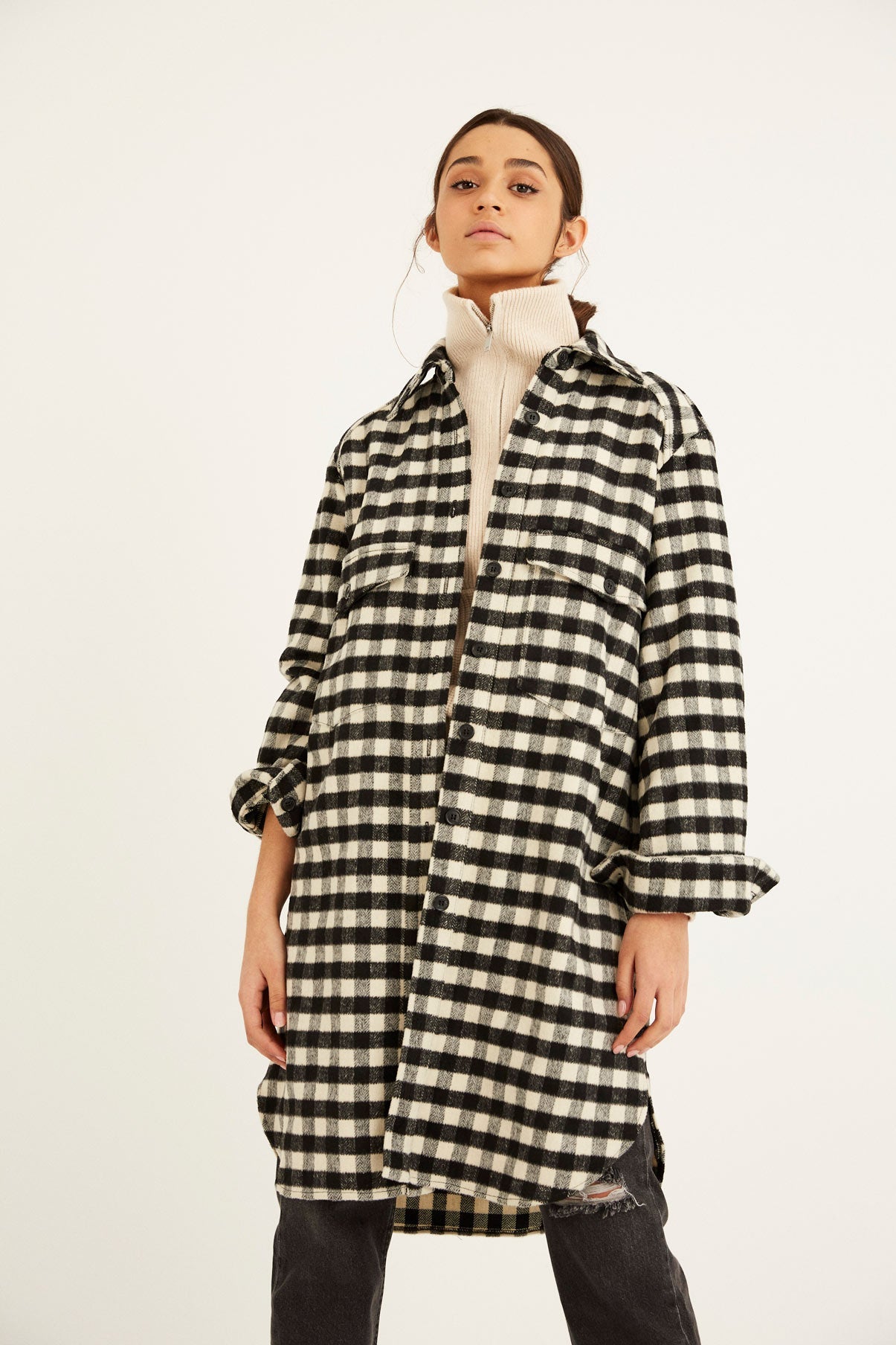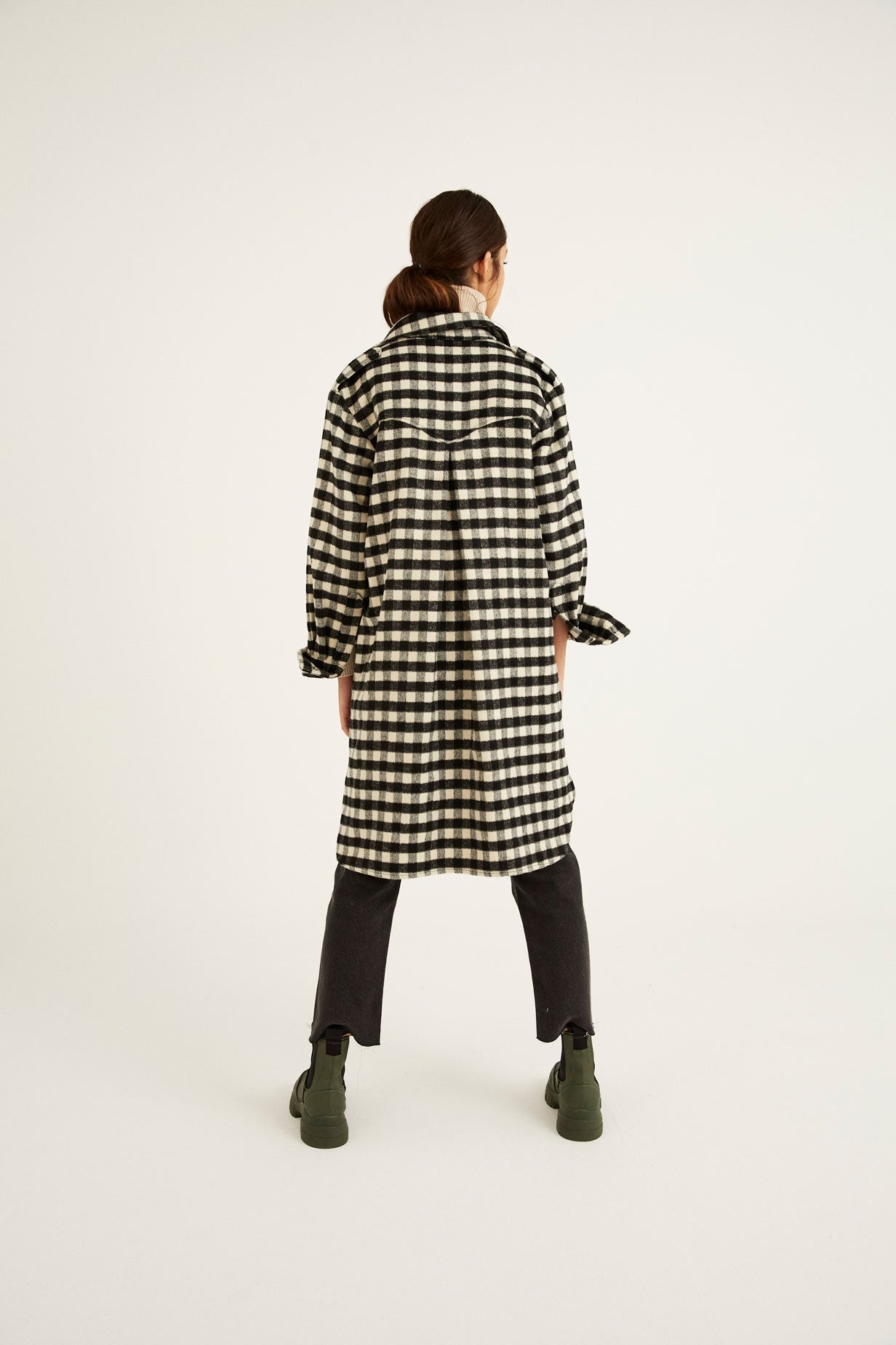 Abrigo estilo camisero midi con manga larga y fit oversize confeccionado en tejido de Vichy con cierre frontal de botones y bolsillos delanteros superiores.