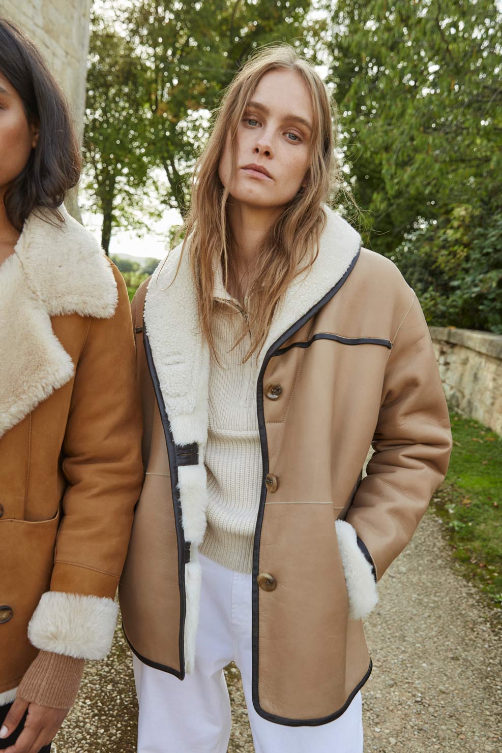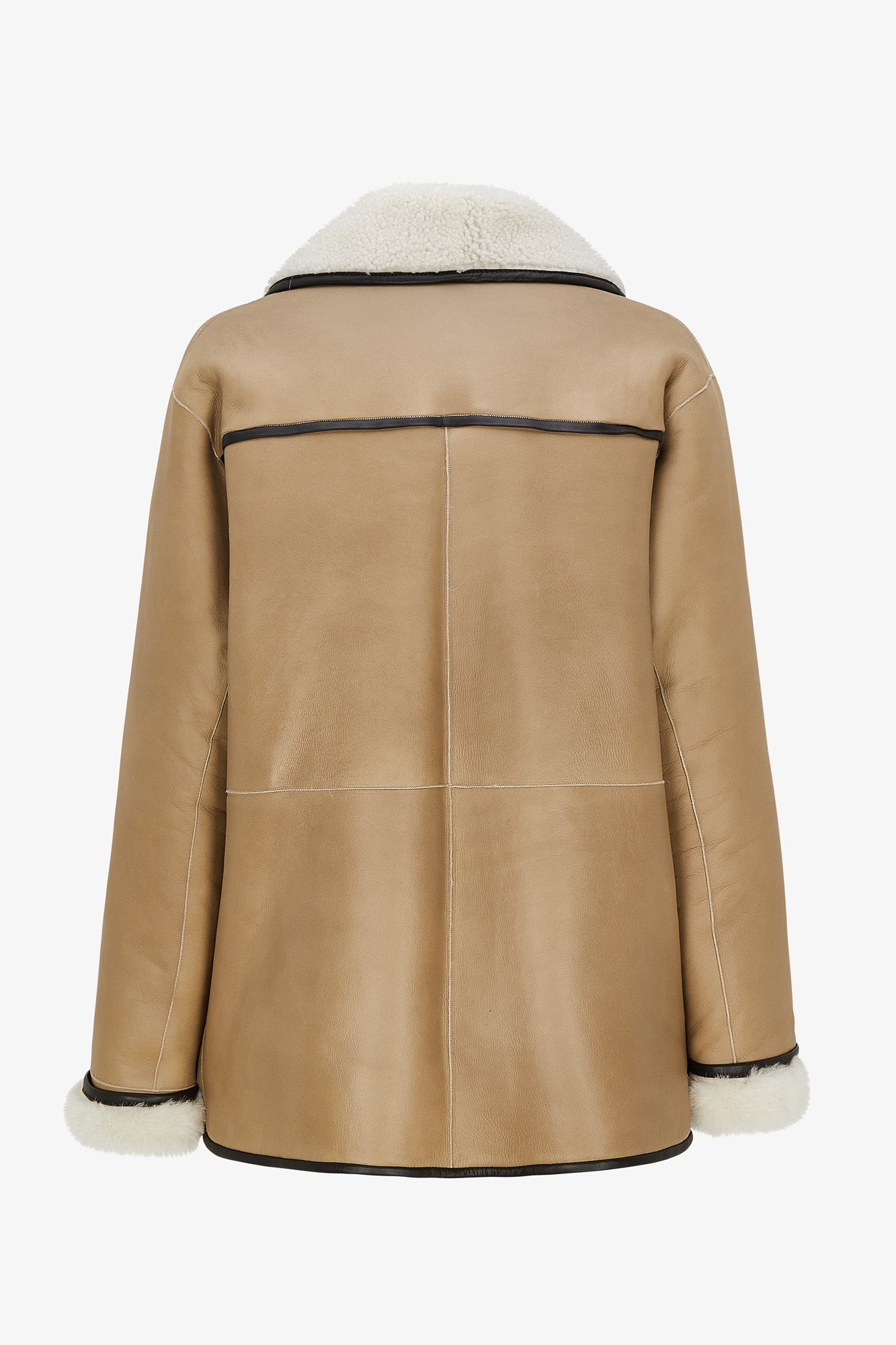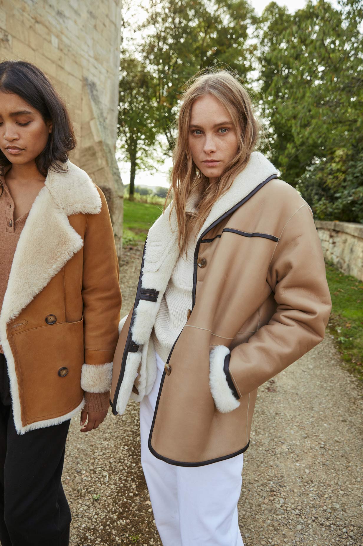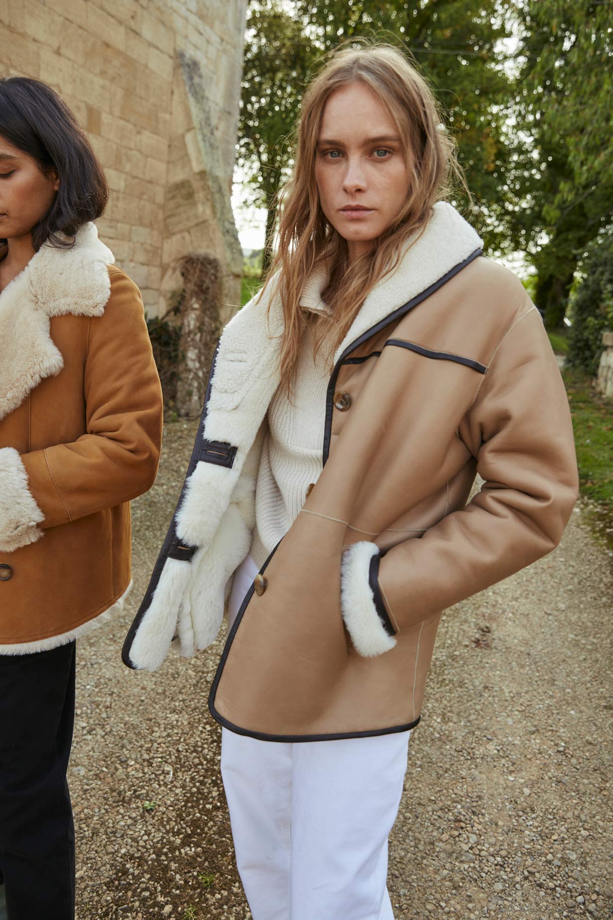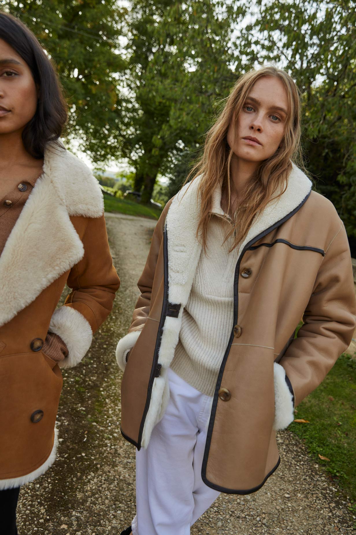 Este invierno apostamos por la artesanía española y apostamos por prendas de 100% cordero español. Abrigo de piel de cordero con pelo por dentro, largo 3/4 con ribetes en piel a contraste en tono marrón. Cierre con botones en el delantero.