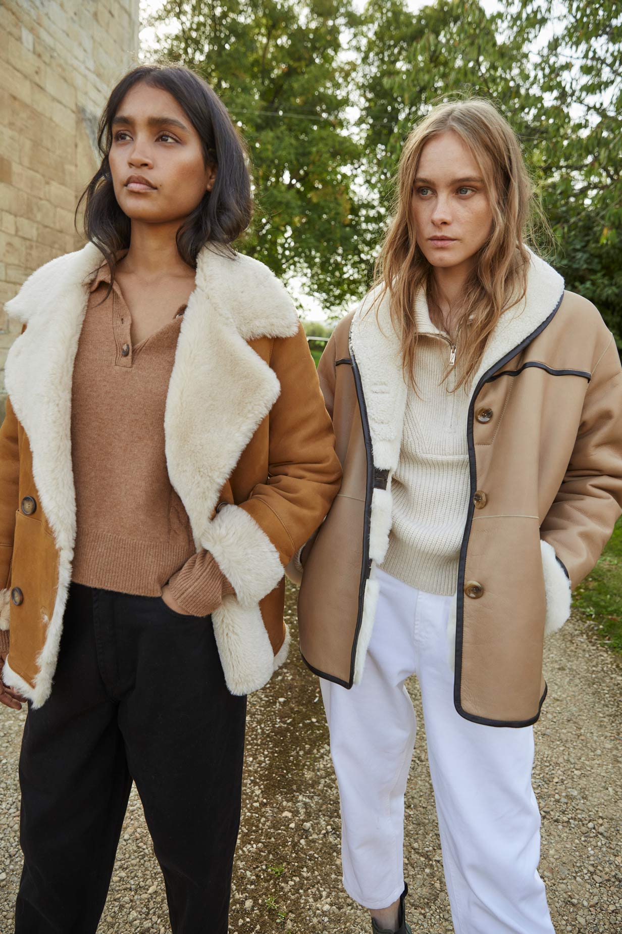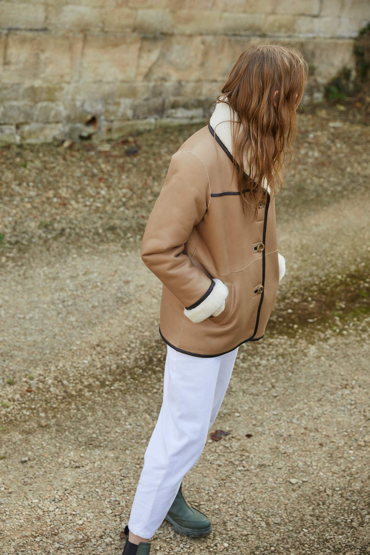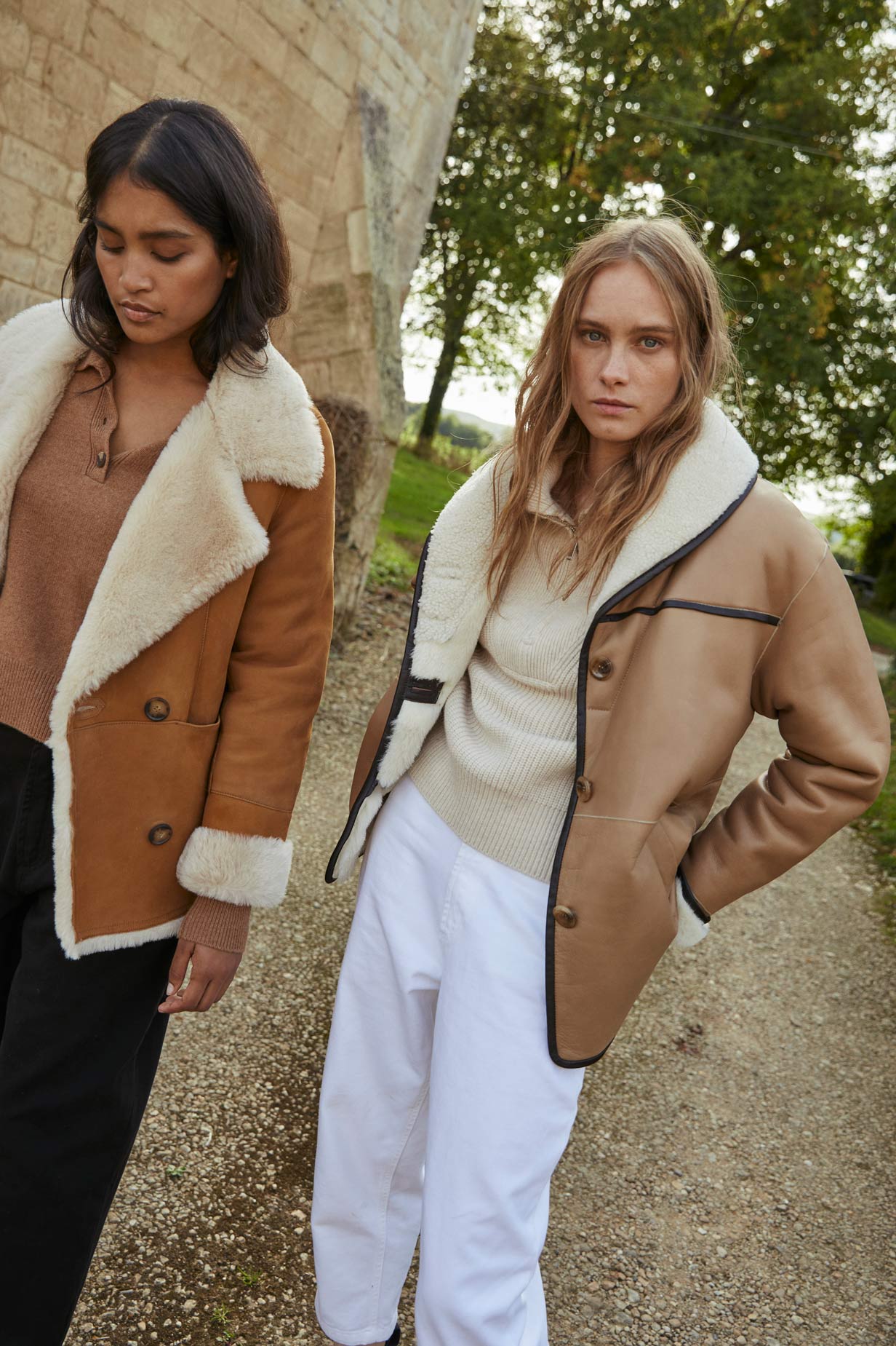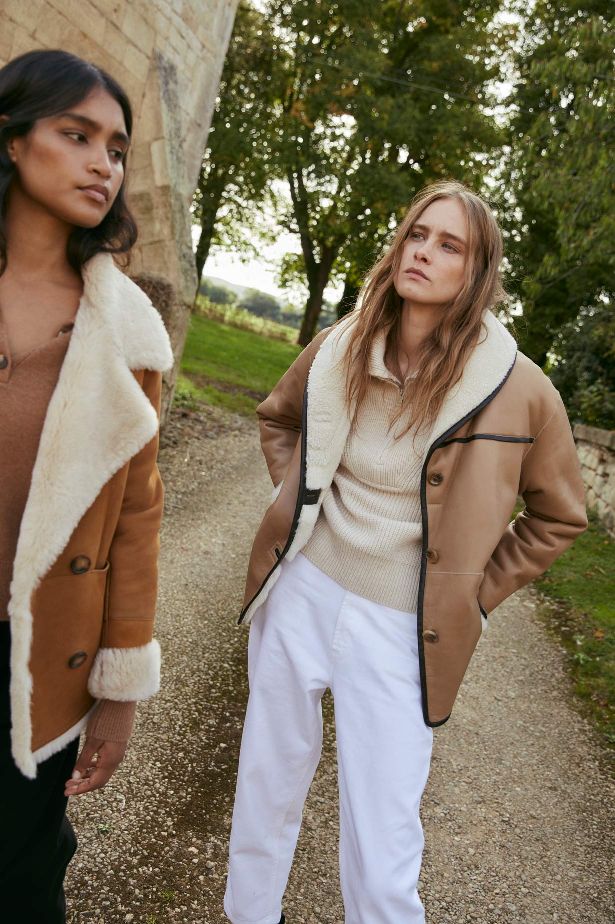 Este invierno apostamos por la artesanía española y apostamos por prendas de 100% cordero español. Abrigo de piel de cordero con pelo por dentro, largo 3/4 con ribetes en piel a contraste en tono marrón. Cierre con botones en el delantero.