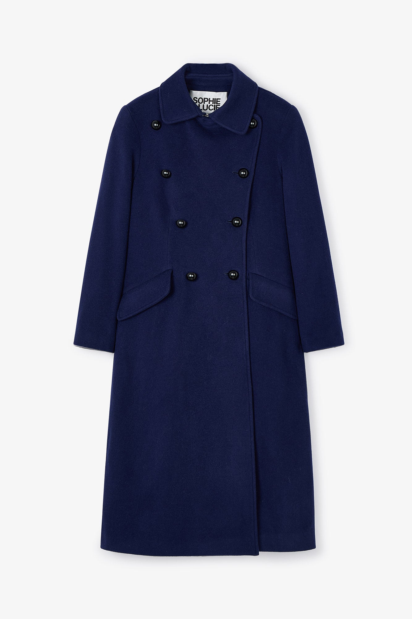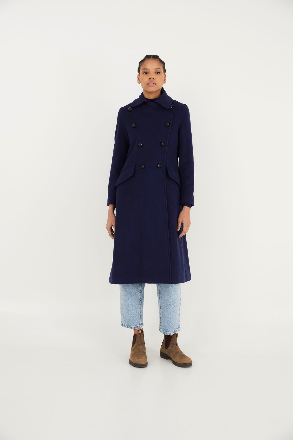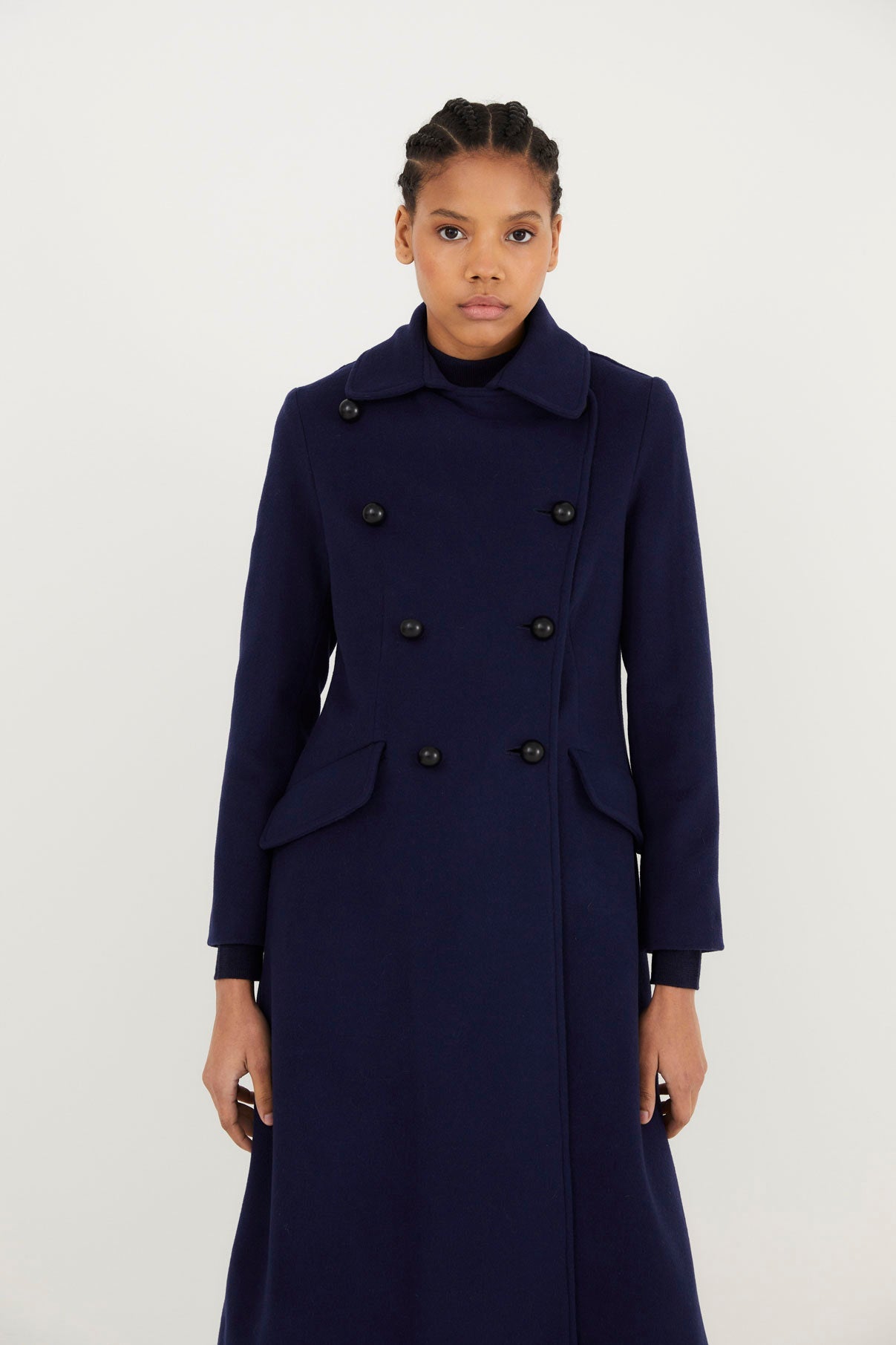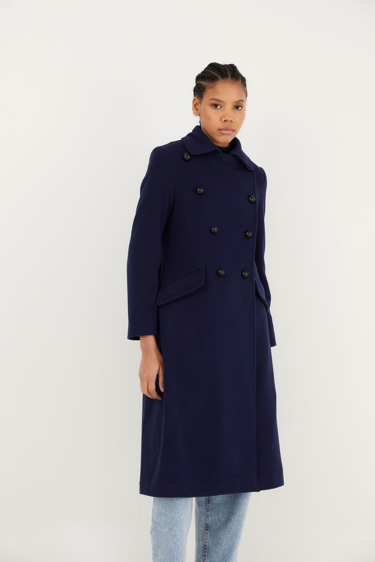 Este abrigo de paño es de color azul marino y tiene un diseño clásico con doble botonadura en la parte frontal. Cuello con solapas. Bolsillos con solapas en ambos lados. Es una prenda versátil, perfecta para ocasiones formales o looks más casuales y elegantes. Ideal para este invierno.
