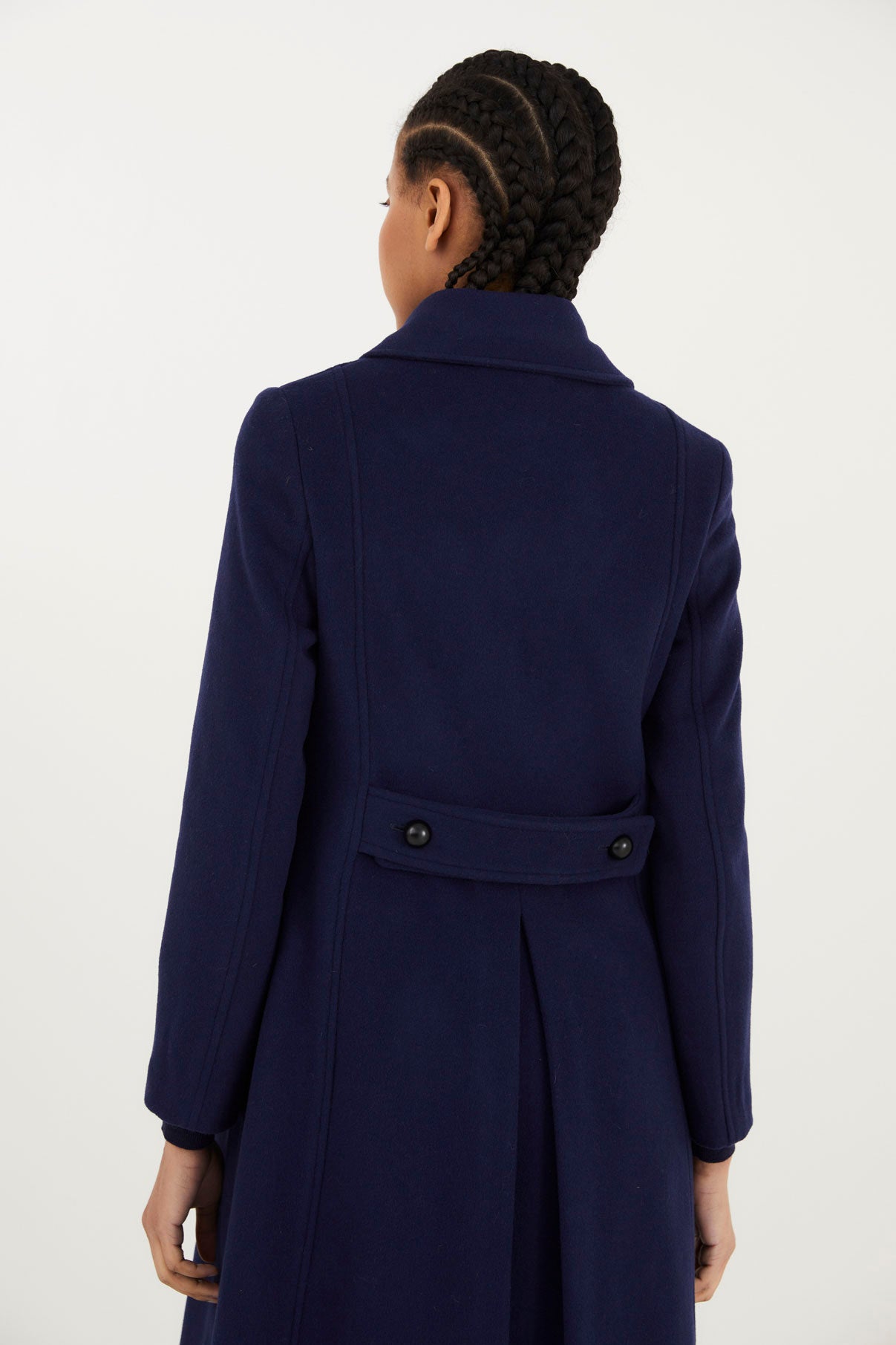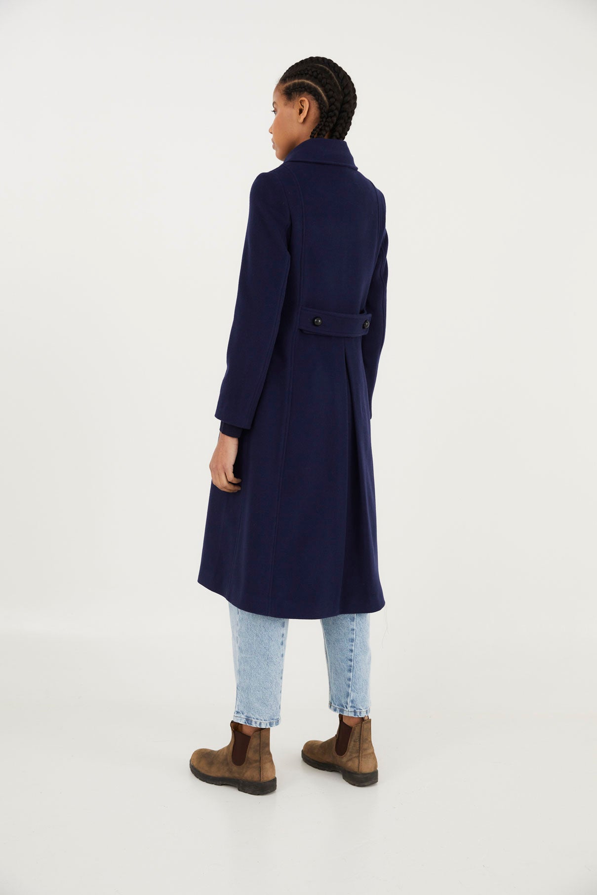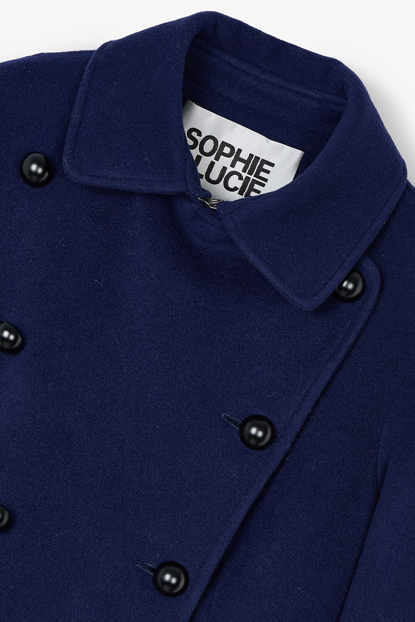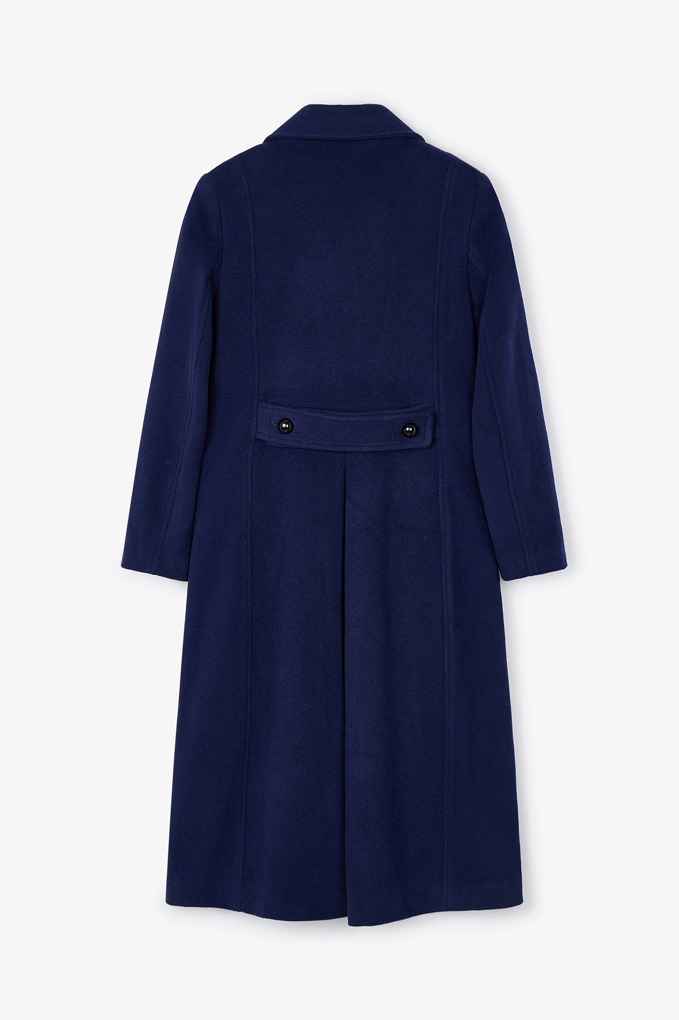 Este abrigo de paño es de color azul marino y tiene un diseño clásico con doble botonadura en la parte frontal. Cuello con solapas. Bolsillos con solapas en ambos lados. Es una prenda versátil, perfecta para ocasiones formales o looks más casuales y elegantes. Ideal para este invierno.