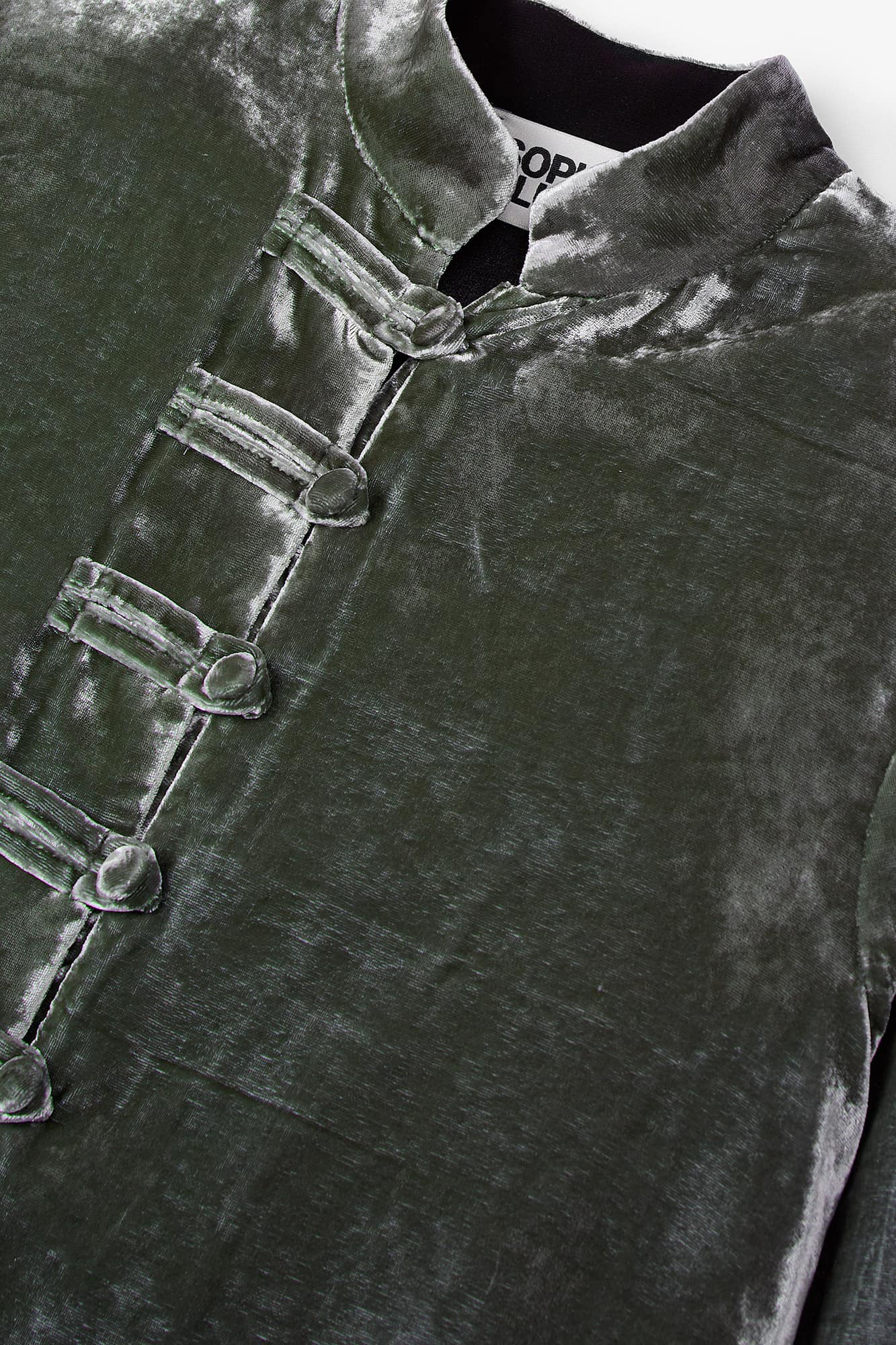 El abrigo perfecto para tus eventos. Abrigo midi reversible en terciopelo y raso de color humo. Cuello mao, botonadura frontal hasta la cintura y aberturas laterales para dar movimiento.