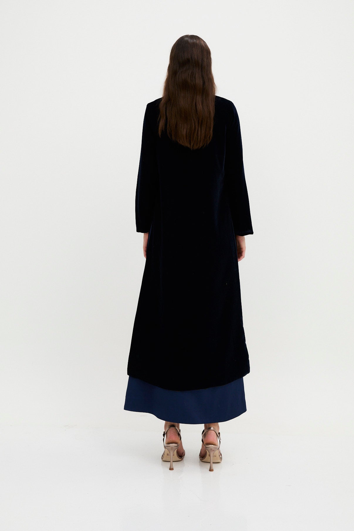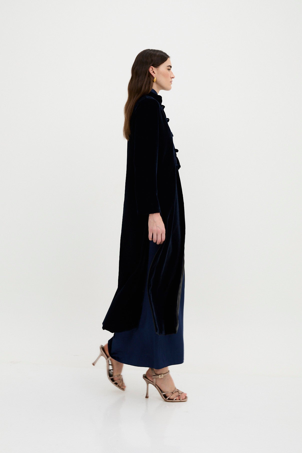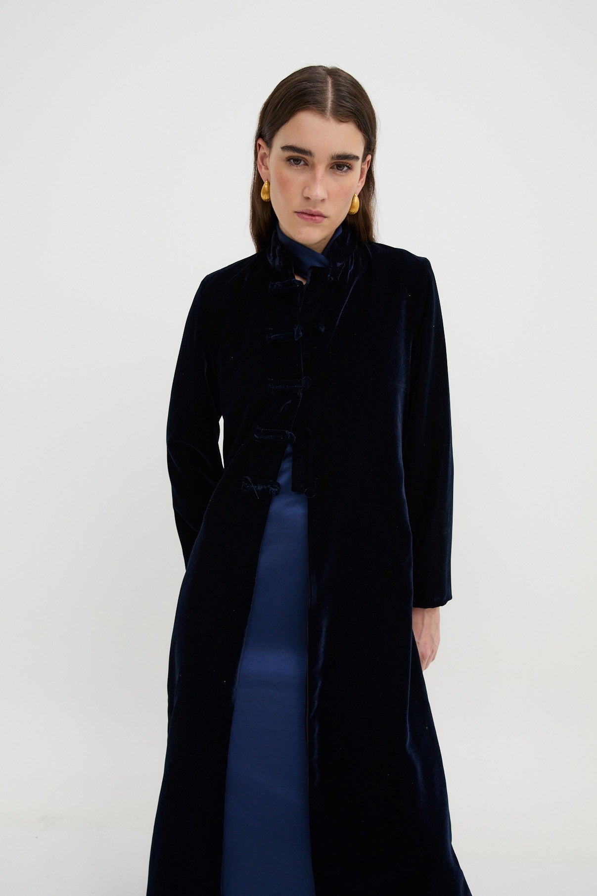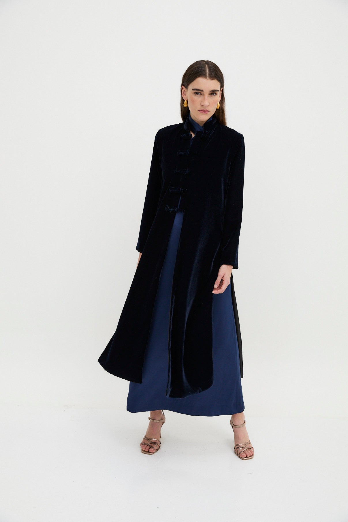 Esta temporada os traemos el abrigo perfecto para vuestros eventos. Abrigo midi en terciopelo y raso de color azul marino. Cuello mao, botonadura frontal hasta la cintura y aberturas laterales para dar movimiento.