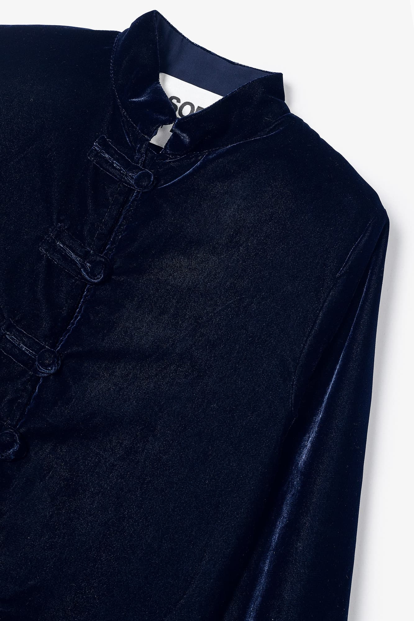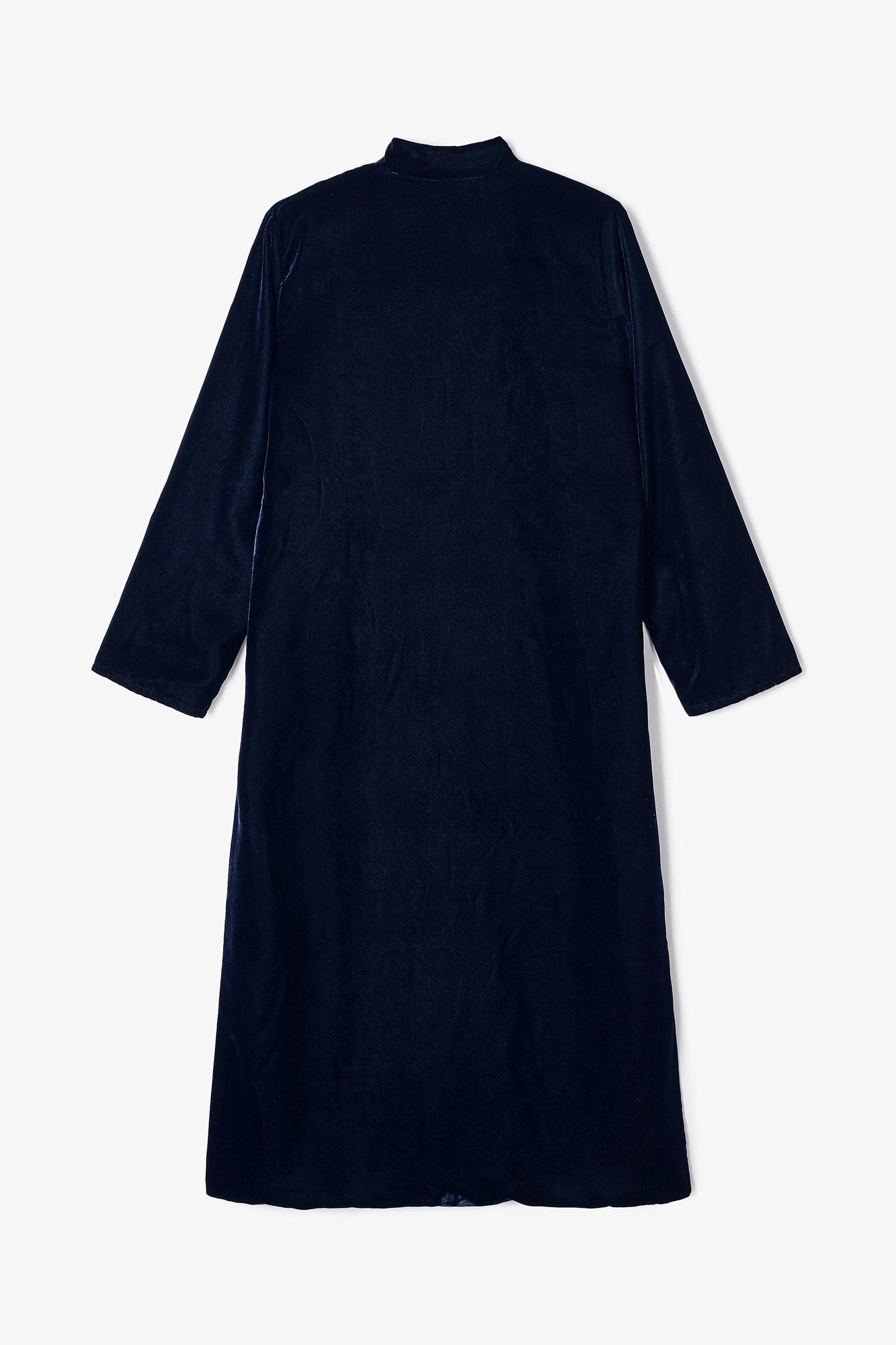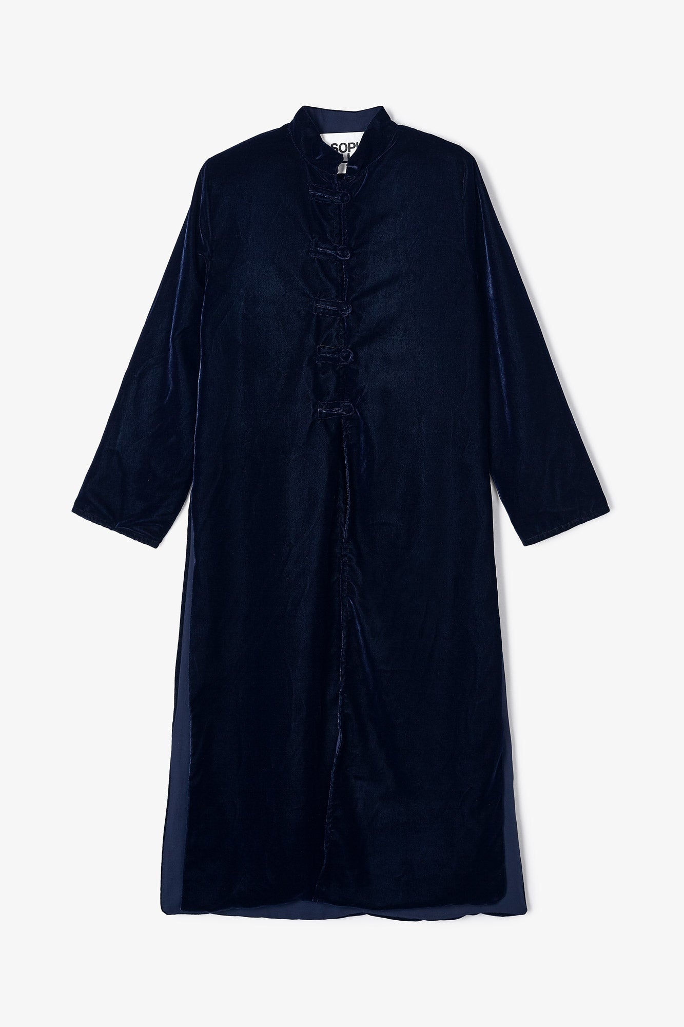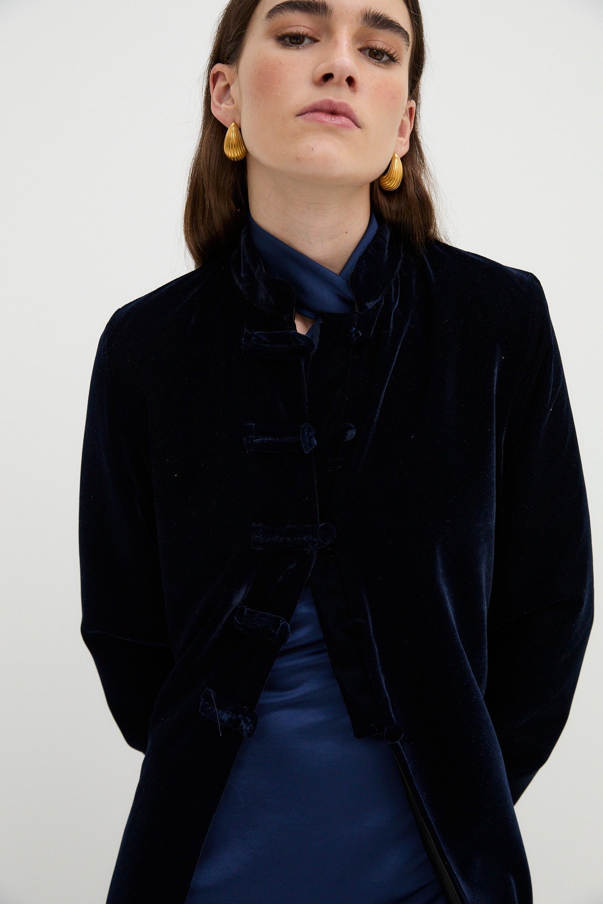 Esta temporada os traemos el abrigo perfecto para vuestros eventos. Abrigo midi en terciopelo y raso de color azul marino. Cuello mao, botonadura frontal hasta la cintura y aberturas laterales para dar movimiento.