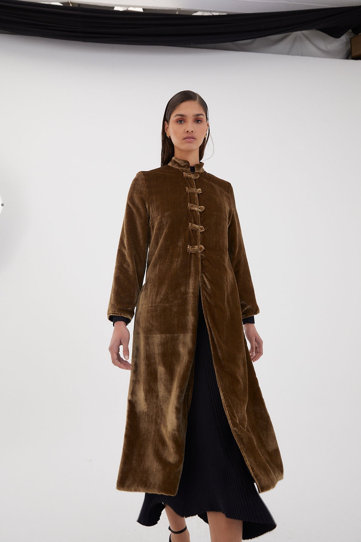 Esta temporada os traemos el abrigo de seda perfecto para vuestros eventos. Abrigo midi reversible en terciopelo y seda color ocre. Confeccionado en seda, lo que hace que el tacto sea suave y delicado. Cuello mao, botonadura frontal hasta la cintura y aberturas laterales para dar movimiento.