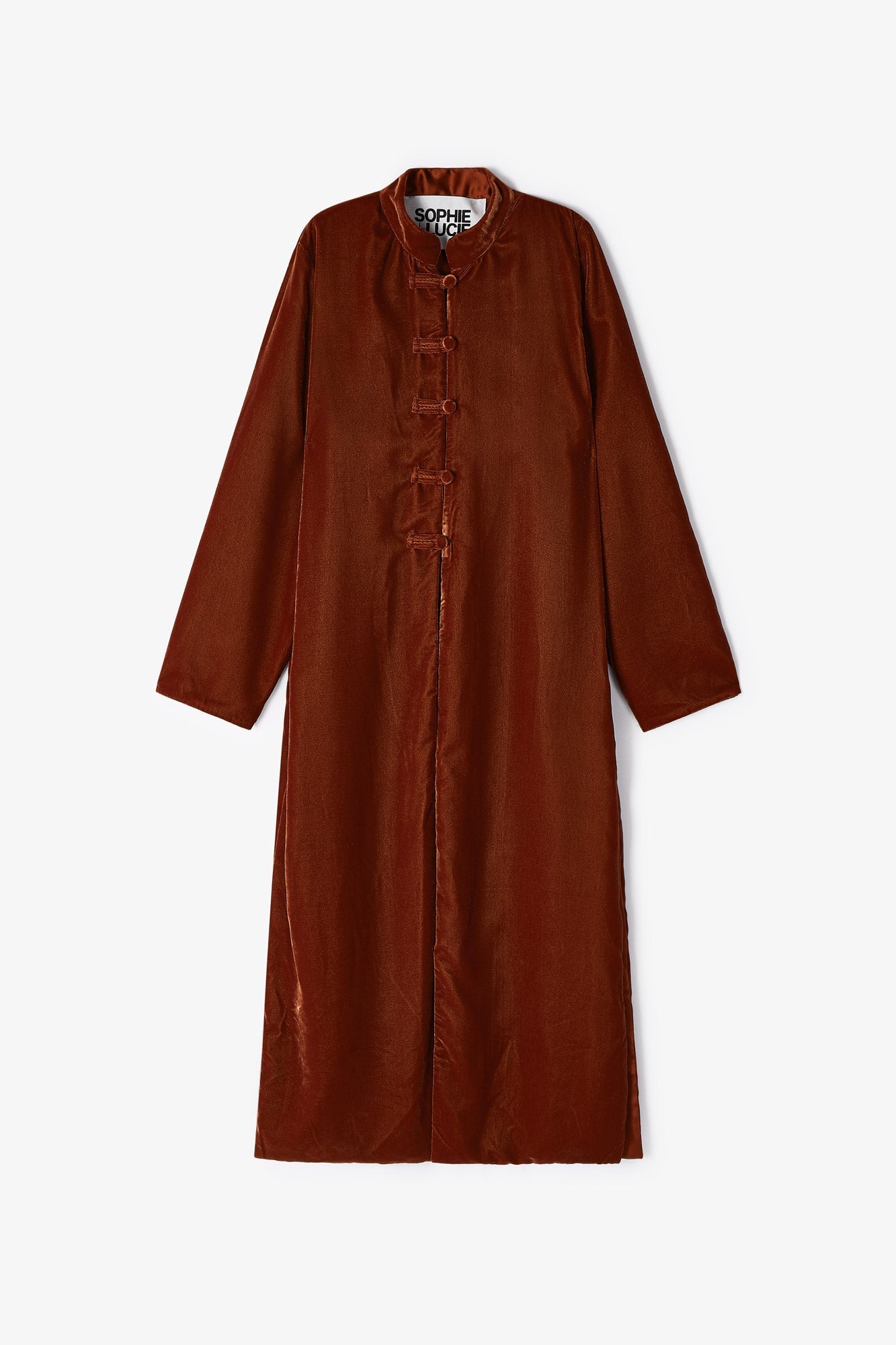 Esta temporada os traemos el abrigo perfecto para vuestros eventos. Abrigo midi reversible en terciopelo y raso de color terracota. Cuello mao, botonadura frontal hasta la cintura y aberturas laterales para dar movimiento.