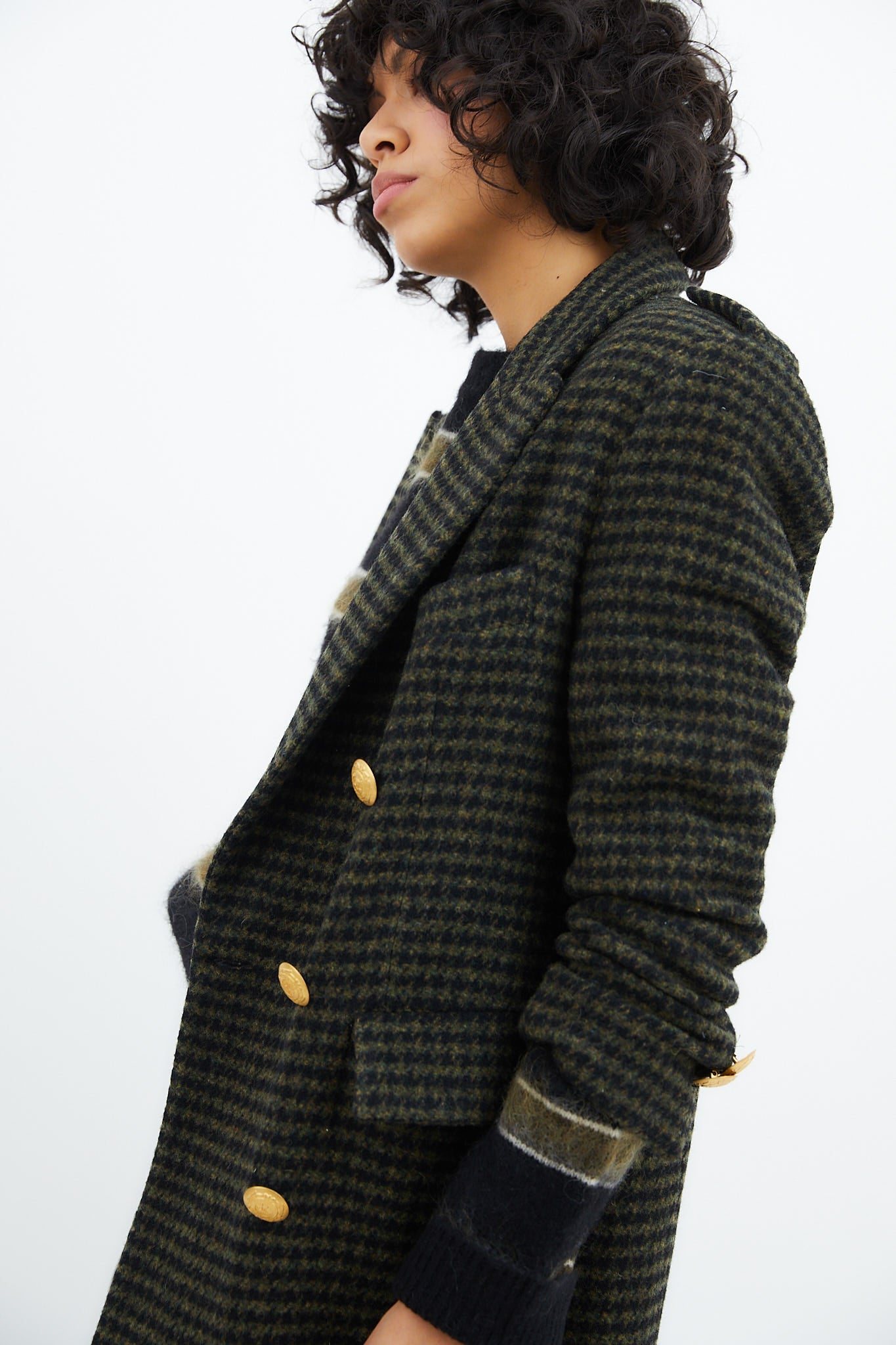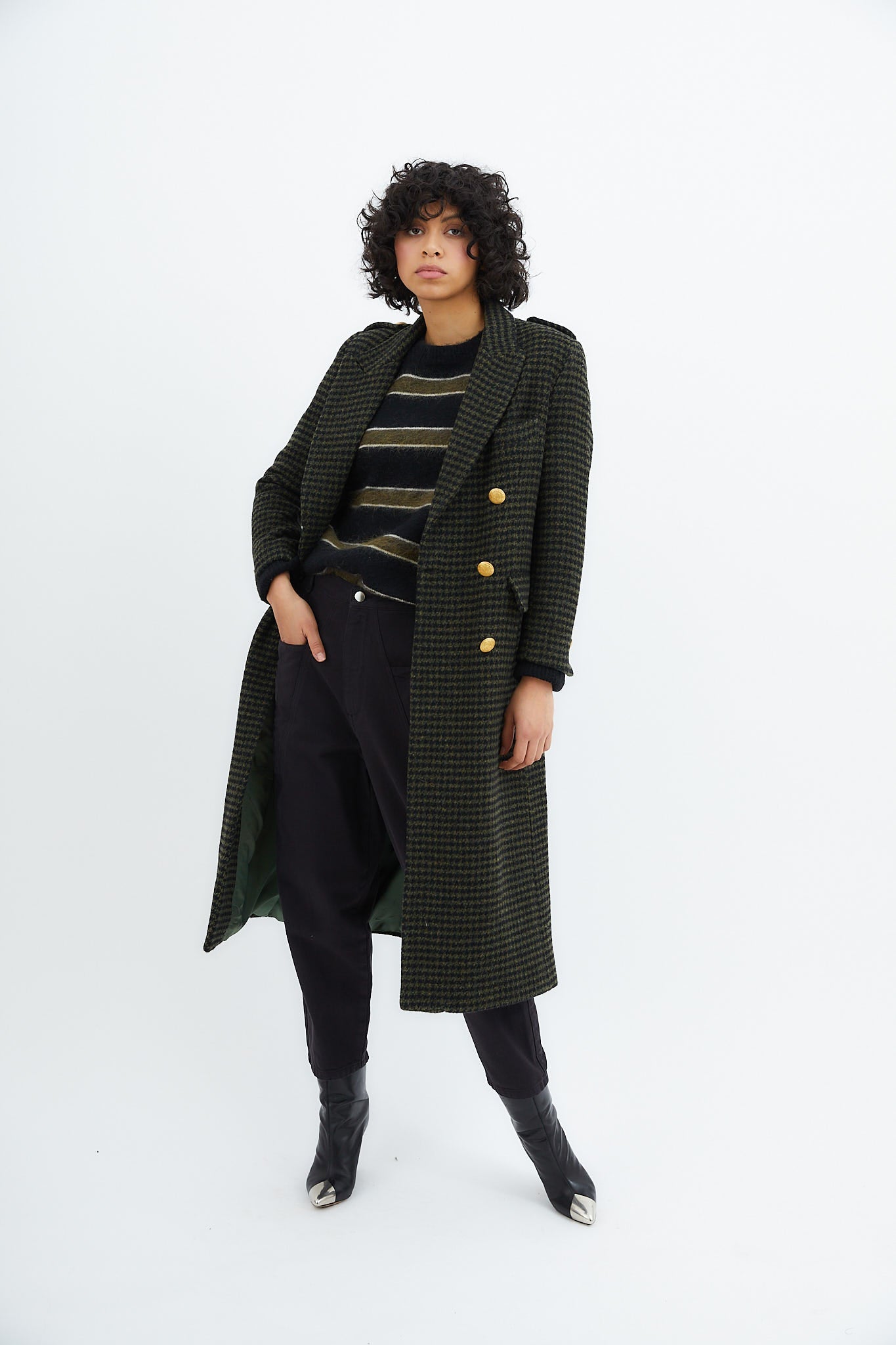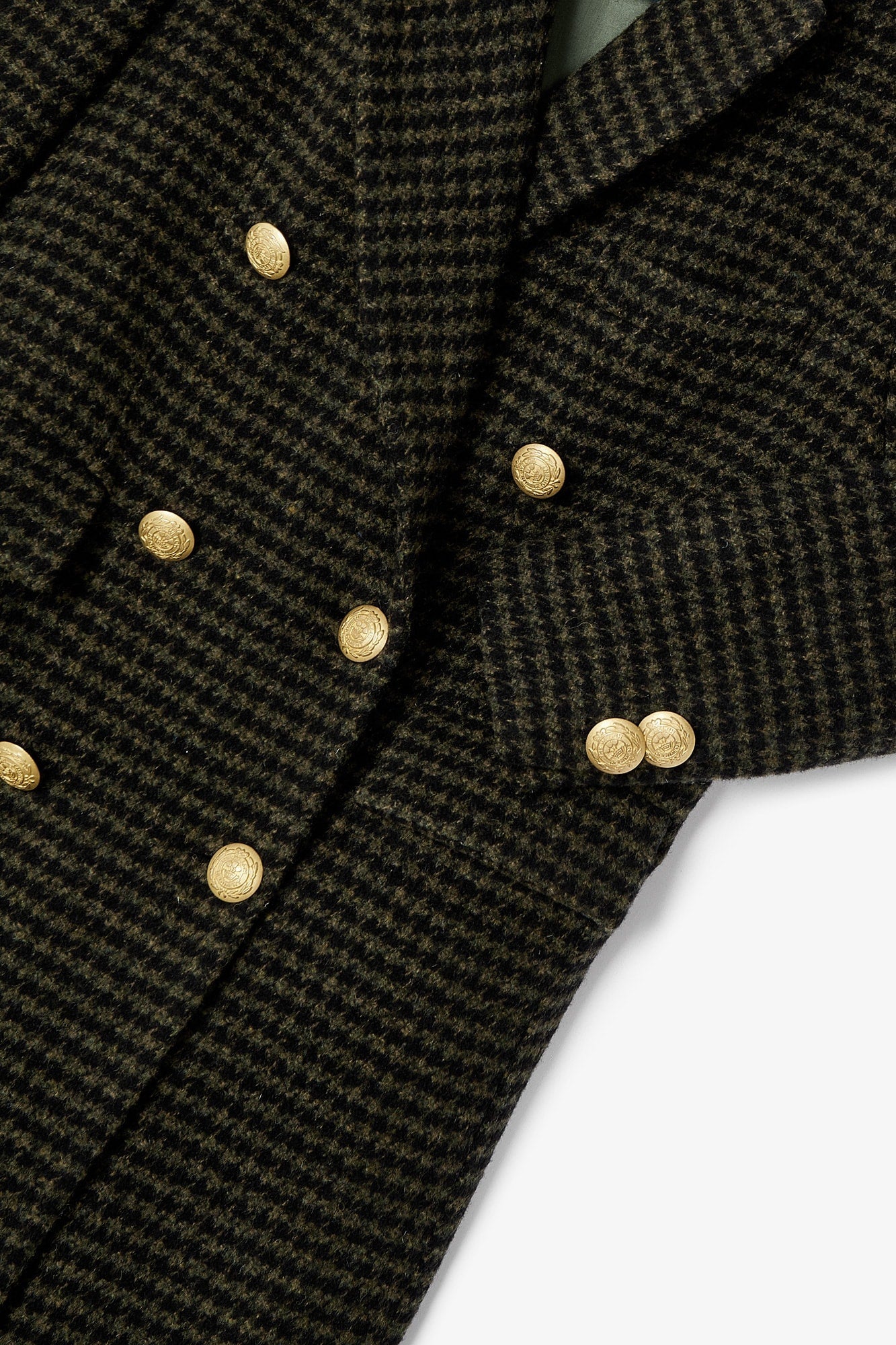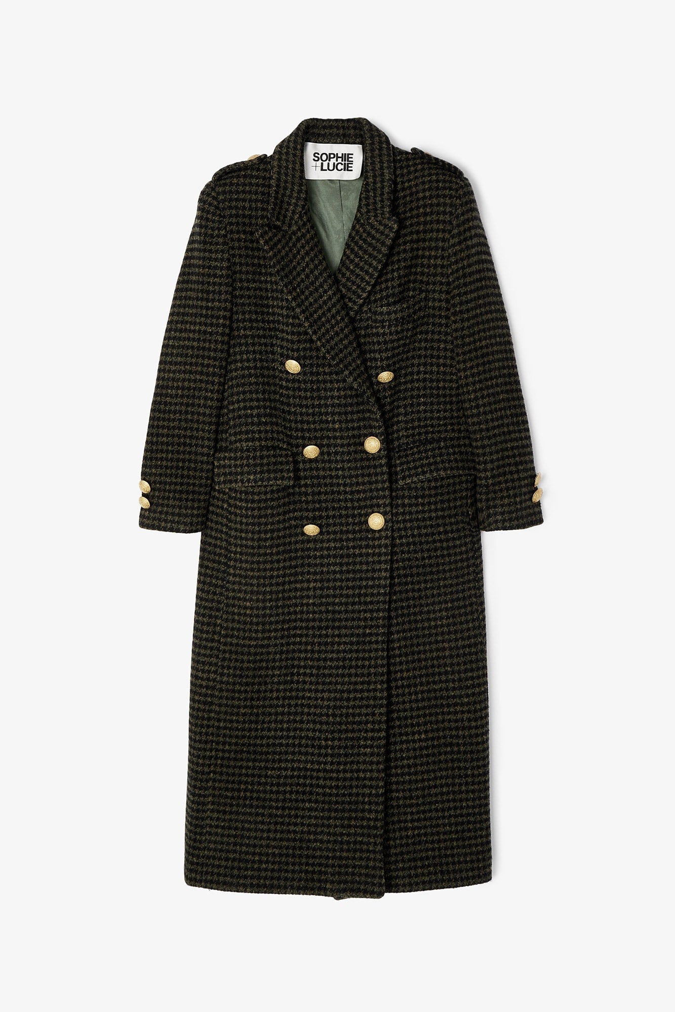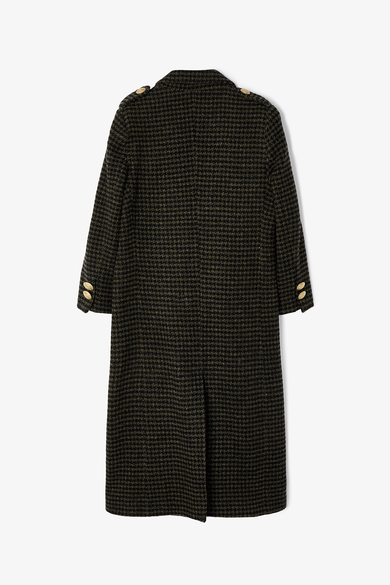 Abrigo de corte masculino confeccionado en tejido de pata de gallo en color verde kaki. Cierre frontal con botones dorados. Bolsillos de solapa laterales y detalle de botones en el puño.