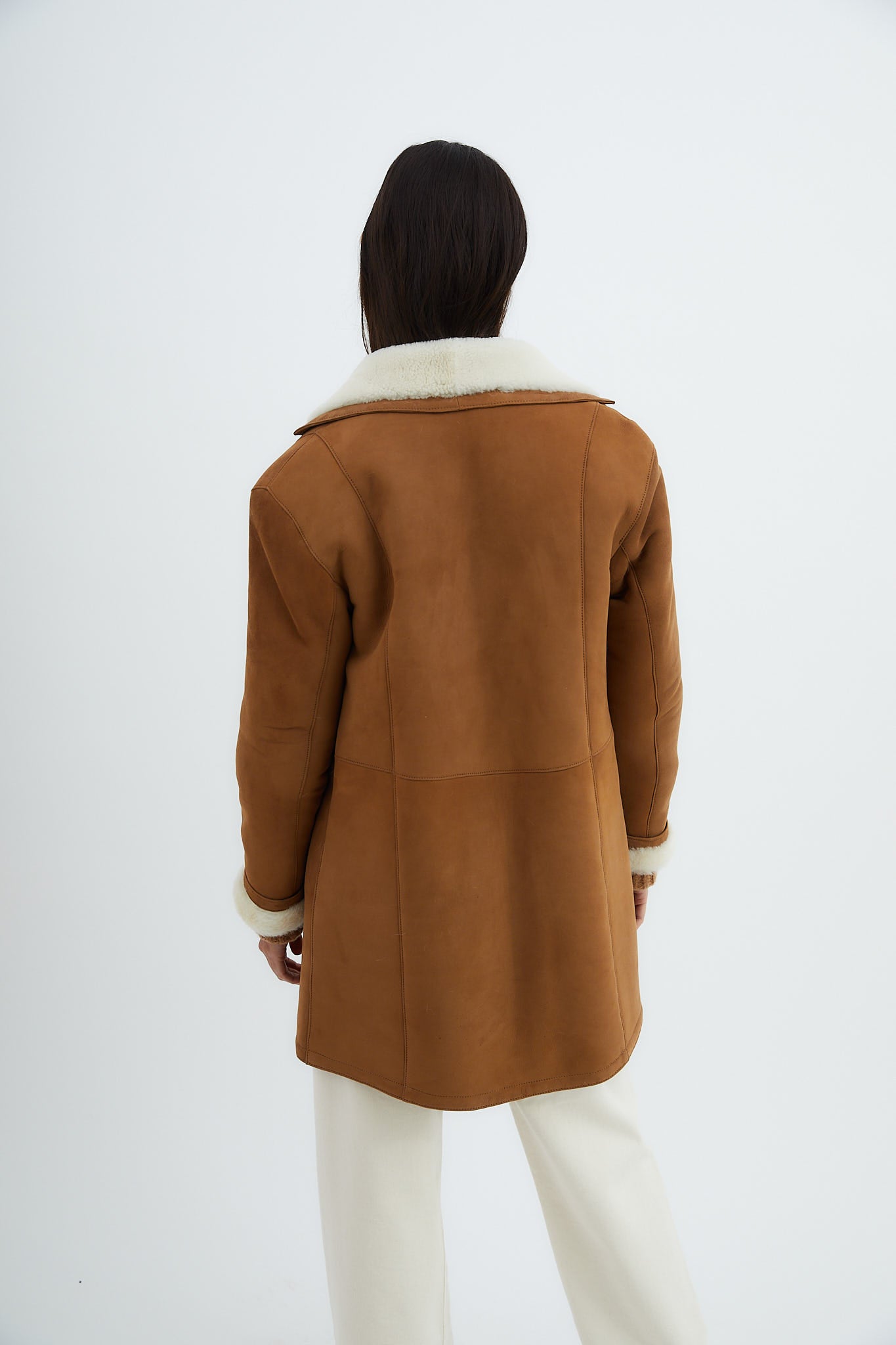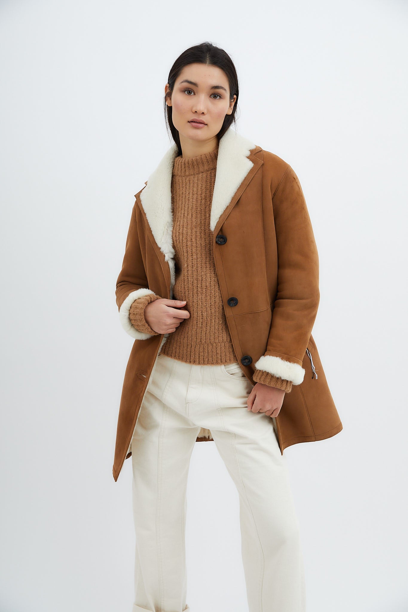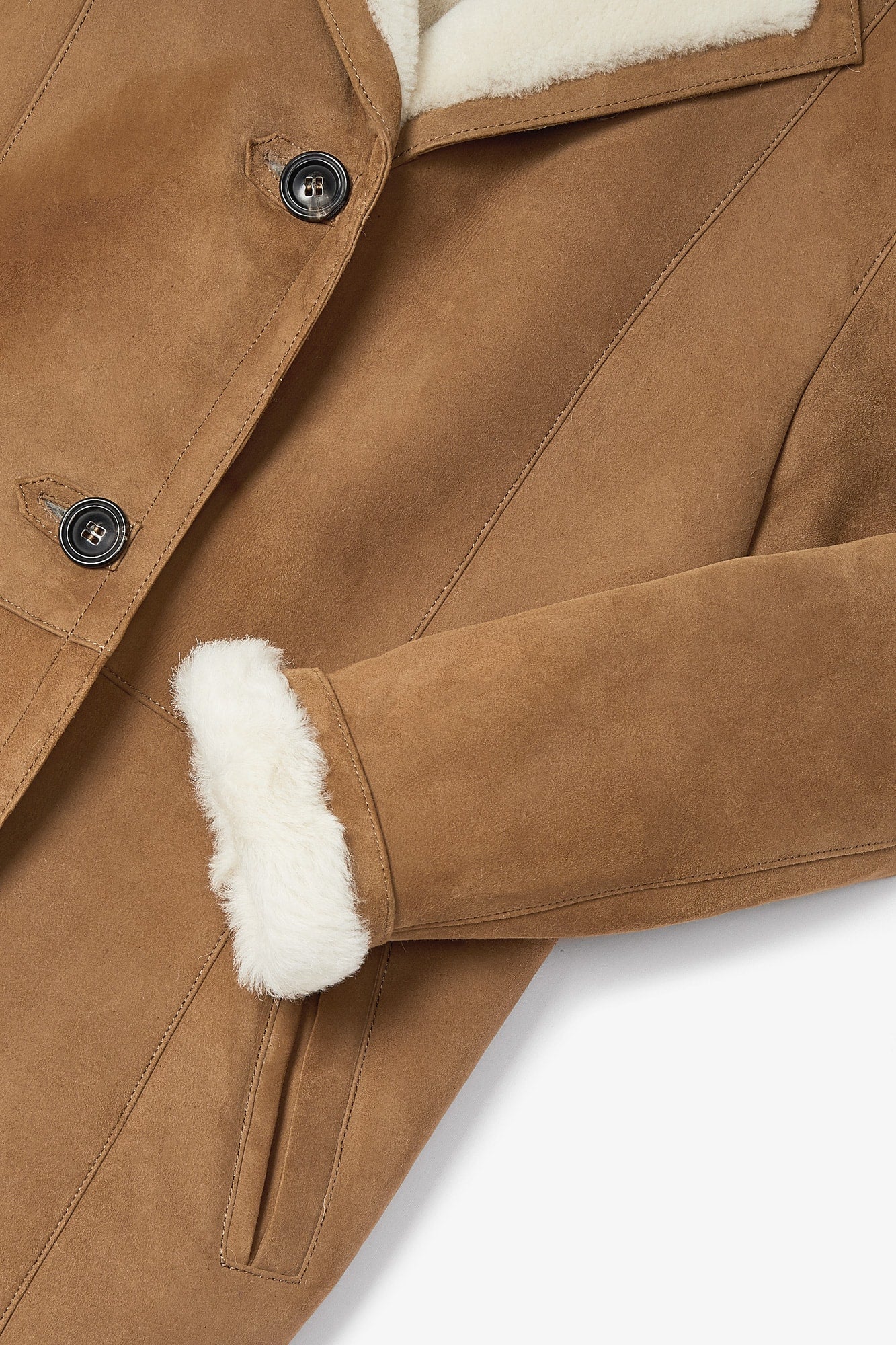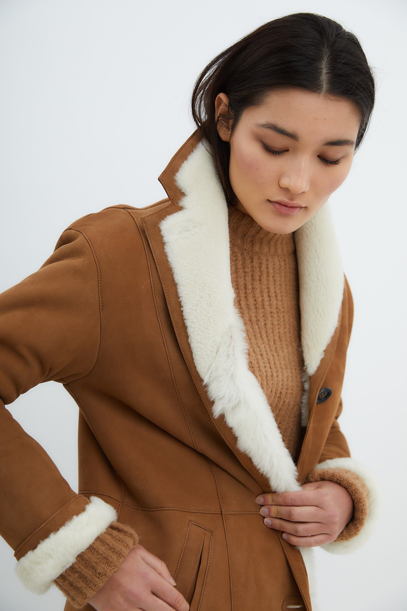 Este invierno volvemos a apostar por la artesanía española y las prendas de piel que más os gustan. Chaquetón de piel vuelta con pelo en el interior, hombro marcado, cuello de solapas y cierre cruzado con tres botones en el delantero. La piel es reutilizada del sector alimentario.
