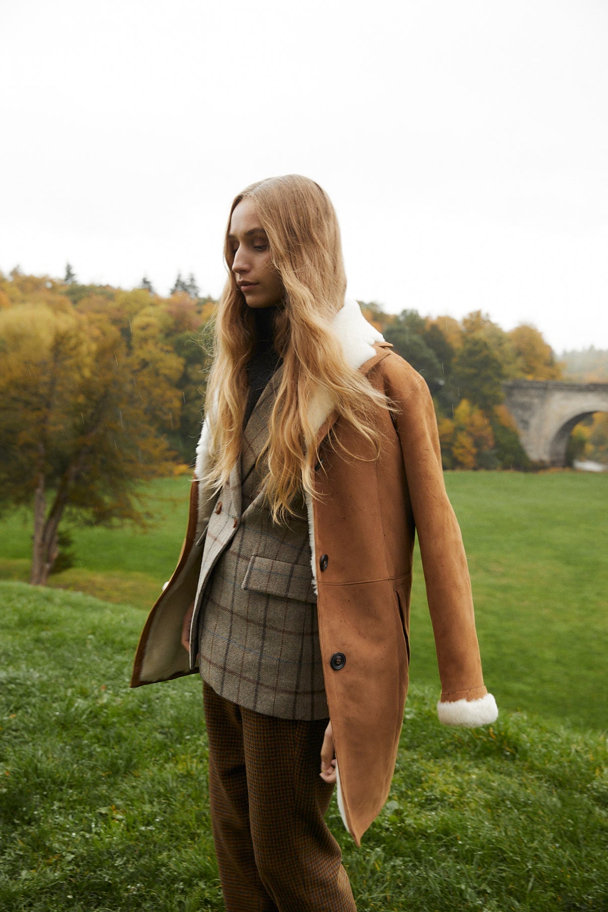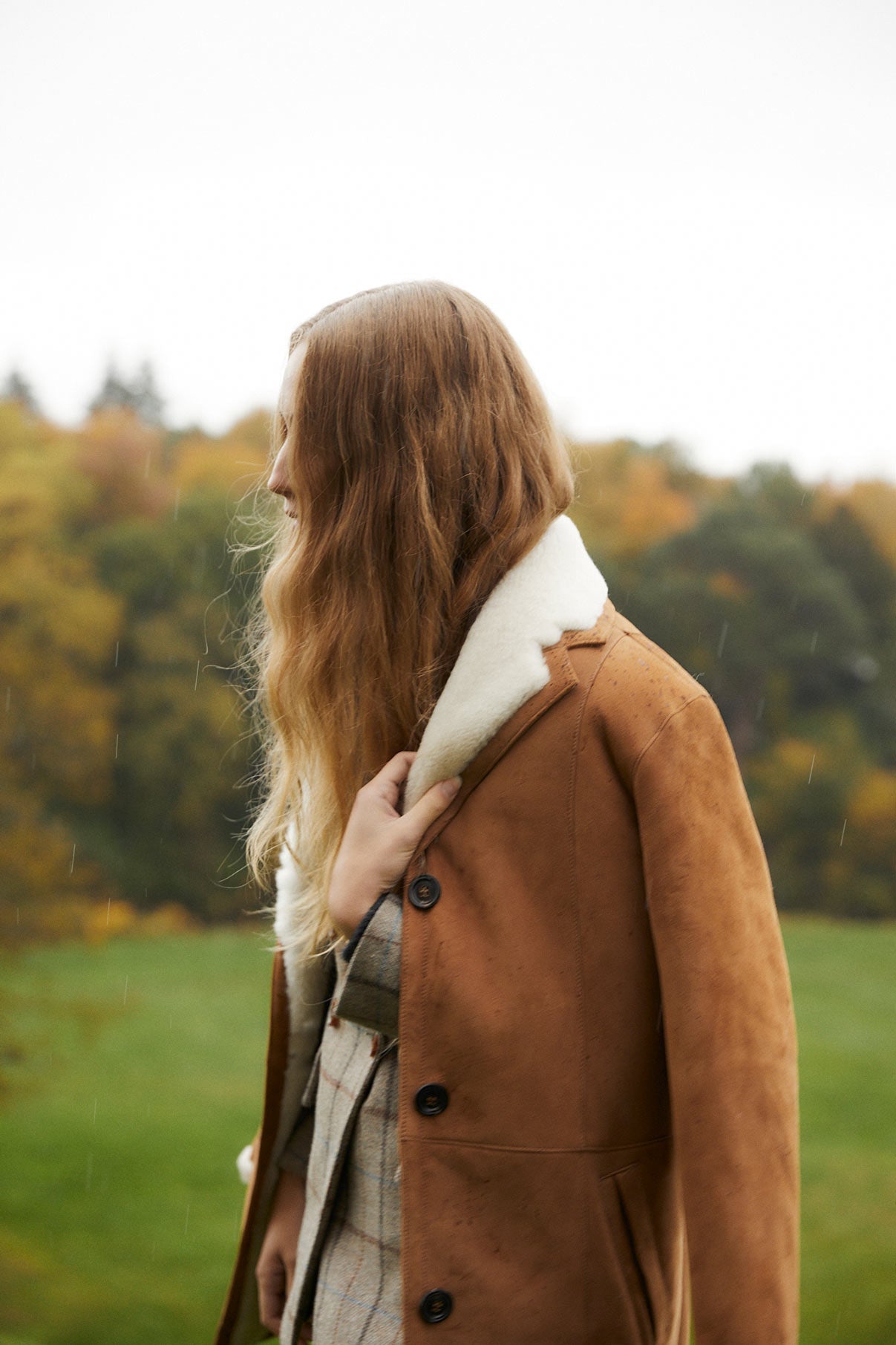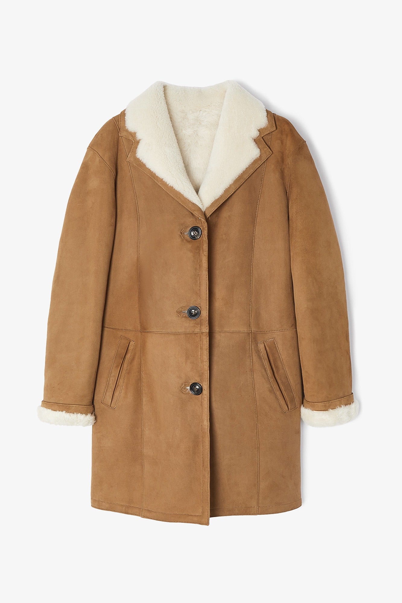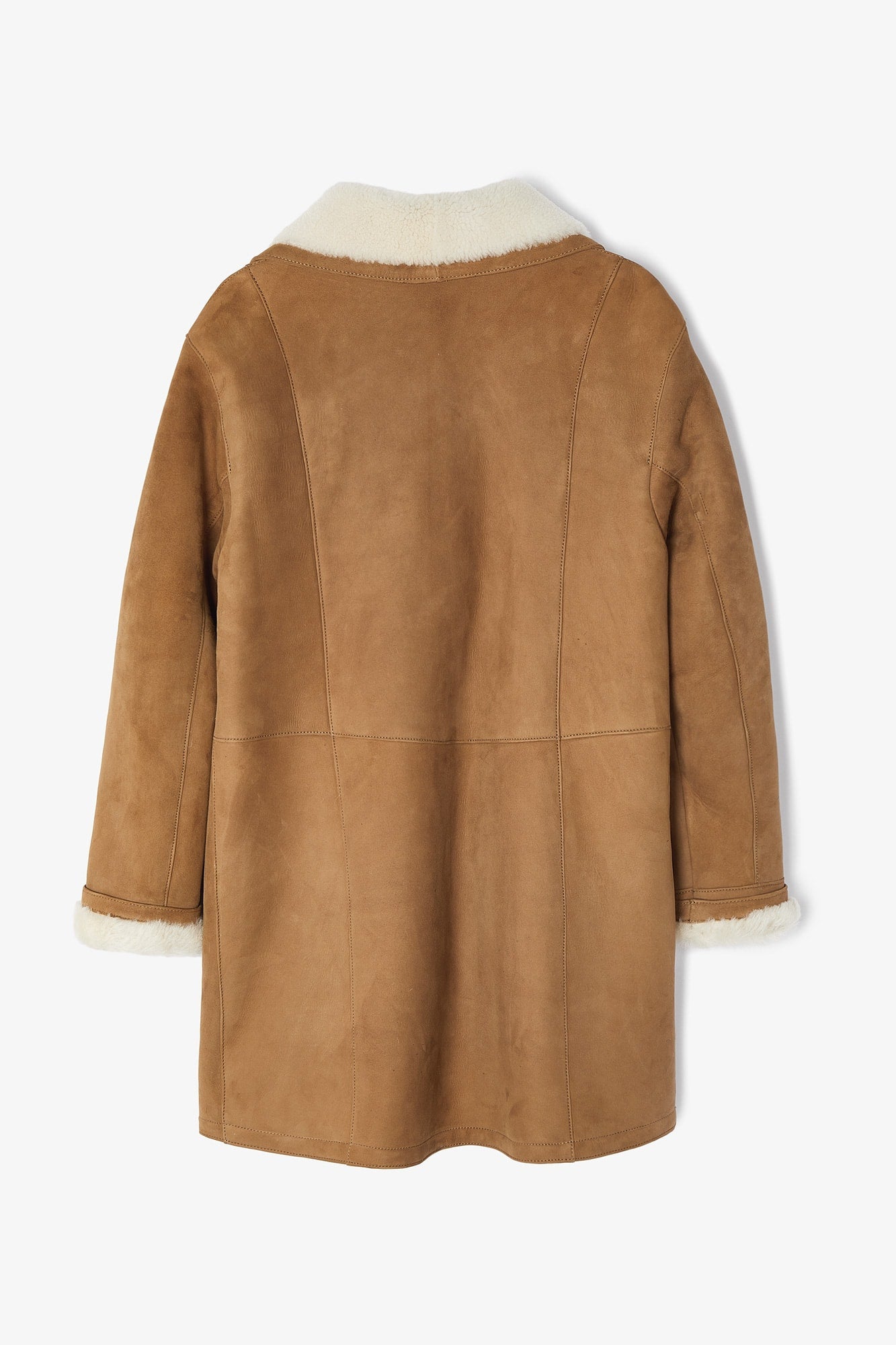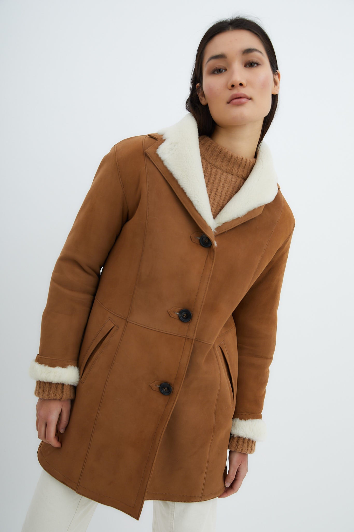 Este invierno volvemos a apostar por la artesanía española y las prendas de piel que más os gustan. Chaquetón de piel vuelta con pelo en el interior, hombro marcado, cuello de solapas y cierre cruzado con tres botones en el delantero. La piel es reutilizada del sector alimentario.