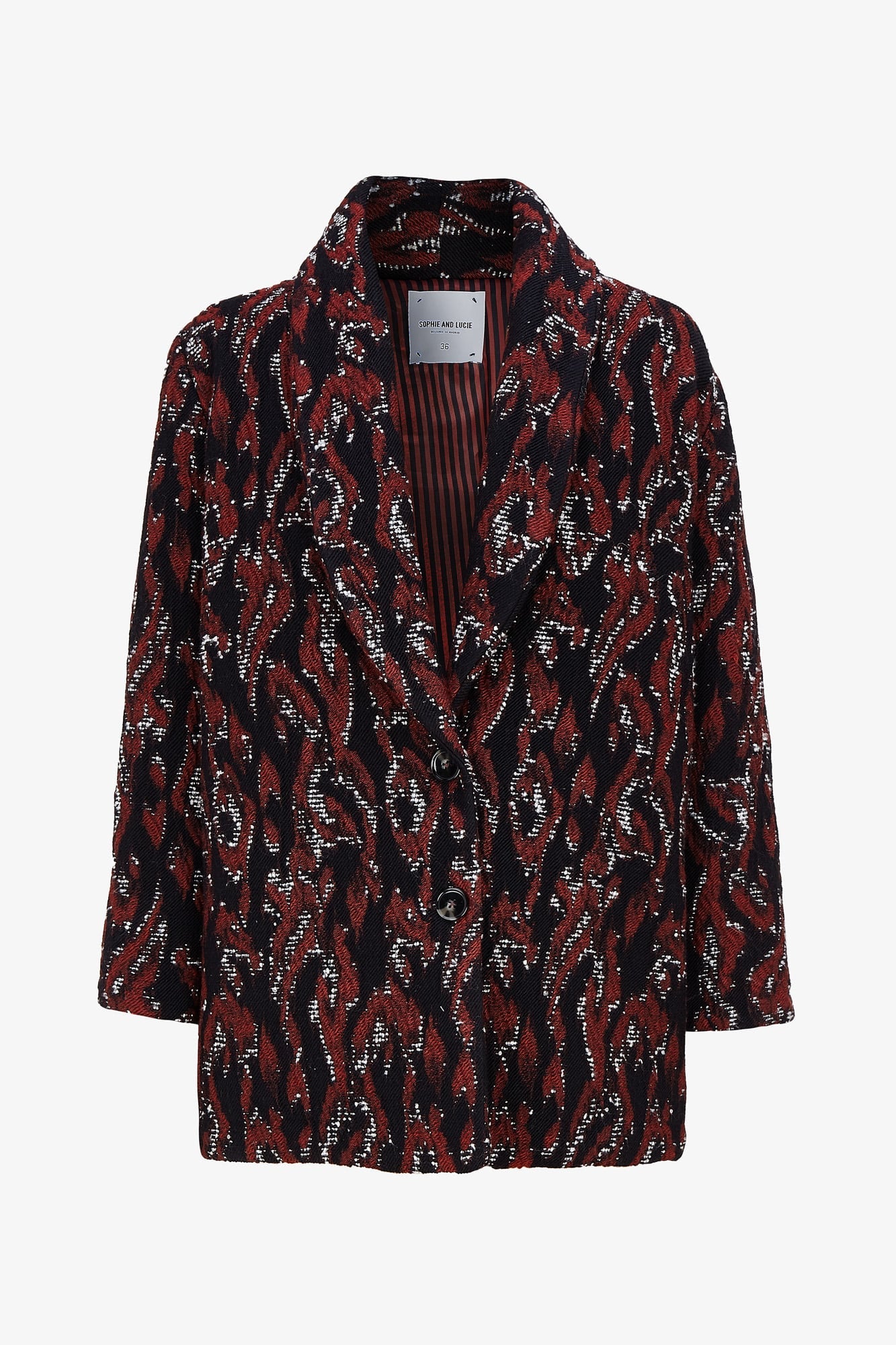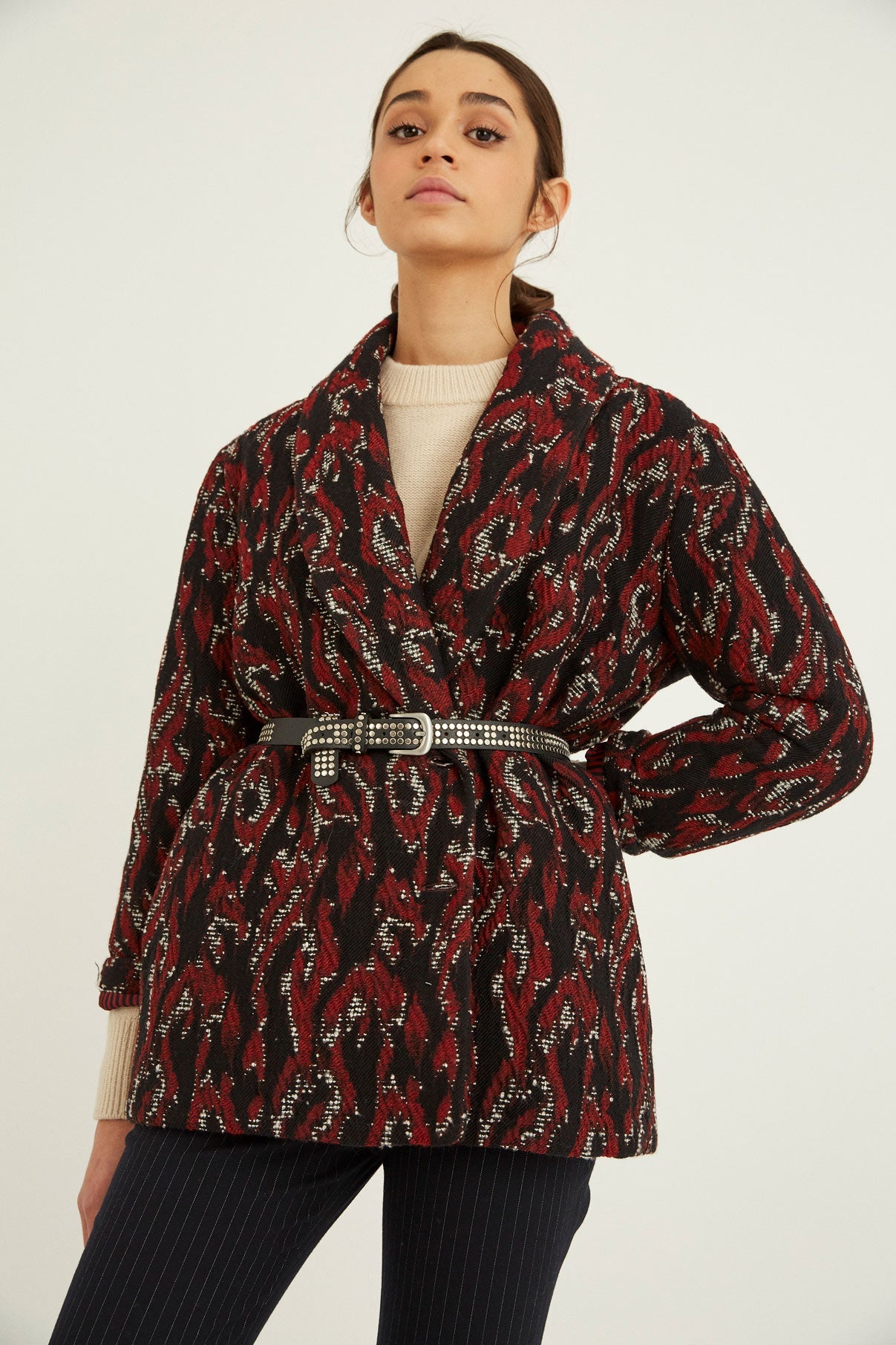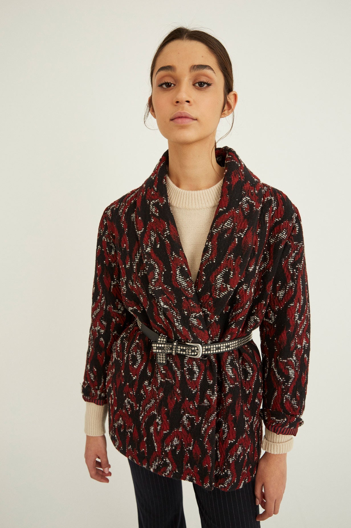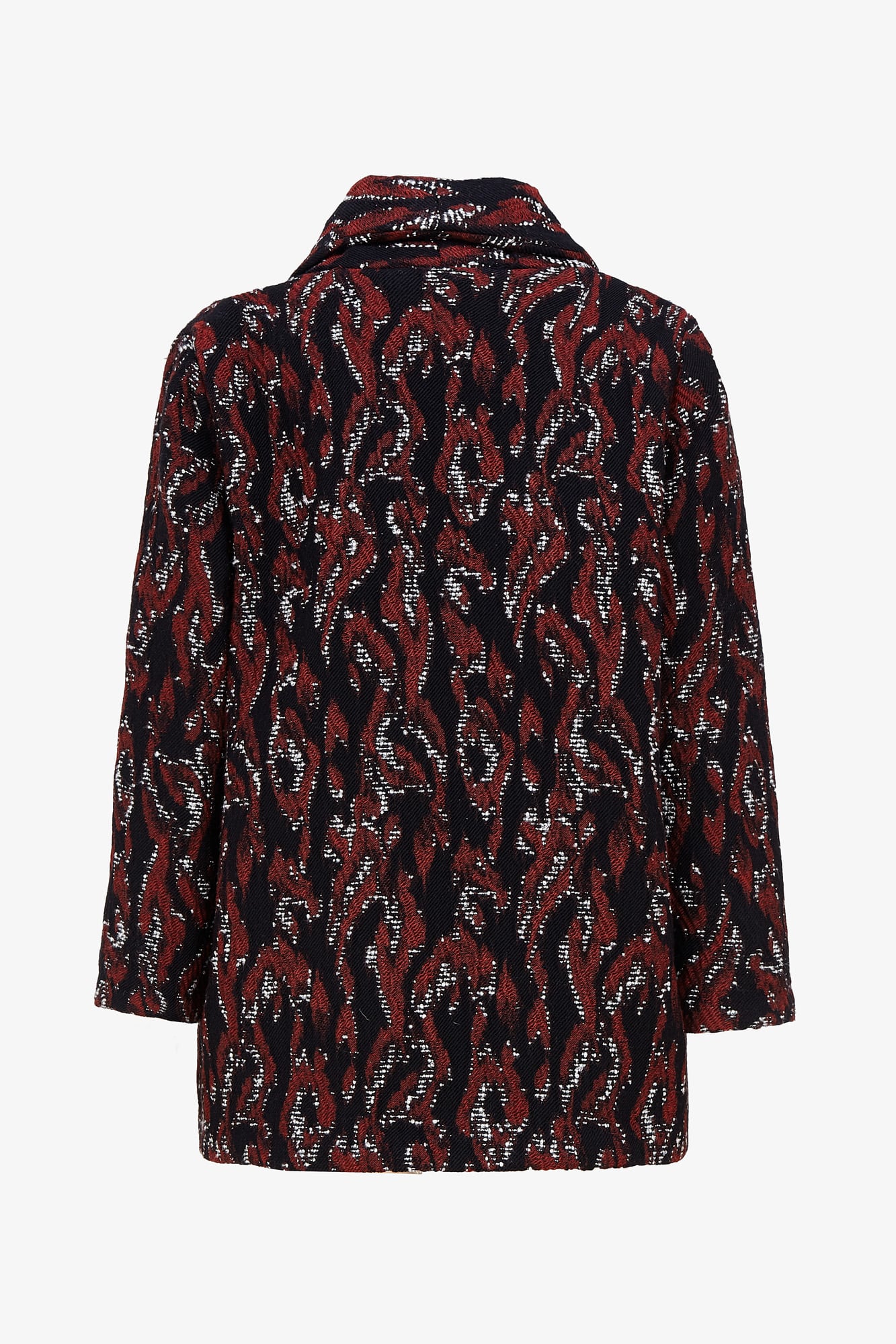 Chaqueta de manga larga confeccionada en tejido de lana estampado con cuello de solapa, cierre frontal con botones y bolsillos laterales.